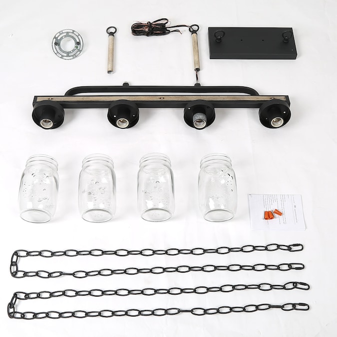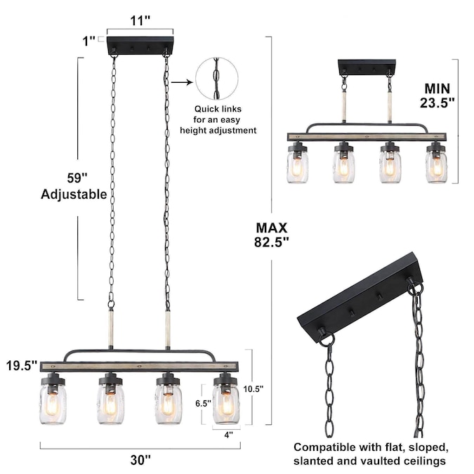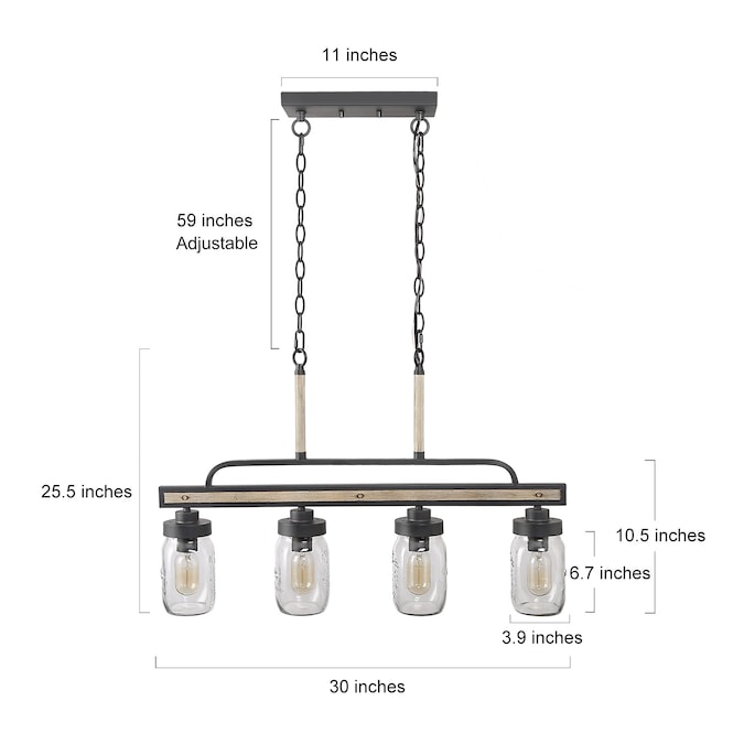 - Farmhouse mason jar lighting dimensions: 30-in x 4-in W x 10.5-in H, canopy size: 11-in L x 4.7-in W