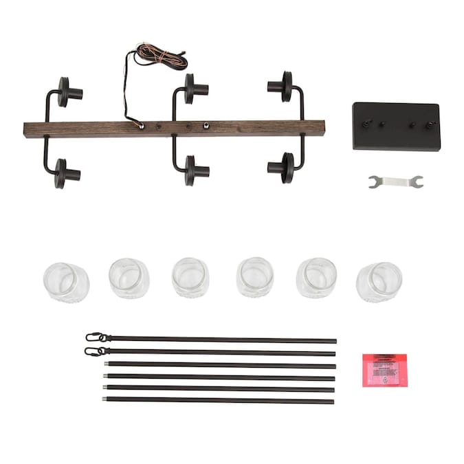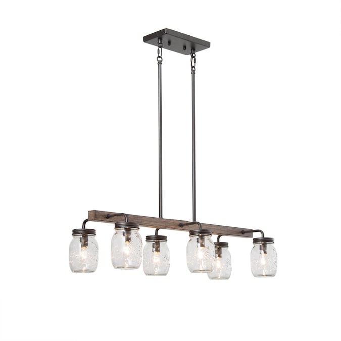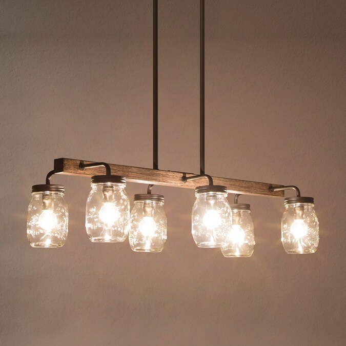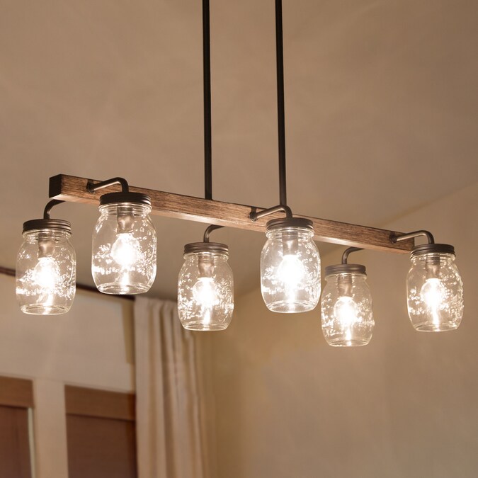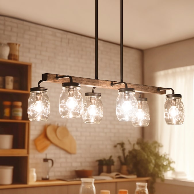 6-Light mason jar modern farmhouse chandelier, features sturdy metal construction painted in dark wood grain and dark coffee brown color, 6 clear mason jar shades arranged in parallel on both sides of the rectangle base. Clear glass mason jars and a simple linear frame give it a touch of elegance mixed with farmhouse and rustic, specially designed to illuminate the heart of modern farmhouse styled space. This dining room lighting can also be a kitchen island lighting fixture or a pool table light for your game room. This black ceiling light comes with easy installation instructions, making it hassle-free to upgrade your space!