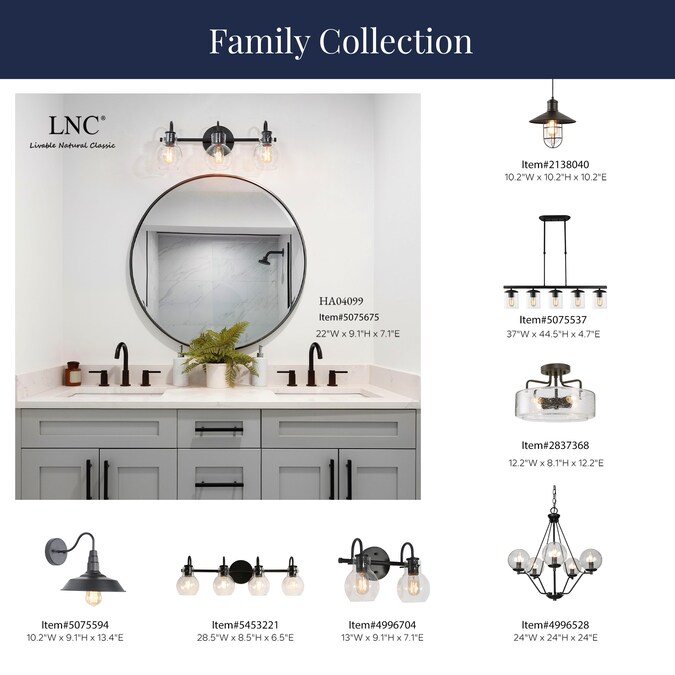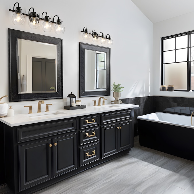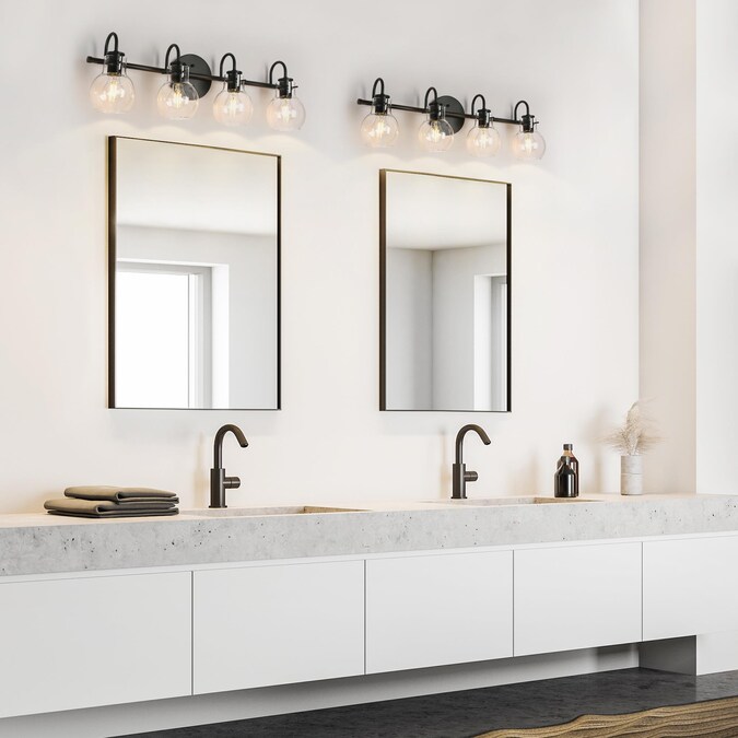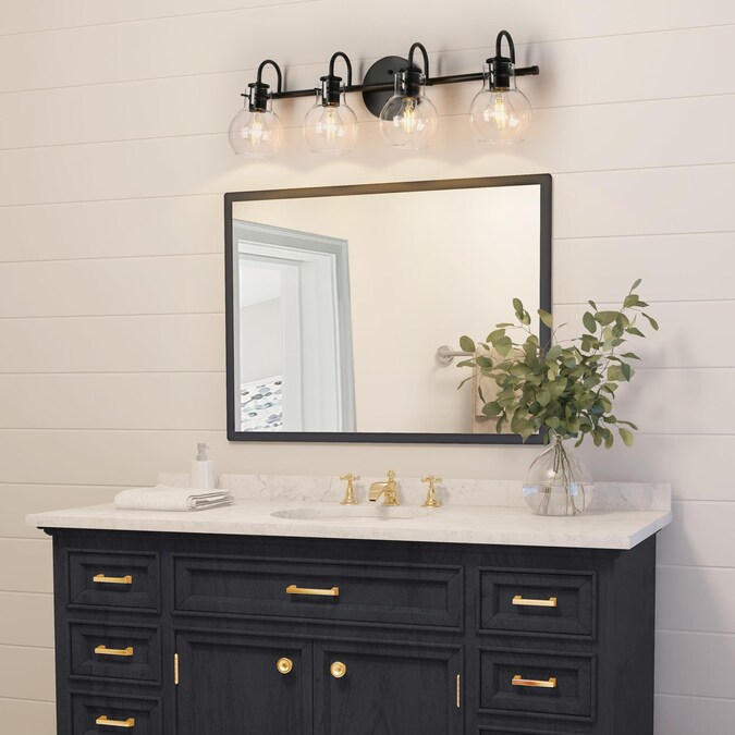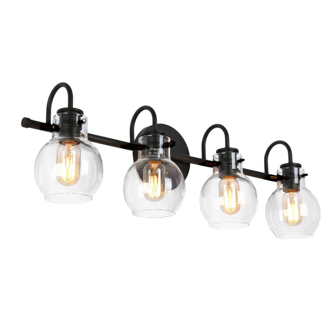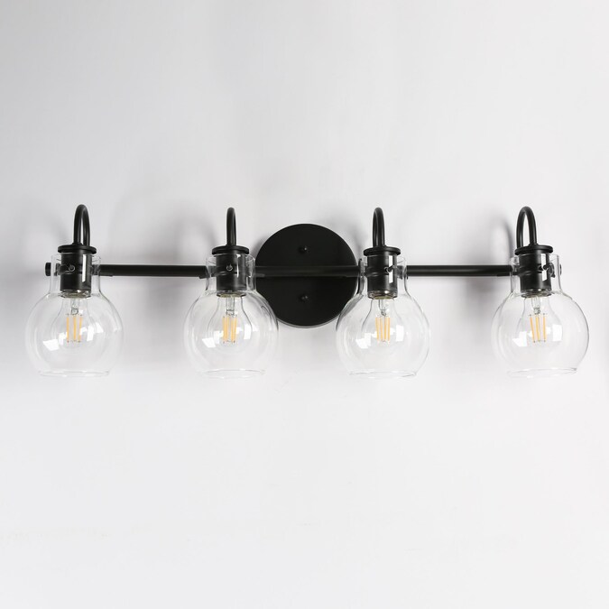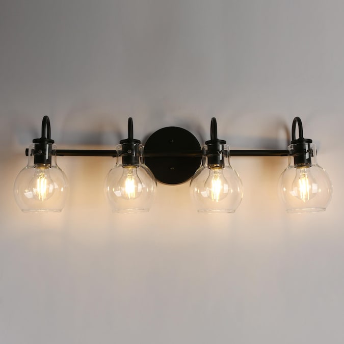 Elevate the aesthetic of your bathroom with the LNC Home Glass Black Vanity Light. This exquisite four-light bathroom vanity fixture boasts a sleek matte black finish and stunning clear glass kettle-like shades that gracefully envelop four medium-base lights, ensuring optimal light output for your vanity mirrors, vanity tops, and desired wall areas. The pure black backplate and finely curved arms lend a touch of modern sophistication to this contemporary vanity light. Designed for ambient light direction installation, this clear glass vanity light makes a bold modern statement and is an ideal choice for enhancing your home’s overall aesthetic. Experience the perfect blend of style and functionality with this exceptional vanity light.