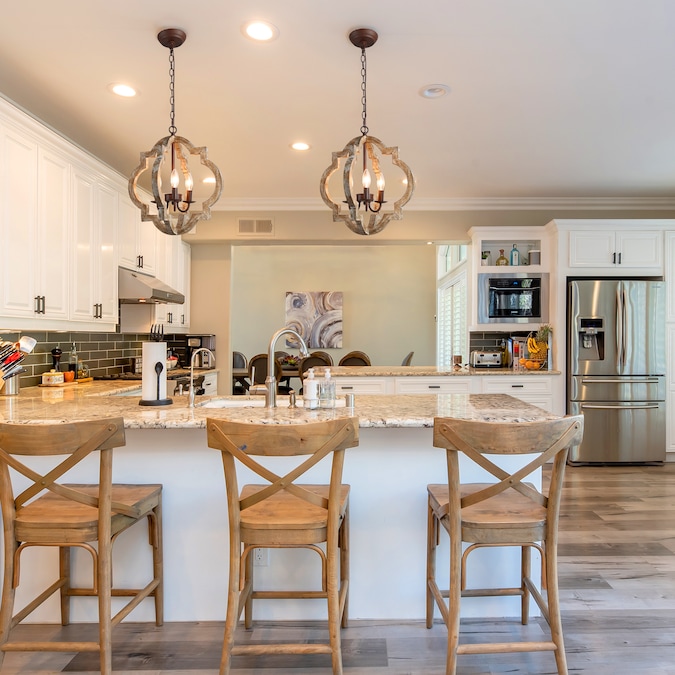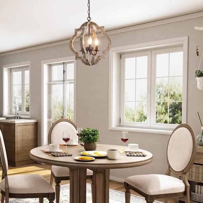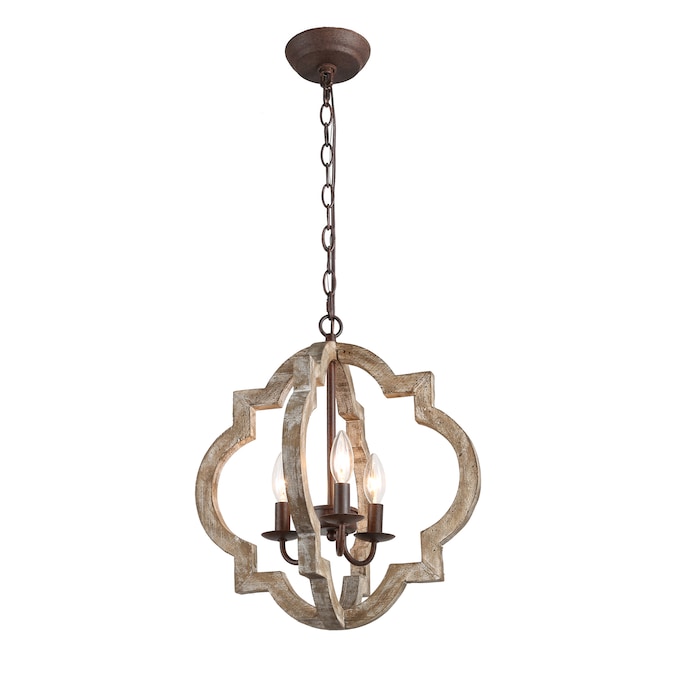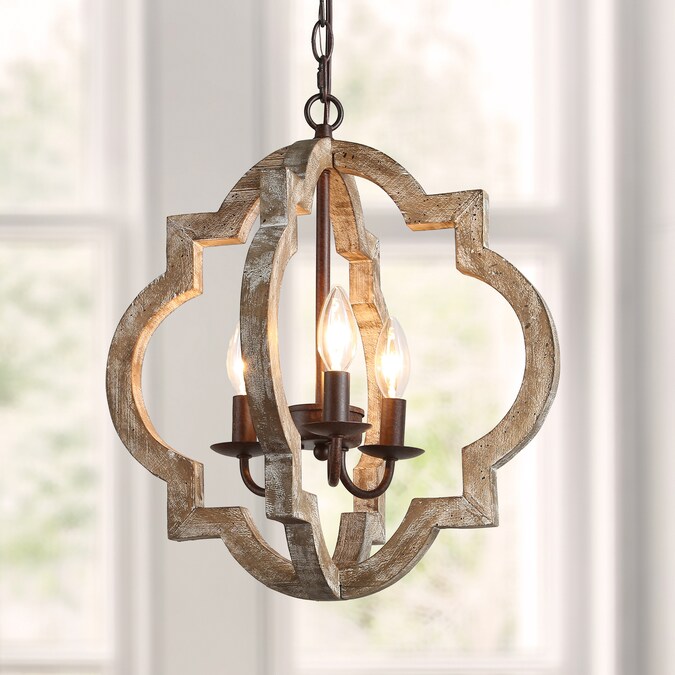 Crafted of natural pine and rubber wood in a distressed handmade wood finish, this LNC Home 3-light pendant lights features a qua trefoil-inspired open frame with a central candelabra cluster accented by wrought iron for adding strength, delivering an undeniable rustic charm. Embrace the festive season with this Christmas-ready pendant, casting a warm and inviting glow that captures the spirit of the holidays.