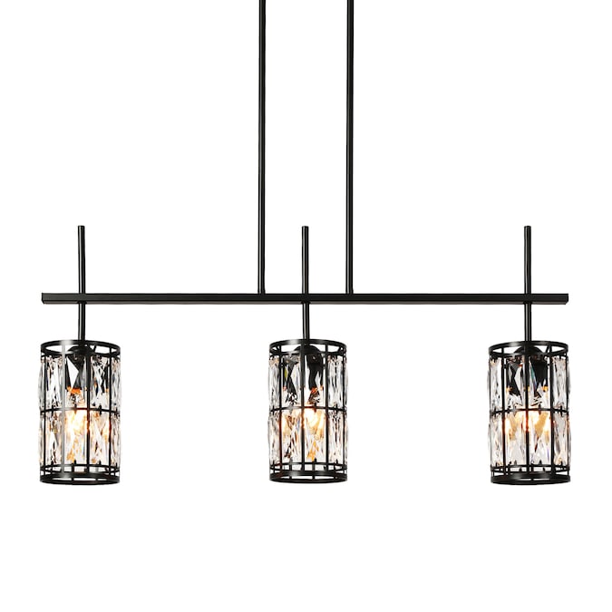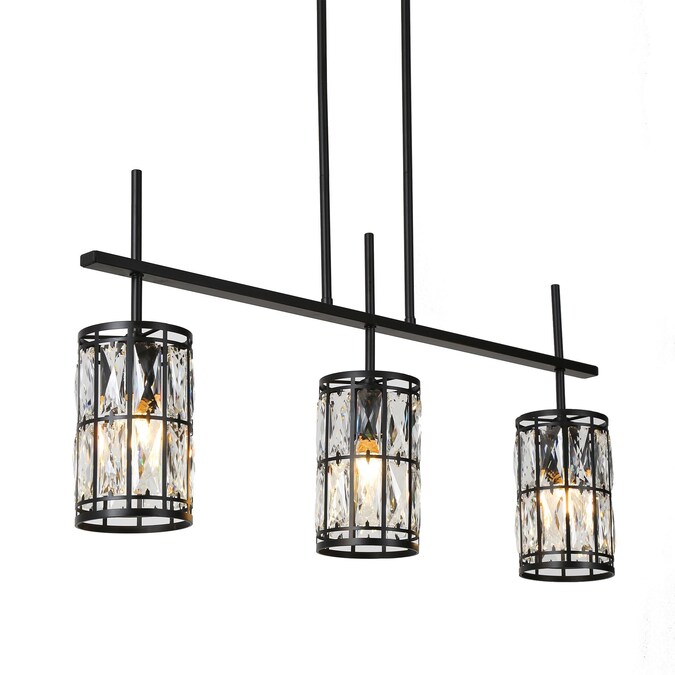 This modern, contemporary crystal chandelier features a 3-light, matte black drum-shaped design with an iron frame. The chandelier is adorned with shimmering rectangular faceted crystals that add depth and elegance to any room. The clean symmetrical lines enhance its sophisticated appeal. The warm light emanating from the crystals creates a colorful halo effect, evoking a sense of grace and beauty. Ideal for those seeking an elegant black and crystal piece, this chandelier is perfect for creating a romantic and luxurious ambiance in a kitchen island setting.