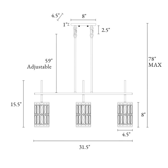 - Large modern linear 3-light chandeliers: 31.5-in L x 4.7-in W x 15.4-in H, canopy: 7.8-in L x 4.7-in W