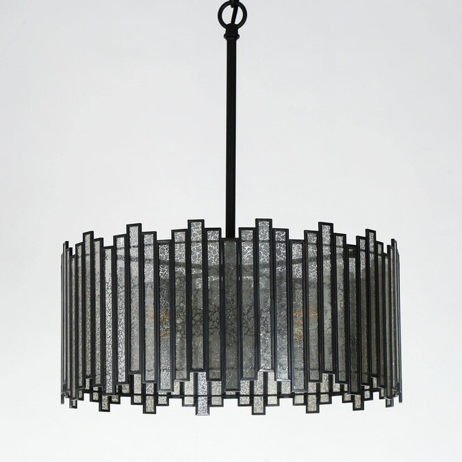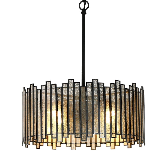 - Black dining room chandelier features drum shape irregular mercury glass shade with matte black finish