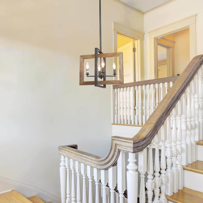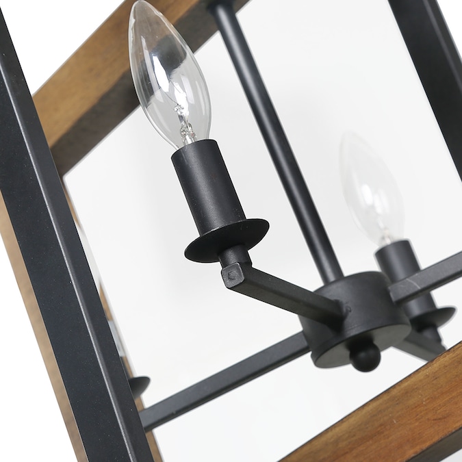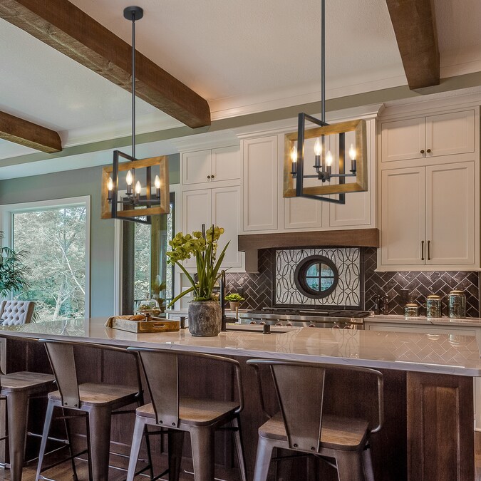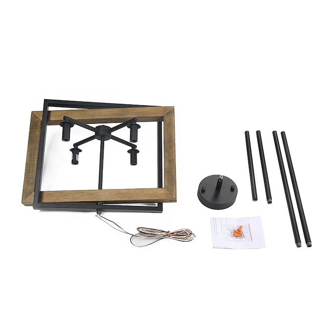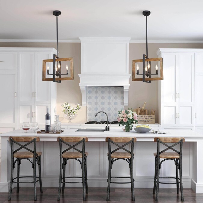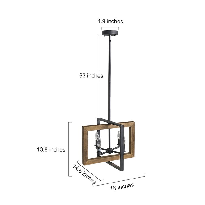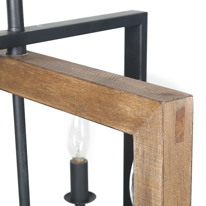 The 4-light modern farmhouse matte black and brown wood grain handcrafted wooden kitchen island lighting fixture is a perfect choice for your foyers, dining room, kitchen island, bedroom, and living room. This kitchen island pendant light is made of two rectangular frames overlapped in natural brown wood with distress effects on the surface and a hand-painted black finish. Crafted with premium materials, this captivating light fixture is of exceptional quality, reliability, and functionality. DIY enthusiasts can adjust its metal frame and wood frame to turn in different directions as needed. The crossing openwork frame is designed to cast a soft ambient light over your room, which adds rustic vintage flair to your space. The rustic collection blends wood and metal frame design trends to create its simple look, matching with a 59-in long adjustable chain for maximum flexibility. We also have a bigger one from Laius collection with 6 lights (Item #3799707) to complete your home look!