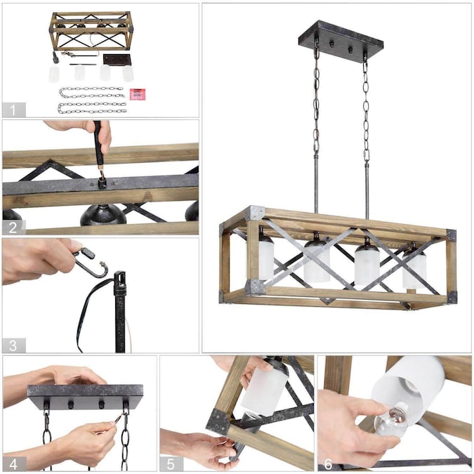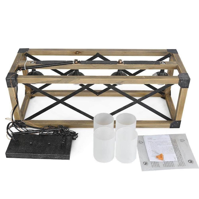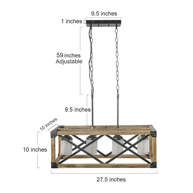 - Farmhouse wood chandelier dimension: 27.5-in W x 10-in L x 10-in H, canopy: 9.5-in L x 4.3-in W, glass shade: 3-in W, 4.3-in H
