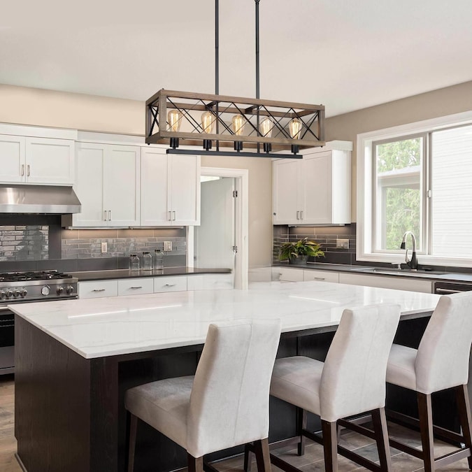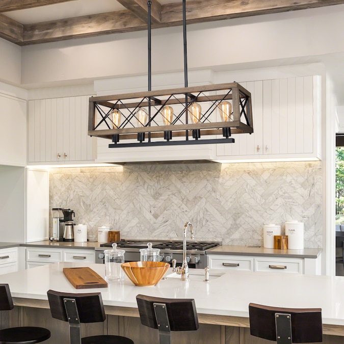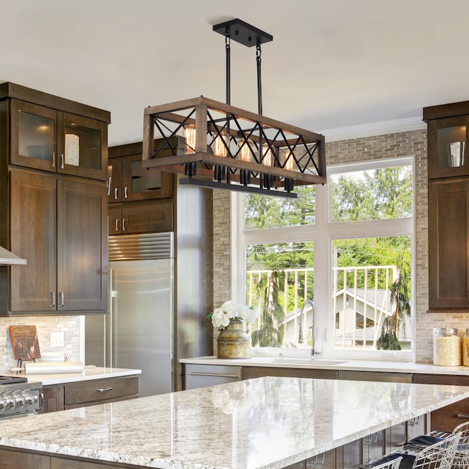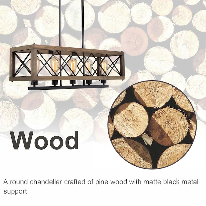 This kitchen island lighting features a brown natural wood frame with a black metal stand. Designed by “LNC lighting,” it brings vintage and elegant style, with a natural wood frame in rectangle-shaped, completed in fashion appearance to capture your eyes, combined with durable support stand in black metal. Present in front of you as a classic attractive modern farmhouse dining room pendant light equipped with five lamp holders for up light. The light is warm and comfortable, creating a romantic atmosphere for your ding room, kitchen island, living room, bedroom, foyer, and entrance.