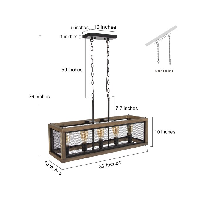 - Farmhouse linear wood pendant: 32”W x 10”D x 10”H, canopy: 5-in D x 10-in W