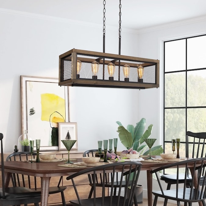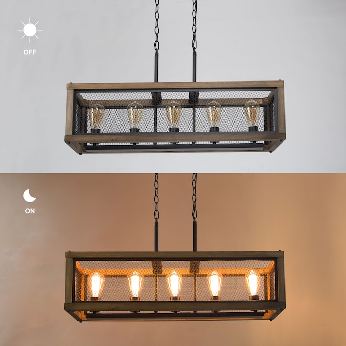 LNC 32-in wide wood rectangular modern farmhouse chandelier, the shade is a wooden frame and surrounded with matte black hollow iron piece, the middle configuration of five bulb base. It is a classic rustic lighting, also suitable for industrial style home decoration, can be placed in the kitchen island, dining table, living room, foyer and other spaces.