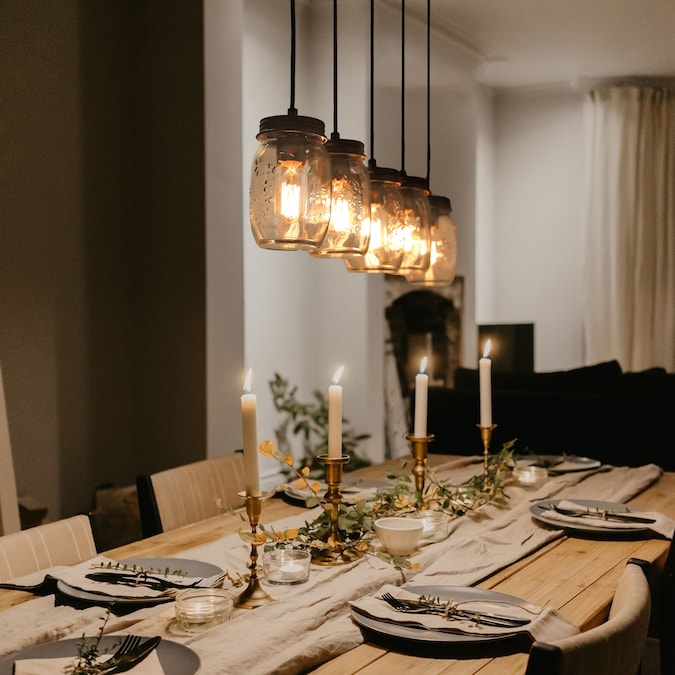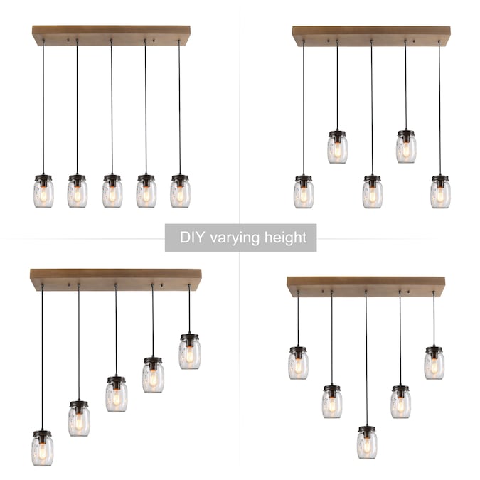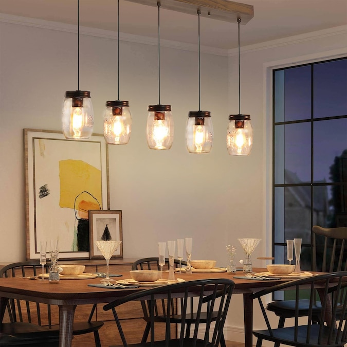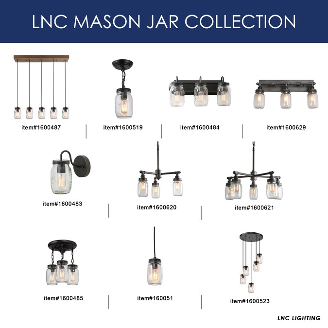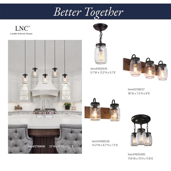 Elevate your home decor with this stunning LNC Maison collection farmhouse mason jar light. Featuring a crafted bronze and rustic wood finish, this fixture combines timeless charm with modern elegance, making it a perfect match for transitional, farmhouse decor. Each light is encased in a mason jar bottle-inspired glass shade, reducing cleaning worries. This pendant light is ideal for kitchens, dining areas, or living spaces. You can also purchase the collection’s bathroom lights(Item #2138037)to brighten your bathroom. The LNC Maison collection lights create a harmonious and warm indoor atmosphere.