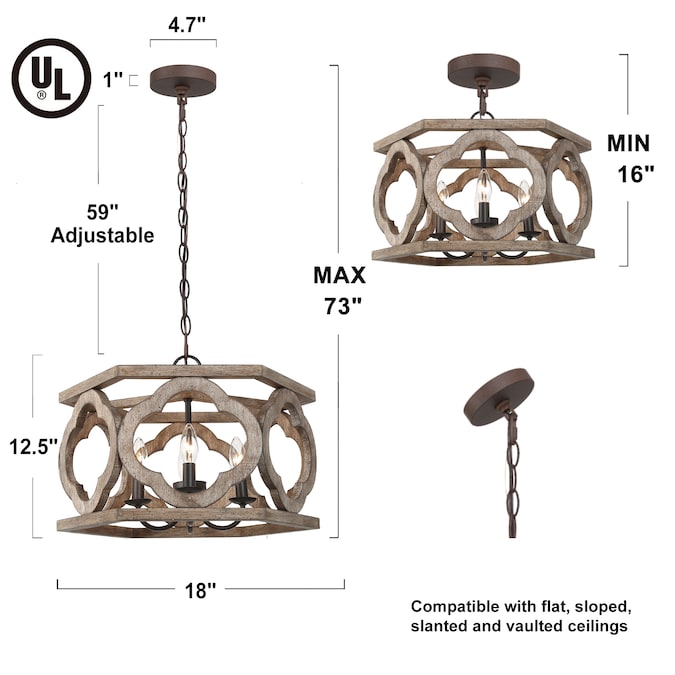 - Rustic wood chandelier is designed to work on all ceilings including flat, sloped, slanted or vaulted ceiling