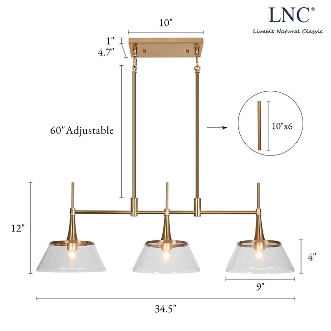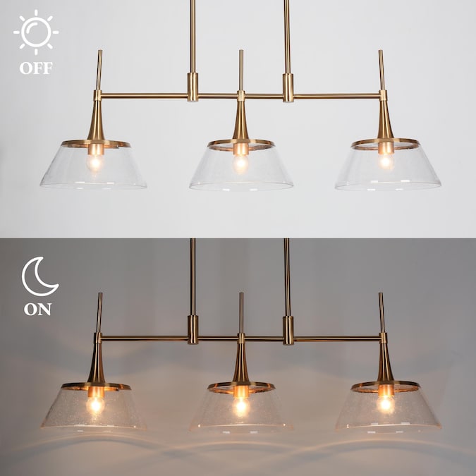 Enhance the ambiance of your kitchen or dining room with these elegant pendant lights. Our 3-light large glass pendant is designed to bring a sophisticated and luxurious look to your home. Made from durable polished gold metal and stunning seeded glass, this modern linear pendant island light is easy to maintain and clean with a dry towel or feather duster. Open bottom glass shade design enables easy access and replacement of the bulbs instead of removing the whole shade. Meanwhile, seeded glass shades create more ambient illumination than clear glass shades. With adjustable height, you can customize the lighting to suit your space perfectly. So it’s perfect for kitchen islands, dining rooms, or other areas where you want to create a warm and inviting atmosphere. With premium materials, our light fixtures are durable and long-lasting. This exquisite polished gold pendant light is designed to work on all ceilings including flat and sloped ceilings. Order now and give your home a stylish new look!