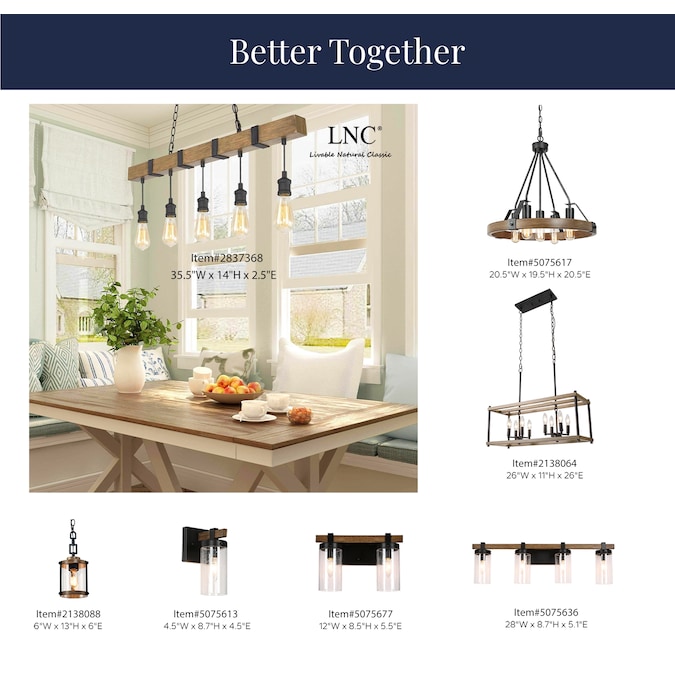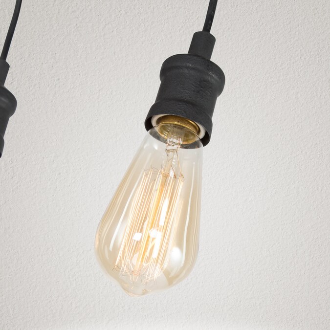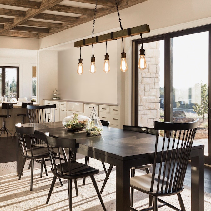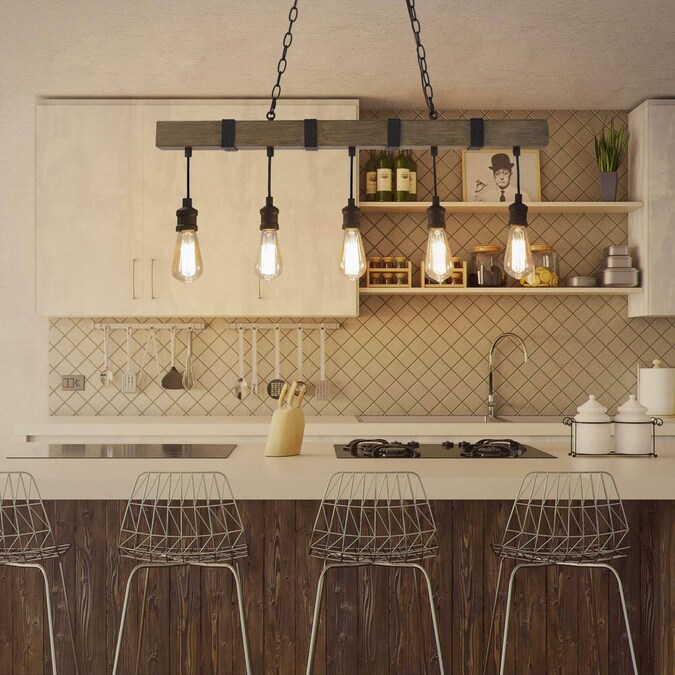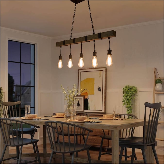 Turn on the charm in your kitchen or dining room with this 35-in W linear wire Bare bulb 5-light pendant light. It’s made of metal with a long wood grain frame that hangs down five e-E-26 medium bulbs which can be DIY with versatile bulb shapes and also for maximum ambiance, each accommodating a maximum 60W bulb (not included). This versatile light is also great for sloped ceilings. Add a dimmer switch to create just the right mood. This pendant is perfect for placing above the kitchen counter or dining table which will offer a brilliant focal point in any modern, industrial, or rustic space.