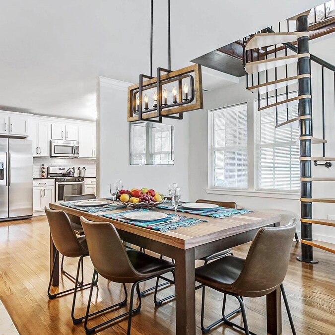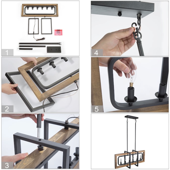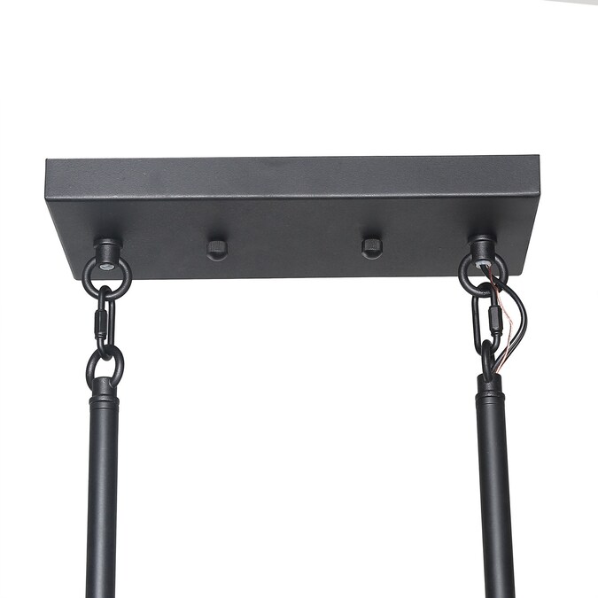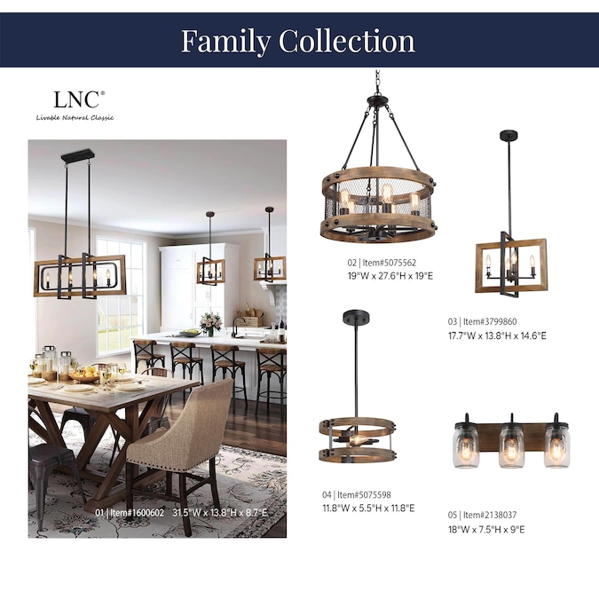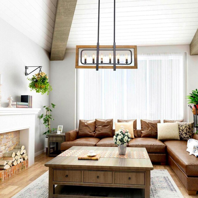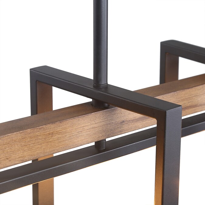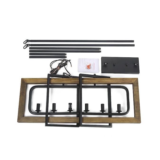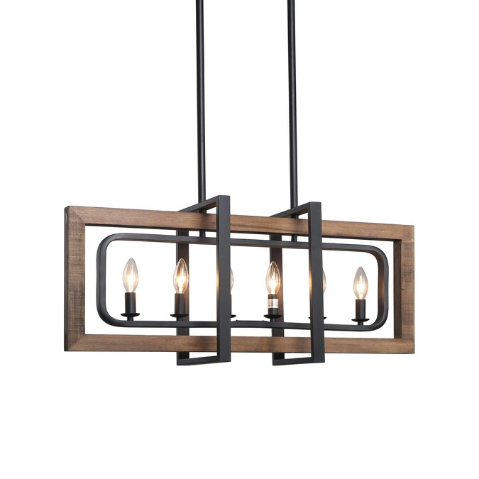 The 6-light geometric matte black modern farmhouse kitchen island lighting fixture is a perfect choice for your foyers, dining room, kitchen island, bedroom, and living room. This black farmhouse pendant light is made of four rectangular frames overlapped in natural brown wood with distress effects on the surface and a hand-painted black finish. Crafted with premium materials, this black and wood pendant light is of exceptional quality, reliability, and functionality. DIY enthusiasts can adjust its metal frame and wood frame to turn in different directions as needed. The crossing openwork frame is designed to cast a soft ambient light over your room, which adds rustic vintage flair to your space. The rustic collection blends wood and metal frame design trends to create its simple look, match with an adjustable chain for maximum flexibility. We also have a smaller one from LNC Titus collection with 4 lights pendant lighting (Item #3799860) to complete your home looking!