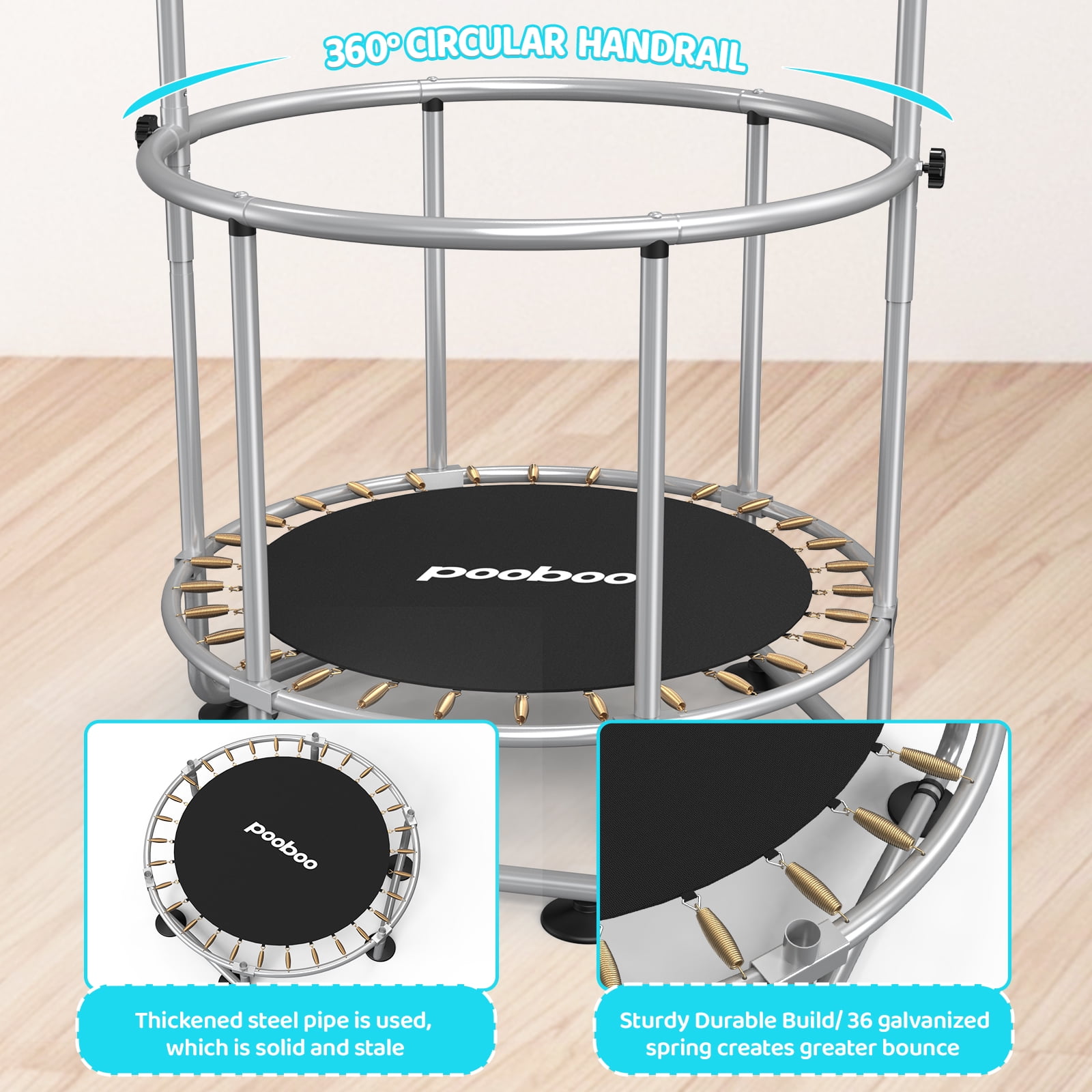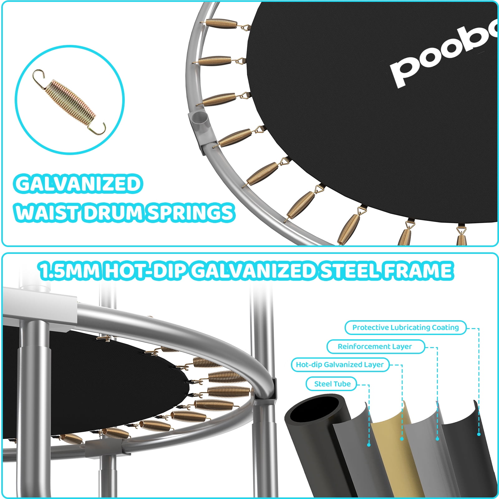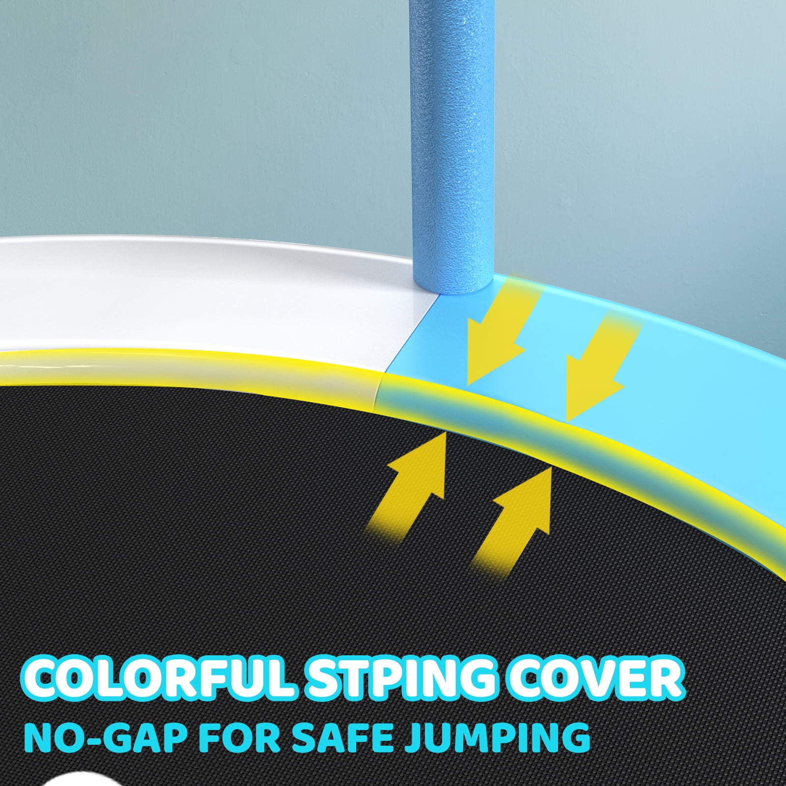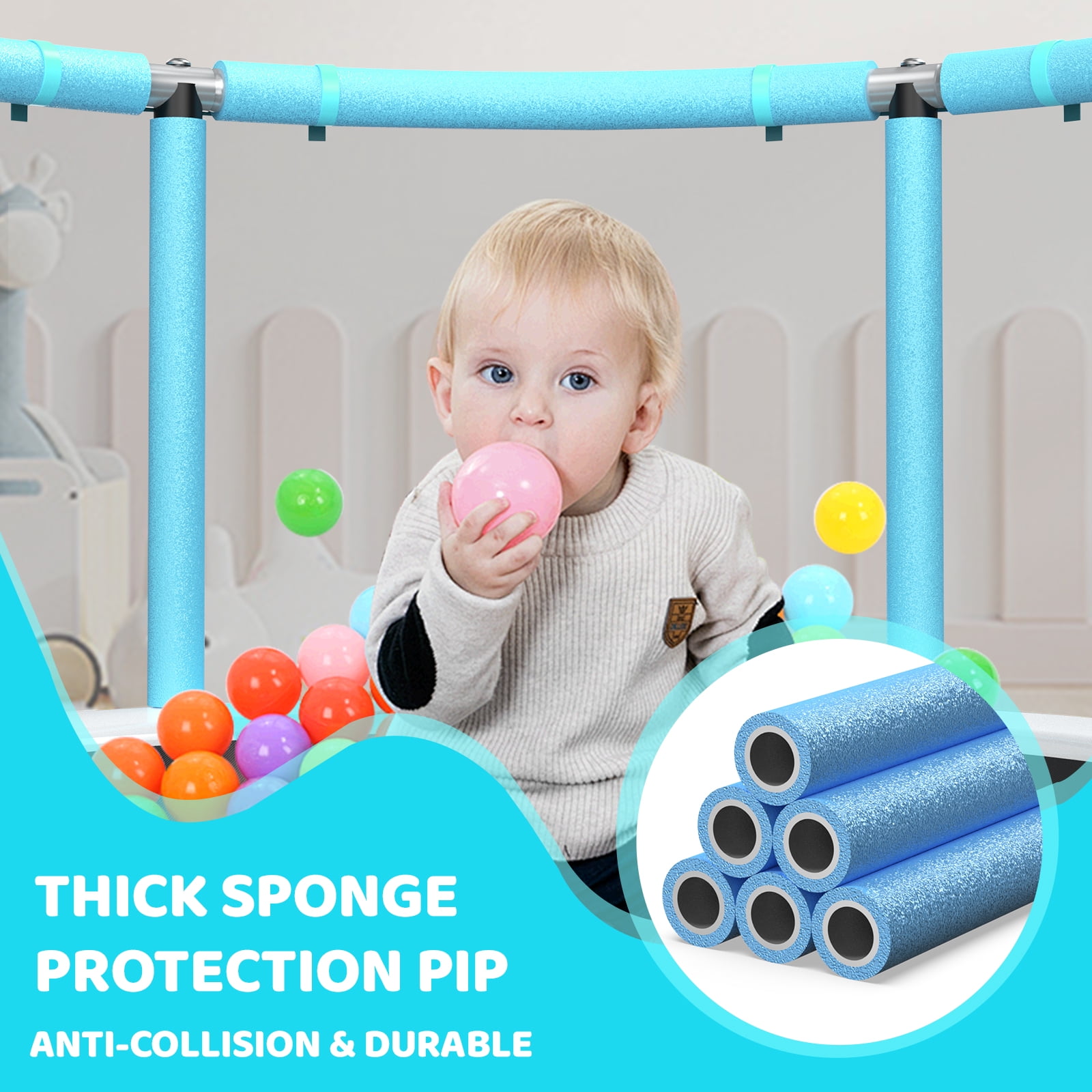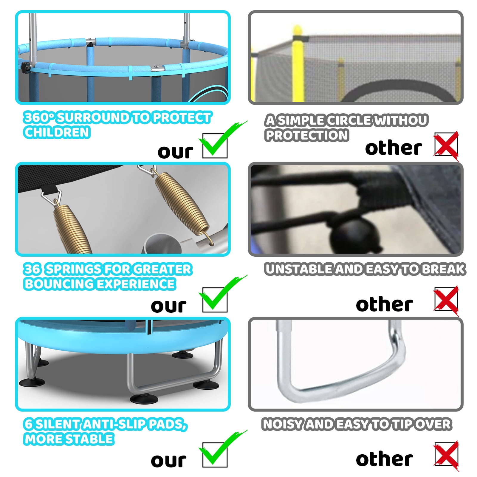 ????【Safey Design】 Lnow trampoline is equipped with a anti-UV, PE material dense enclosure net to protect you from falling when jumping, the strength is twice that of ordinary nets. With premium polypropylene jumping mat and no-gap design design completely covers the springs for safe jumping while allowing you to enjoy the fun of free jumping. Provides protection and comfort during use. ????【Excellent Bounce Performance】The kids trampoline has 36pcs heavy-duty galvanized anti-rust springs, all springs have undergone 150000 extreme extension experiments without deformation, creates great bounce to kids experience the fun of bouncing while playing. The heat treatment process improves elasticity and durability, so it will not break down after long-term jumping. ????【Providing Fun】This toddler trampoline comes with swings, basketball & hoop frame, ocean ball and hanging rings. The removable basketball hoop allows your child to enjoy shooting while jumping and enjoy swinging in their free time. The gymnastic bar comes with 2 handing rings to work on your child’s fitness and balance. The colourful ocean balls also help you train your child’s color recognition skills. ????【Stable & Strong Structure】The 60″ mini chirdren’s trampoline can accommodate up to 2 children ages 1-13 years old. 3 U-shaped legs with silent suction cups for soundless and effective floor adherence, enhance the stability and safety of the trampoline and provide all-around safety protection. ????【4 Adjustable Height】The four-level height-adjustable horizontal bar is suitable for children at different stages, and a variety of ways to play can release energy, which can be removed when not needed, and the top is provided with a safety seal for children to play with peace of mind. ????【Perfect Gift for your Child】This premium quality trampoline can be set up indoors, outdoors, or in your garden and backyard. Exercising regularly with this trampoline trainer will help to stimulate your metabolism, increase oxygen capacity, improve your balance, and boost cardiovascular health. Good ideal for parent-child time for extra fun and to help reduce screen time for children, this trampoline is a perfect gift for your kids and friends. ????【Warranty & 100% Customer Satisfation】Lifetime warranty for the main frame, no need to add your warranty time, email us, we will reply within 24 hours. For FAST Client Service Support Please Call us at +1 866-705-9098,during PST 8:00-17:00, Monday to Friday.