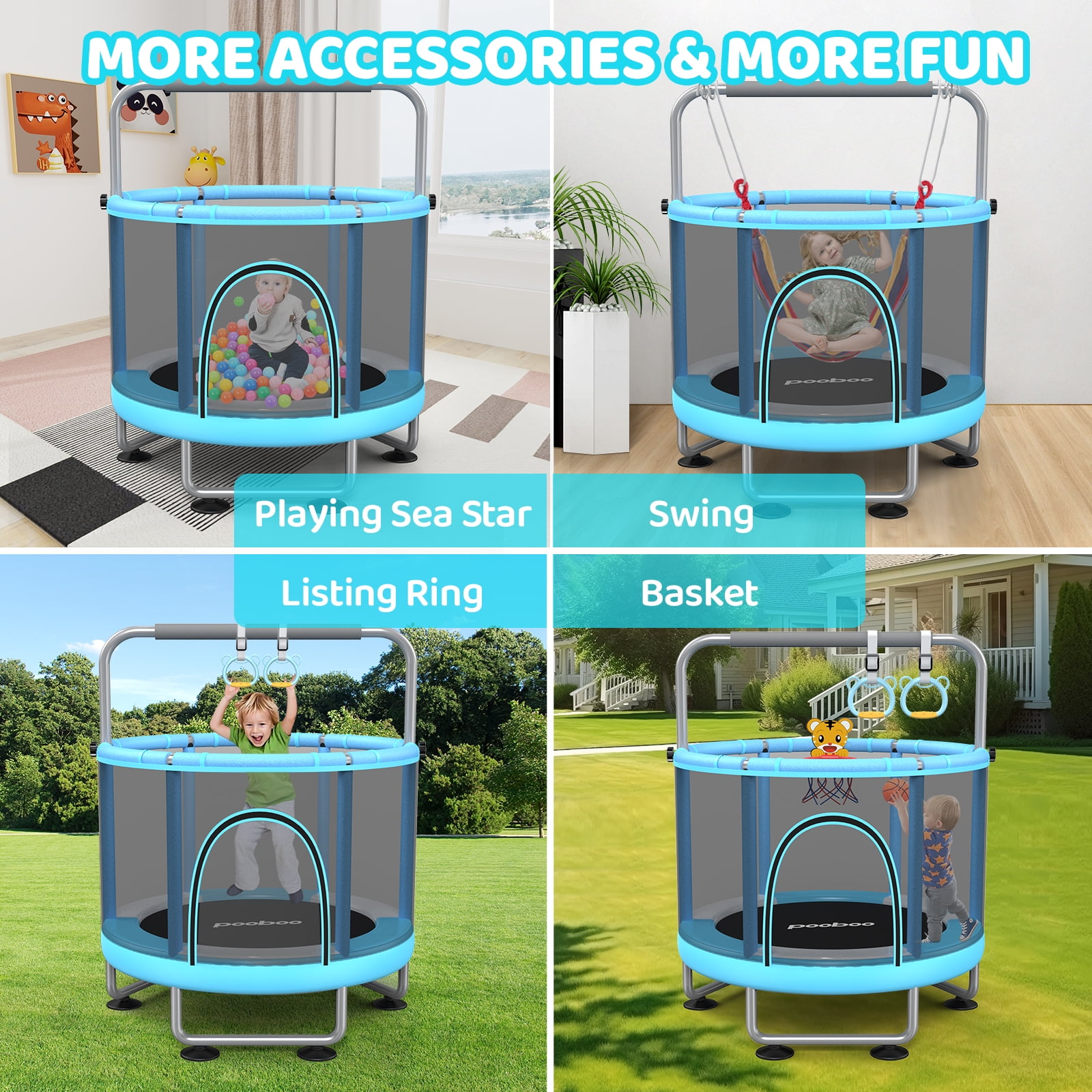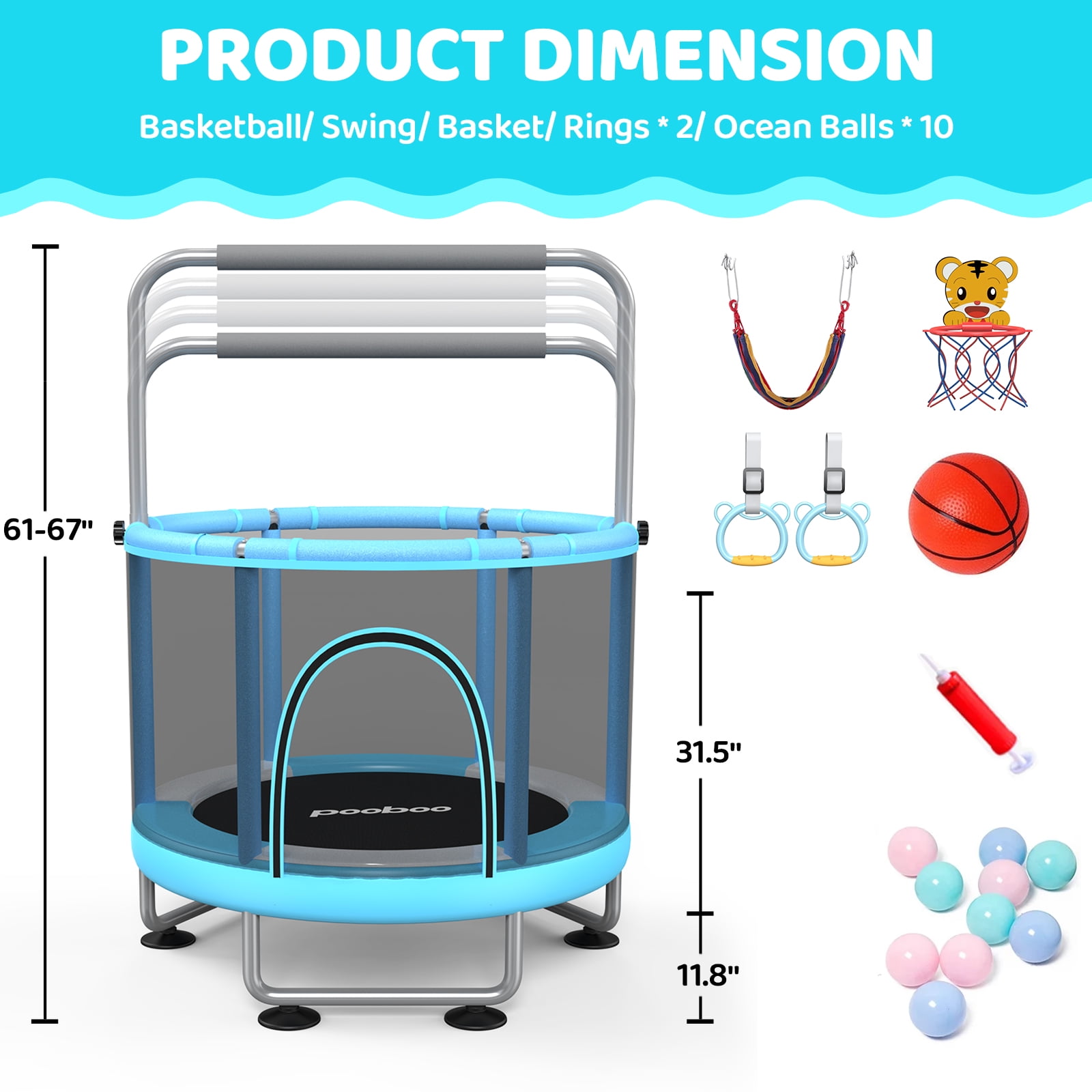 LNOW Mini Round Trampoline for Kids with Swing, 60” Indoor Outdoor Toddler Small Trampoline with Enclosure Net, Basketball Hoop, Adjustable Gymnastics Bars, Ocean Balls, Gift for Boys Girls, 450lbs