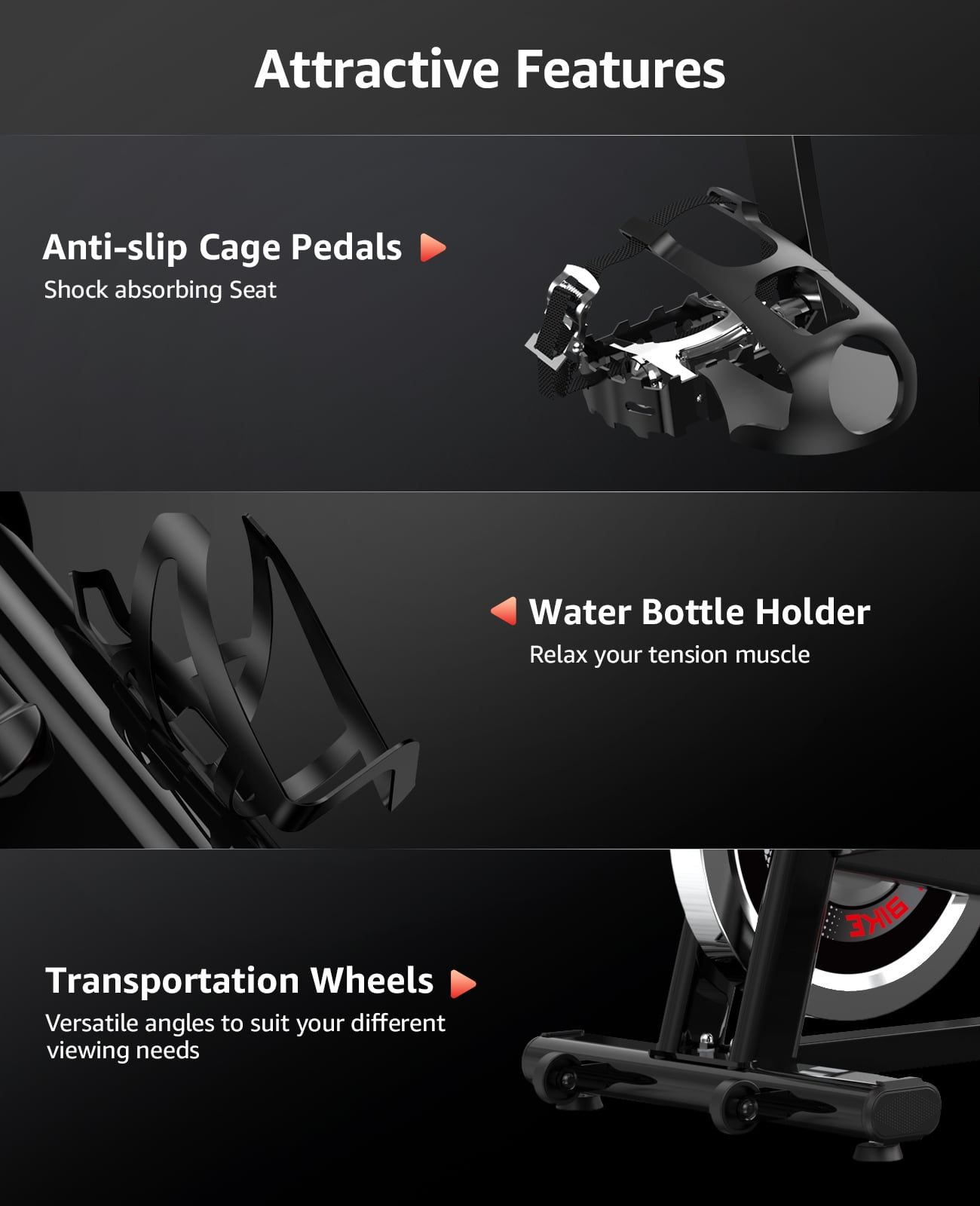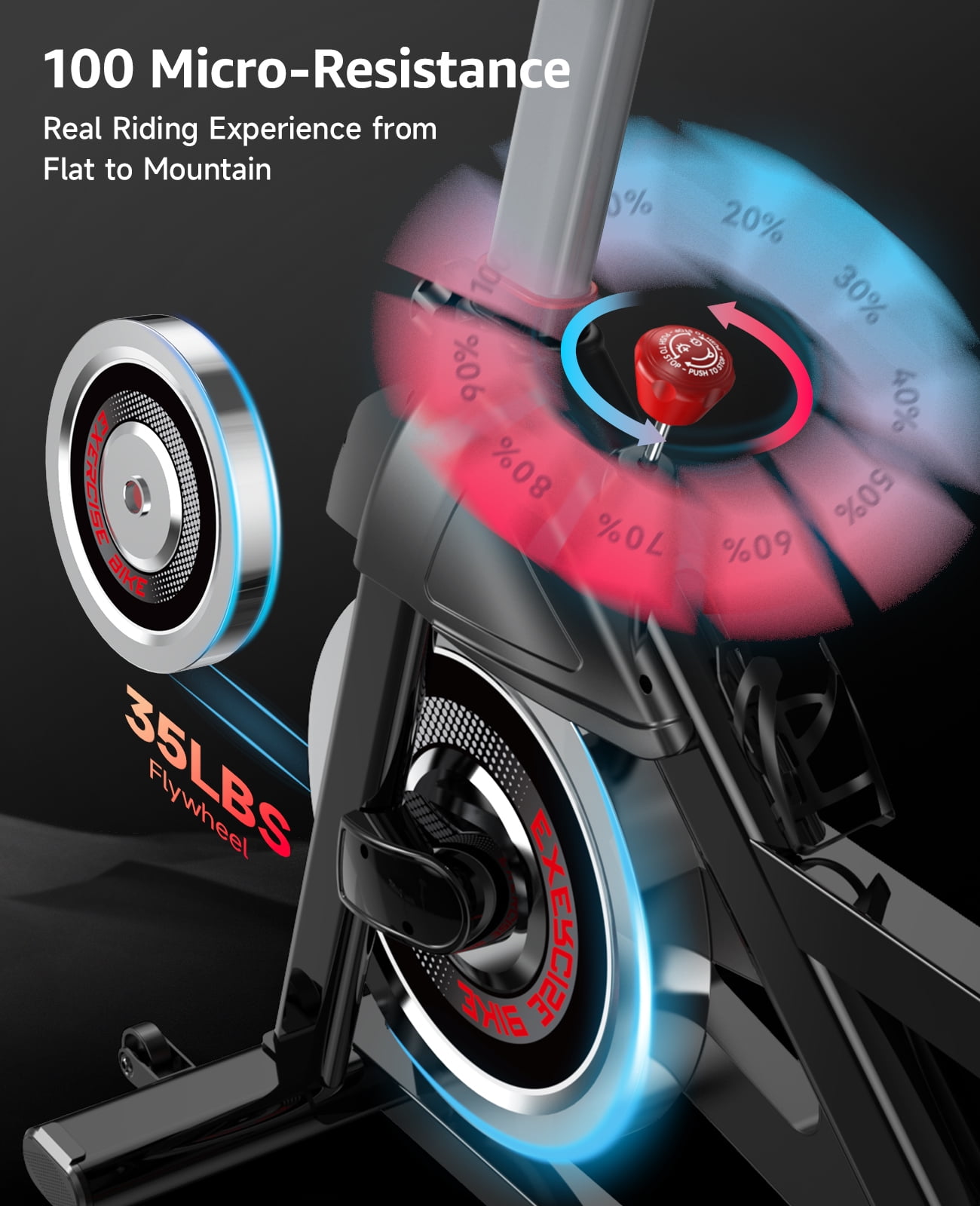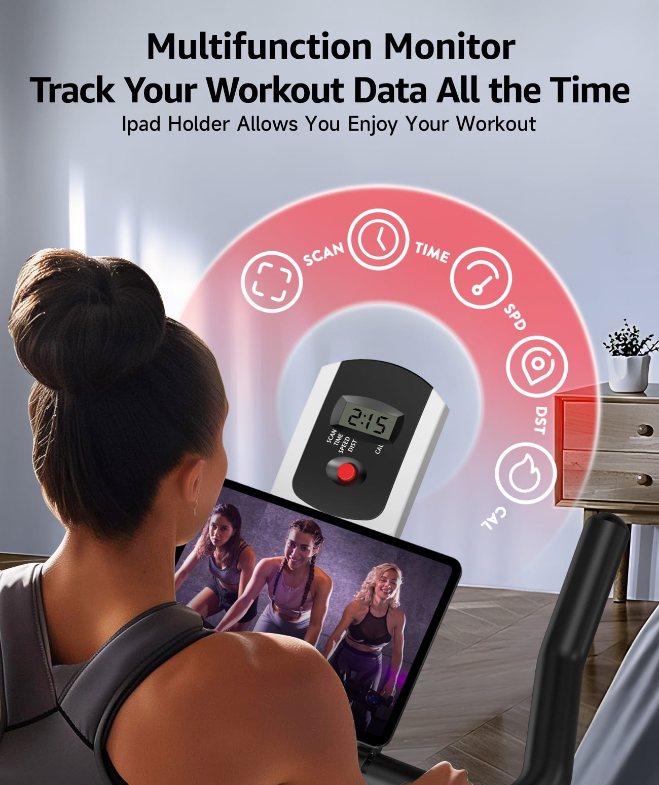 【2025 New Version & Free Bluetooth Device】According to customer’s response, our exercise bike had been updated the whole accessories, big sales price with high quality, it worth to have! If you need the bluetooth device, pls contact us from the customer email address or customer message, we will reply within 24 hours. 【High-Quality Indoor Cycling Exercise Bikes】According to the statistics that white heavy-duty steel frame of the exercise bike more preservative than black frame.The belt driven system provides a smoother and quieter ride than chain transport. It won’t disturb neighbors or sleeping kids.Double Triangular Structure smoother and stabler. Maxium Weight: 350lb 【Upgrade Adjustable Seat and Handlebar 】The cardio workout indoor cycle exercise bicycles has lengthened armrests and seat risers can meet the height needs of most people and cycling postures. Turnning resistance knob to adjust your cardio workout level freely.large range of resistance give users a comfortable indoor riding experience. Workout your muscles / lose weight / enhance heart /lung function. 【Safe to cycle】Adjustable pedal straps fits different size feet and keep your feet from slipping off. Pls note: left pedal tightens on counterclockwise, and right pedal tightens on clockwise. Easy to move around with two front transportation wheels. A bottle holder for you to replenish water in time.All parts are protected and your little baby can’t reach them. 【LCD Monitor & Gift iPad Holder】Track your riding time, speed, distance, calories you burned and riding odometers. The Ipad holder makes you enjoy exercising fitness class or movie at the same time, making it easier to keep exercising for long time. 【Personalized Fit Exercise Bike】Best choice for you and gifts,meets the needs of beginners to professionals 【Warranty&Customer Service】ONE YEAR FREE parts replacement. Online instruction video can help you complete the assembly within 30 minutes,any problems will be reply within 24 hours, 100% satisfied customer service.