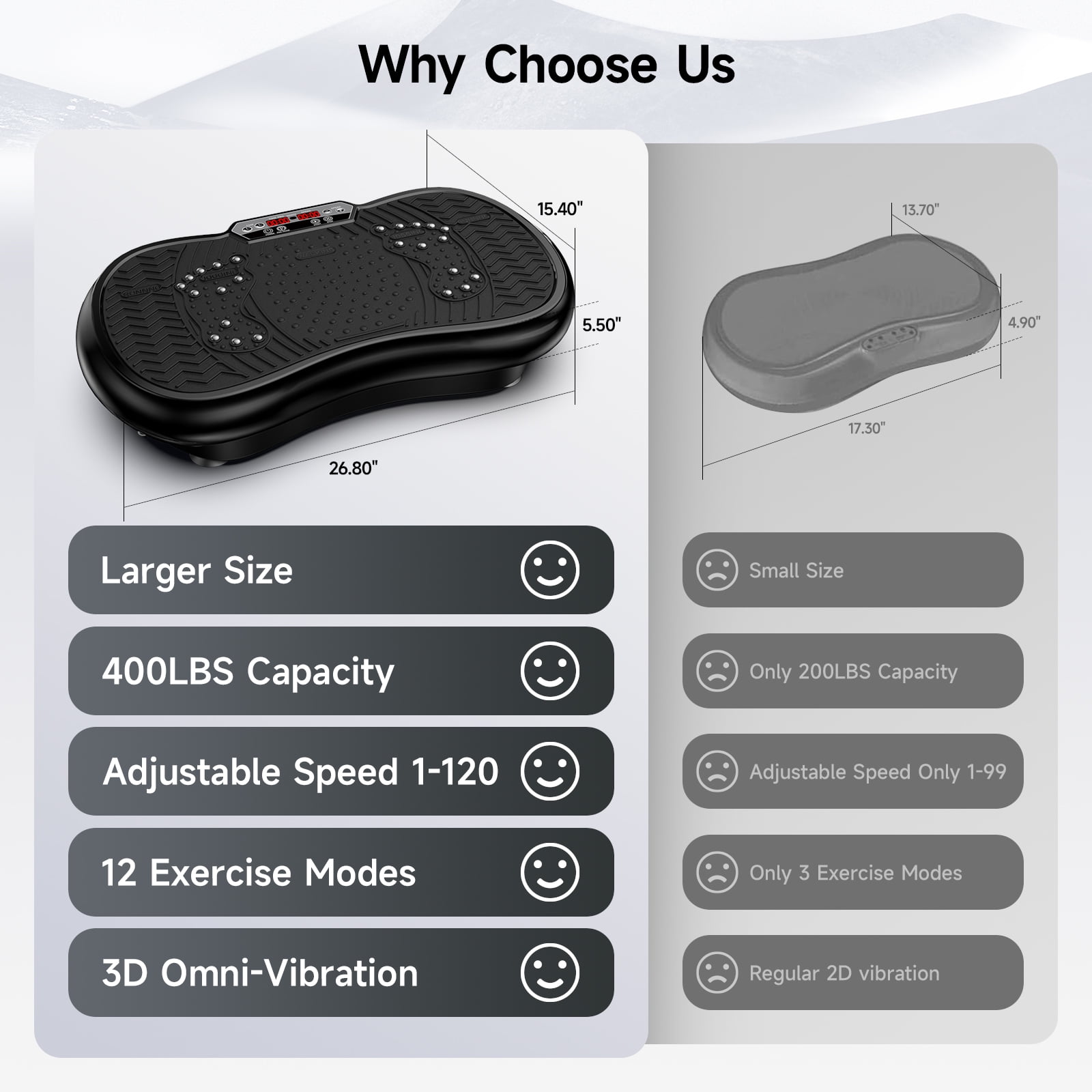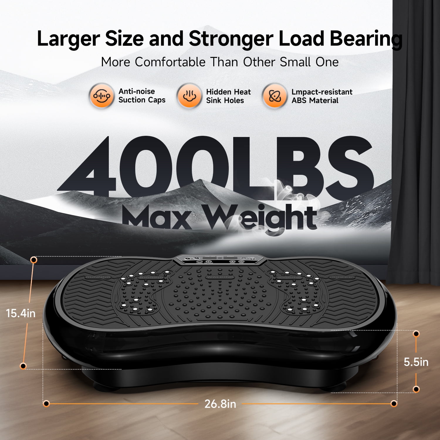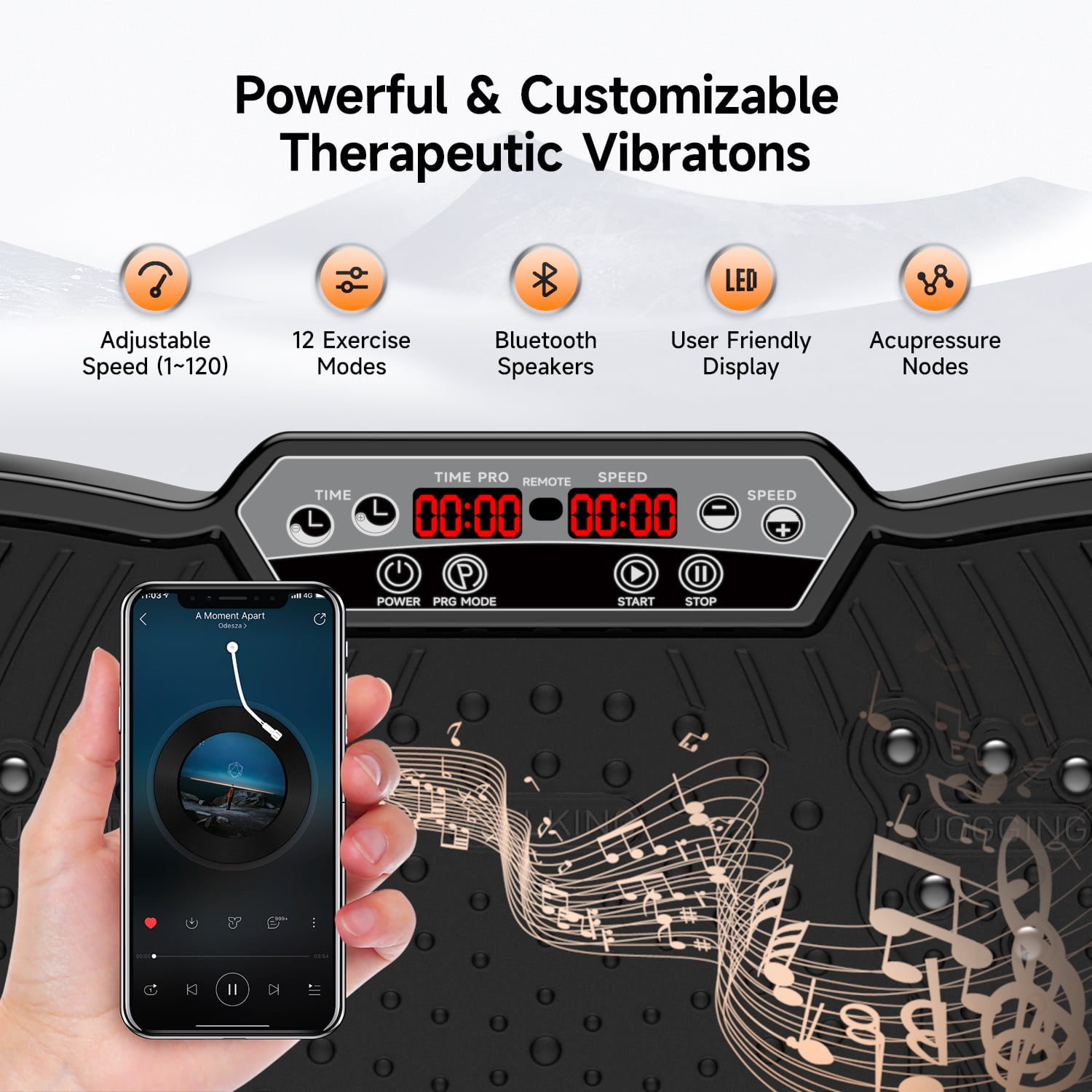 ✅【BUILD YOUR DREAM BODY】 Jump on your vibrating exercise machine to instantly sculpt your ideal body!The system creates a full-body vibration that stimulates muscles – causing extra muscle contraction and increased activation.This kind of machine helps in maintaining reflex reactions, thus burning calories and fat.It can helps your body process fat many times faster than running. ✅【RELIEF, REHABILITATION & REPAIR】The LNOW vibration plate delivers efficient and gentle Whole Body Vibrations, waking muscles throughout the body and increasing blood flow in the muscles. This enhances your body’s built-in ability to regenerate cells and repair itself. Relief is felt from the first use, continued and regular use builds up muscle tone, protecting nerves and bones, relieving chronic pain, repairing old injuries, and providing greater range of motion. ✅【RICH FUNCTIONAL & HIGH EFFICIENT& REMOTE CONTROL】Adjustable vibration speed (1 to 120), with 2 resistance workout bands, can exercise upper body and lower body at the same time. Offering variety of exercise modes, allow you to try different vibration exercises, With this workout machine, you can have your routine exercise done in only 10 minutes everyday. What you’ll get is a better shape and enhanced metabolism, increased bone mineral density, relieve and reduce stress levels. ✅【WHY WE CHOOSE LNOW VIBRATION PLATE】 Can be connected to phone via BT and used as BT speaker; Magnet health massage function; LED display shows time, speed and burnt fat making your workout visible; Compact size can be used anywhere & easy to carry and store; Anti-slip coating designed;Enhanced upgraded Ergonomic design shell ensures more durability and stability; Comes with Remote control ,Resistance Bands and detailed manual…everything you need. ✅【SUPERIOR QUALITY 100% SATISFACTION GUARANTEE】 Our products are manufactured by the top professional factory, each product has been rigorously tested. you can enjoy our vibration plate and resistance bands absolutely risk-free. LNOW’s mission is to develop premium & safe home exercise equipment to help you lead a healthier & better lifestyle with 100% customer satisfaction. If you got any problems, just contact the seller first in Email,we will give you a satisfactory solution.