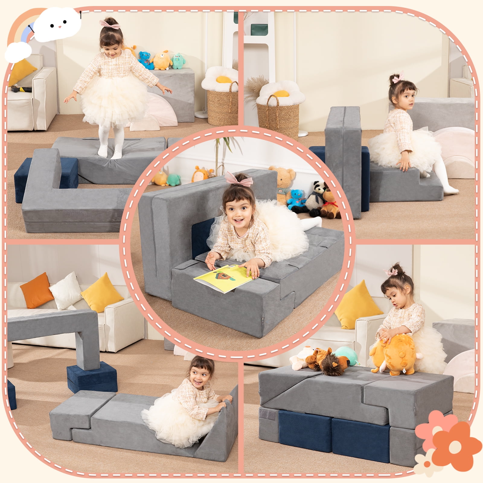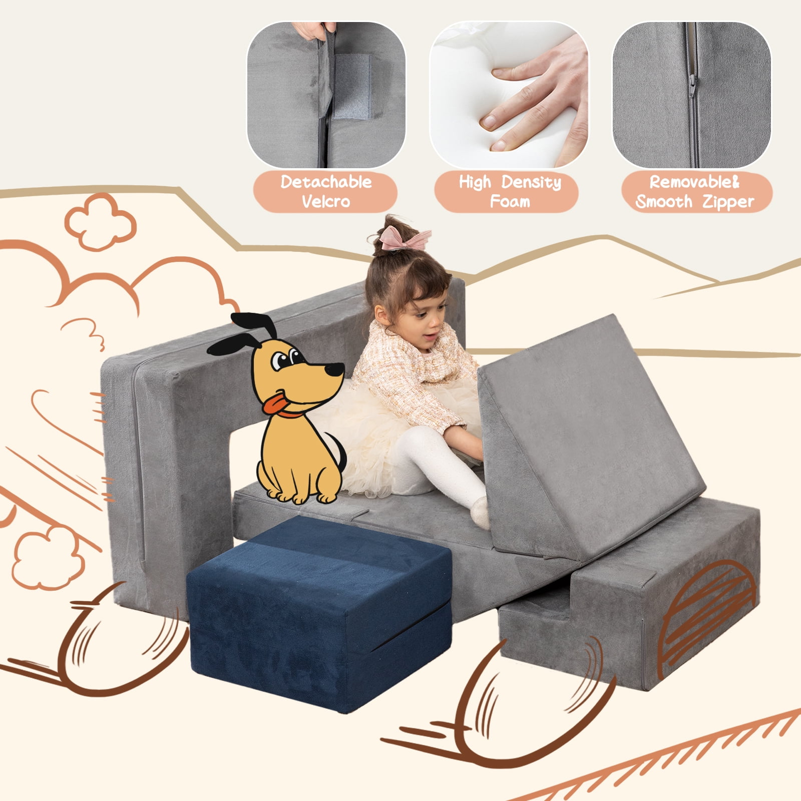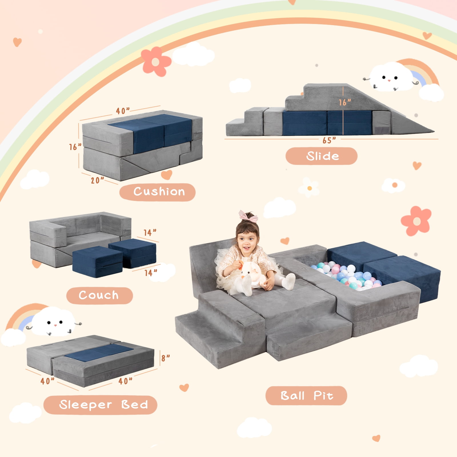 LOAOL 3-in-1 Convertible Play Couch for Playroom, Kids Play Sofa Child Loveseat, Step and Slide Climber Crawl (Grey & Blue)