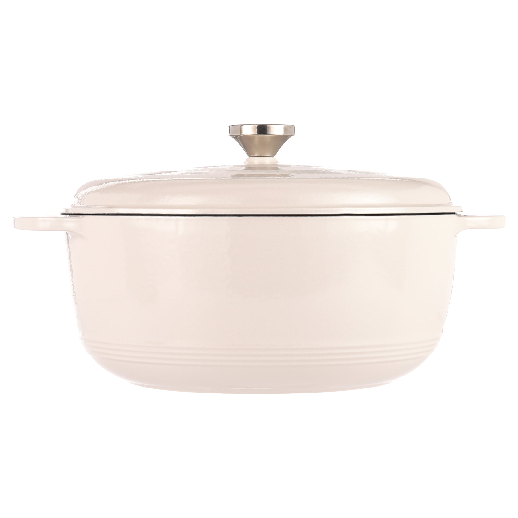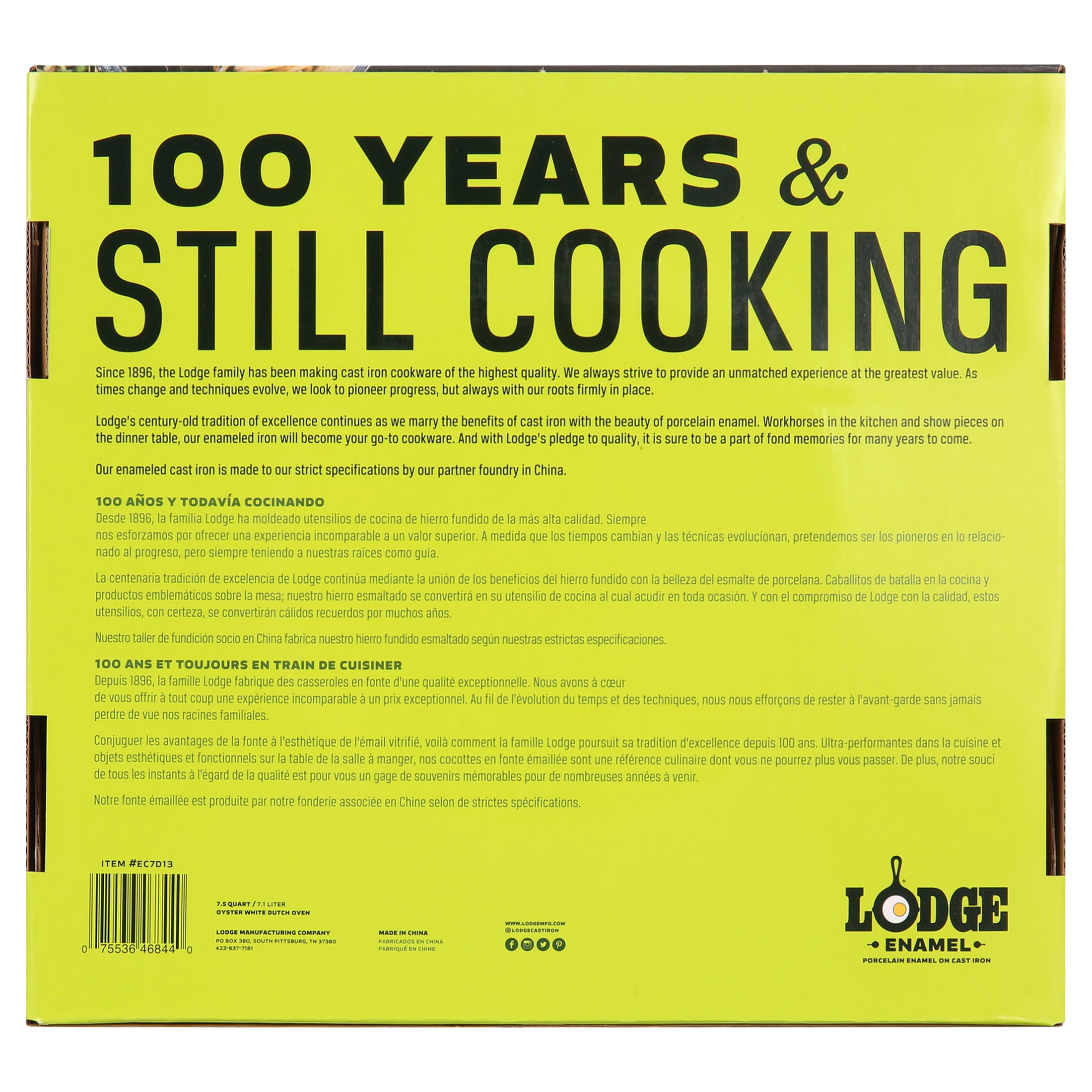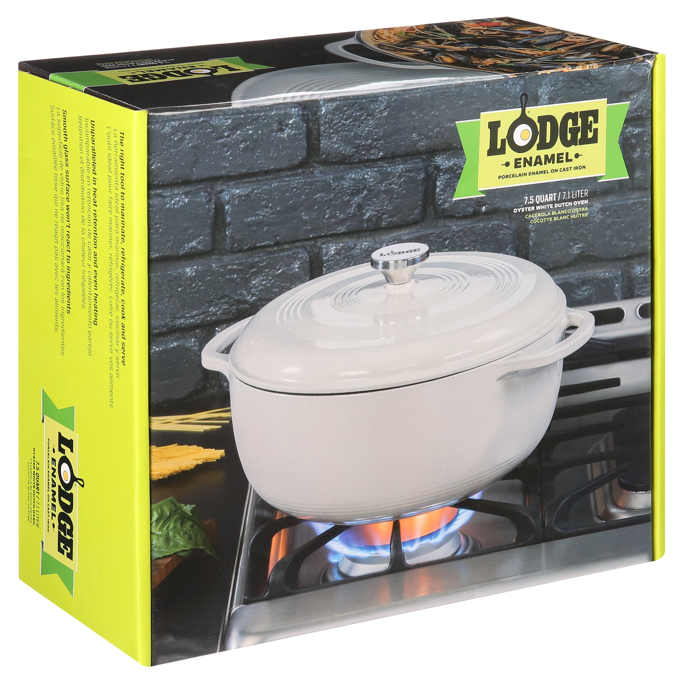 Lodge 7.5 quart enameled cast iron dutch oven in oyster Oven safe up to 500 degrees Fahrenheit Stainless steel knob and loop handles for great control Smooth enameled surface won’t react to ingredient Unparalleled heat retention and even heating Use to marinate, refrigerate, cook, and serve Easy to clean enameled surface Cookware that stays in the family and out of the landfill Made in China