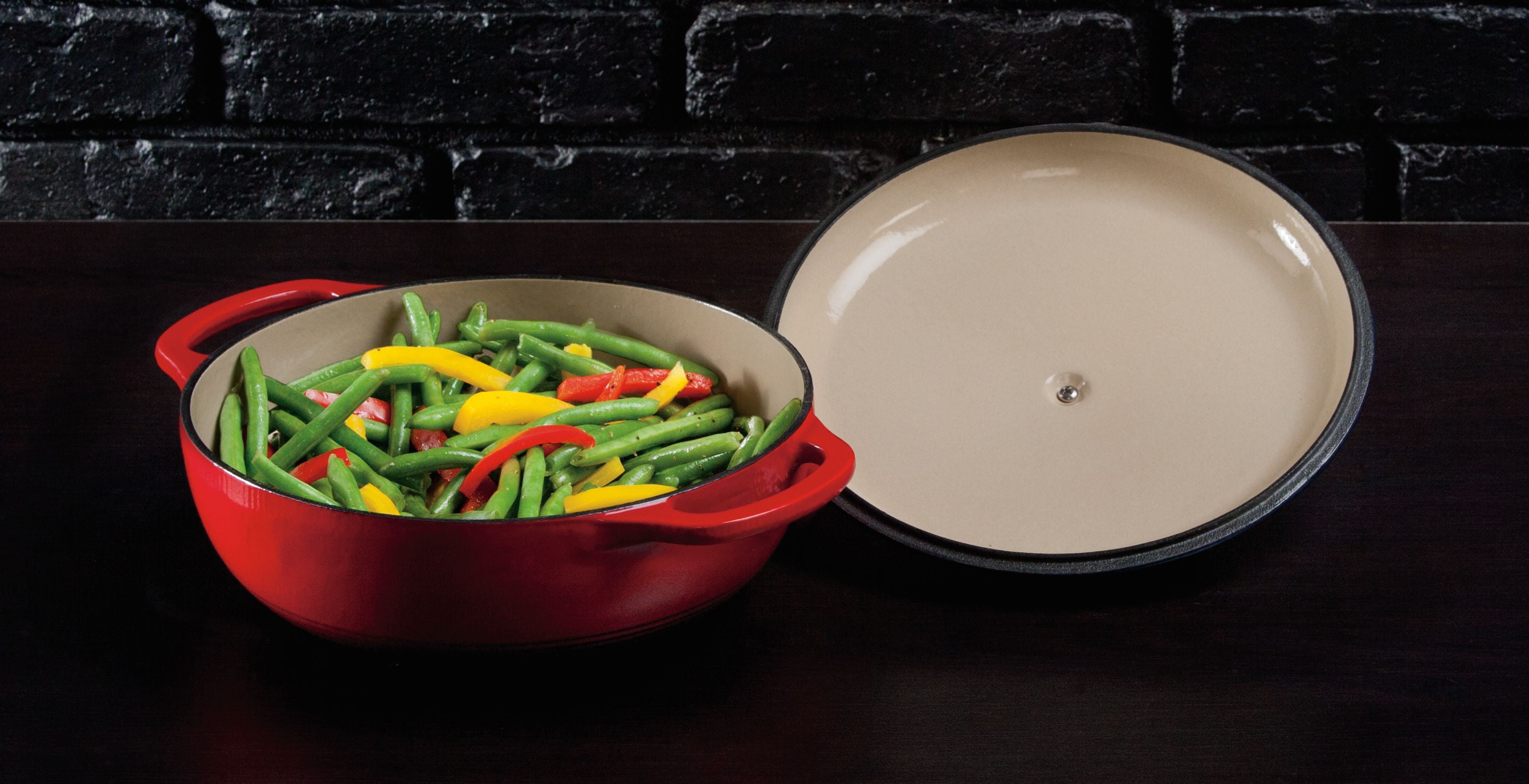 This is a classic and colorful enamel piece that makes every stove look good. But even more importantly, it’s a kitchen multitasker. Use it to broil, braise, bake, or roast in the oven up to 500° F, and sauté, simmer, or fry on any stovetop, as well as to marinate and refrigerate food.