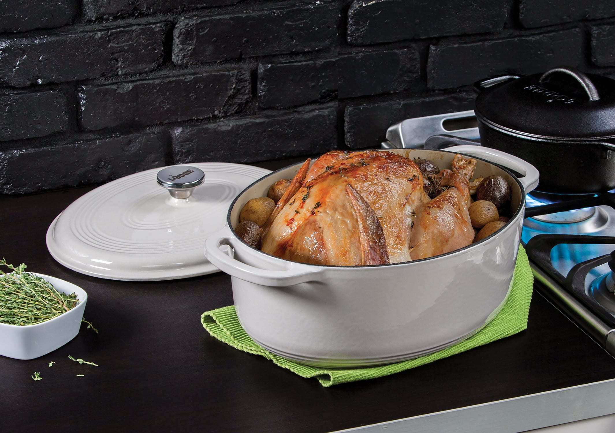 Lodge 7 quart enameled cast iron dutch oven in red Oven safe up to 500 degrees Fahrenheit Stainless steel knob and loop handles for great control Smooth enameled surface won’t react to ingredients Unparalleled heat retention and even heating Use to marinate, refrigerate, cook, and serve Easy to clean enameled surface Cookware that stays in the family and out of the landfill Made in China
