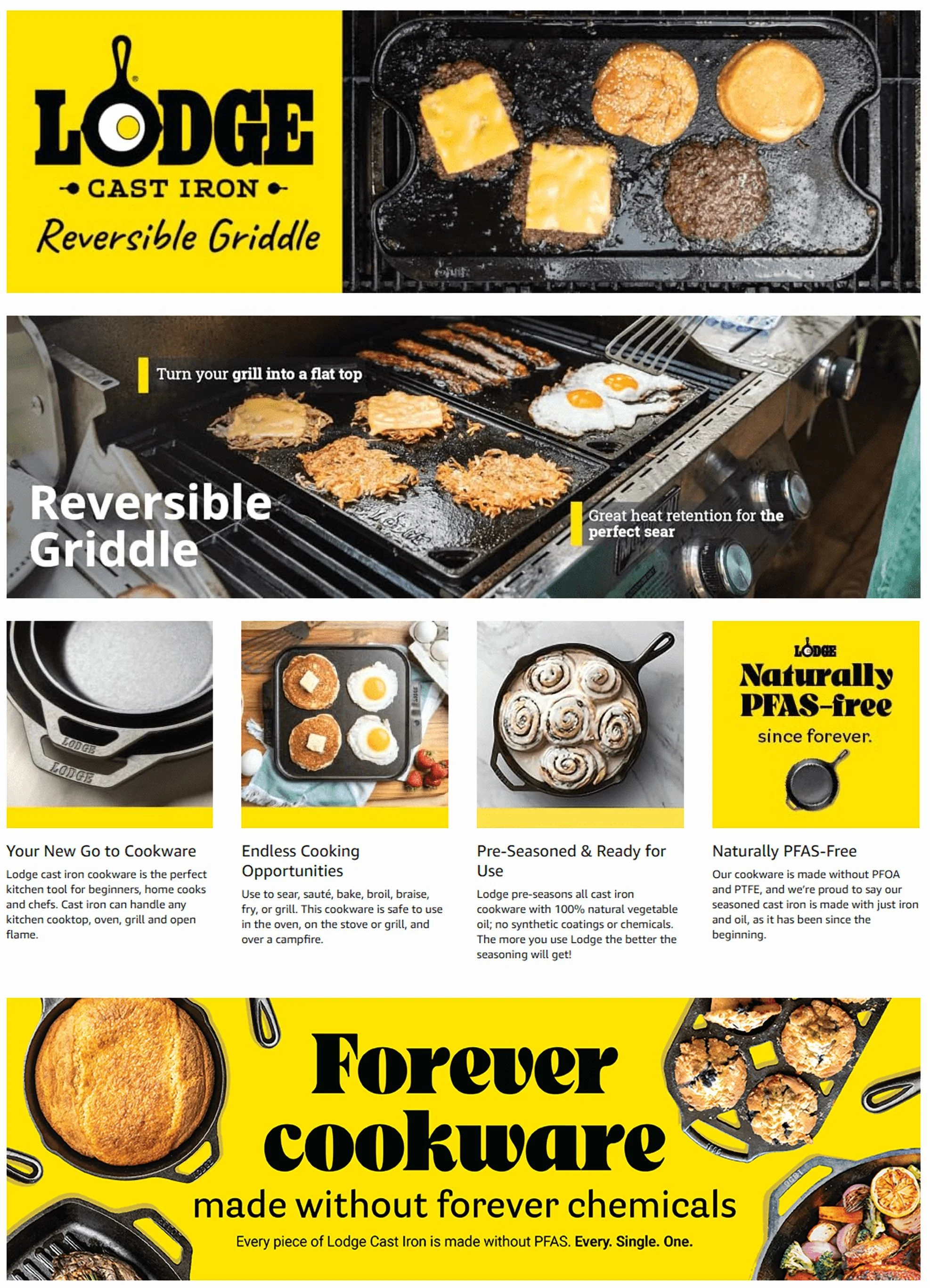 10 x 20 inch cast iron reversible grill/griddle Nonstick surface seasoned with 100% natural vegetable oil Safe for use in the oven, on the stove, on the grill, or over a campfire Great for high heat cooking and searing Easy to clean: just hand wash, dry, and rub with oil Made of all natural ingredients Cookware that stays in the family and out of the landfill Made in Tennessee
