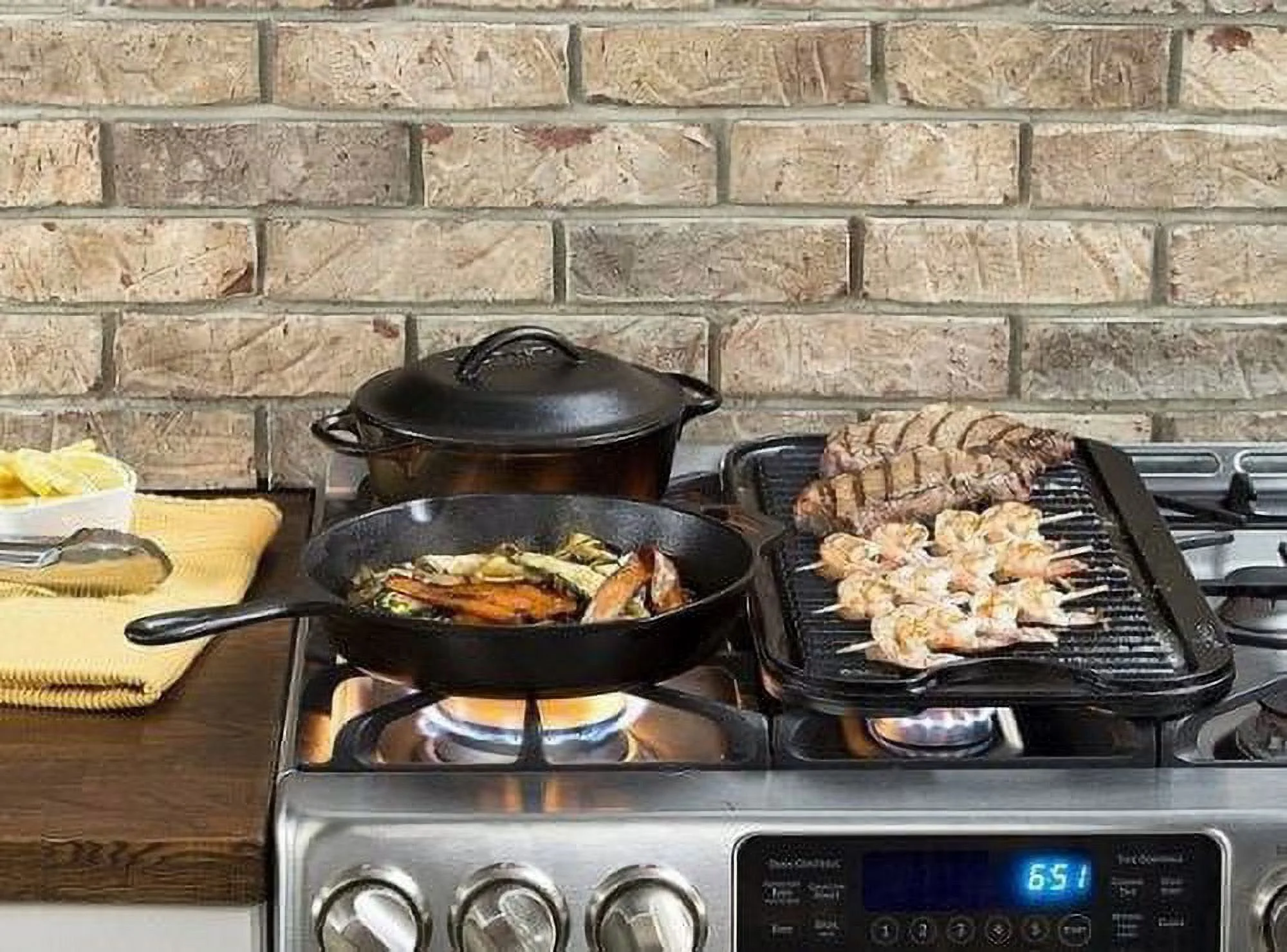 The Lodge Seasoned Cast Iron ProGrid Reversible Grill/Griddle is designed to cook over two stovetop burners. One side of the piece functions as a griddle and the other side functions as a grill, providing a restaurant quality sear and mouthwatering grill marks on your favorite dishes. The cast iron grill/griddle is made with just iron and oil for a naturally nonstick surface that provides excellent heat retention and even cooking. Lodge cast iron is built to last for generations, so you can serve memories at every meal, year after year. The Lodge cast iron reversible grill/griddle is seasoned, ready to use, and easy to care for. Since 1896, Lodge Cast Iron has been making heirloom quality skillets, pans, dutch ovens, bakeware, and grilling gear, bringing professional chefs, home cooks, and outdoors folk everything they need to make incredible meals. Our cast iron is made in Tennessee, and we’re proud to be a family owned company with a strong commitment to quality, values, and integrity. As the original cast iron manufacturer, we proudly set the standard in cookware that can go anywhere and do anything.