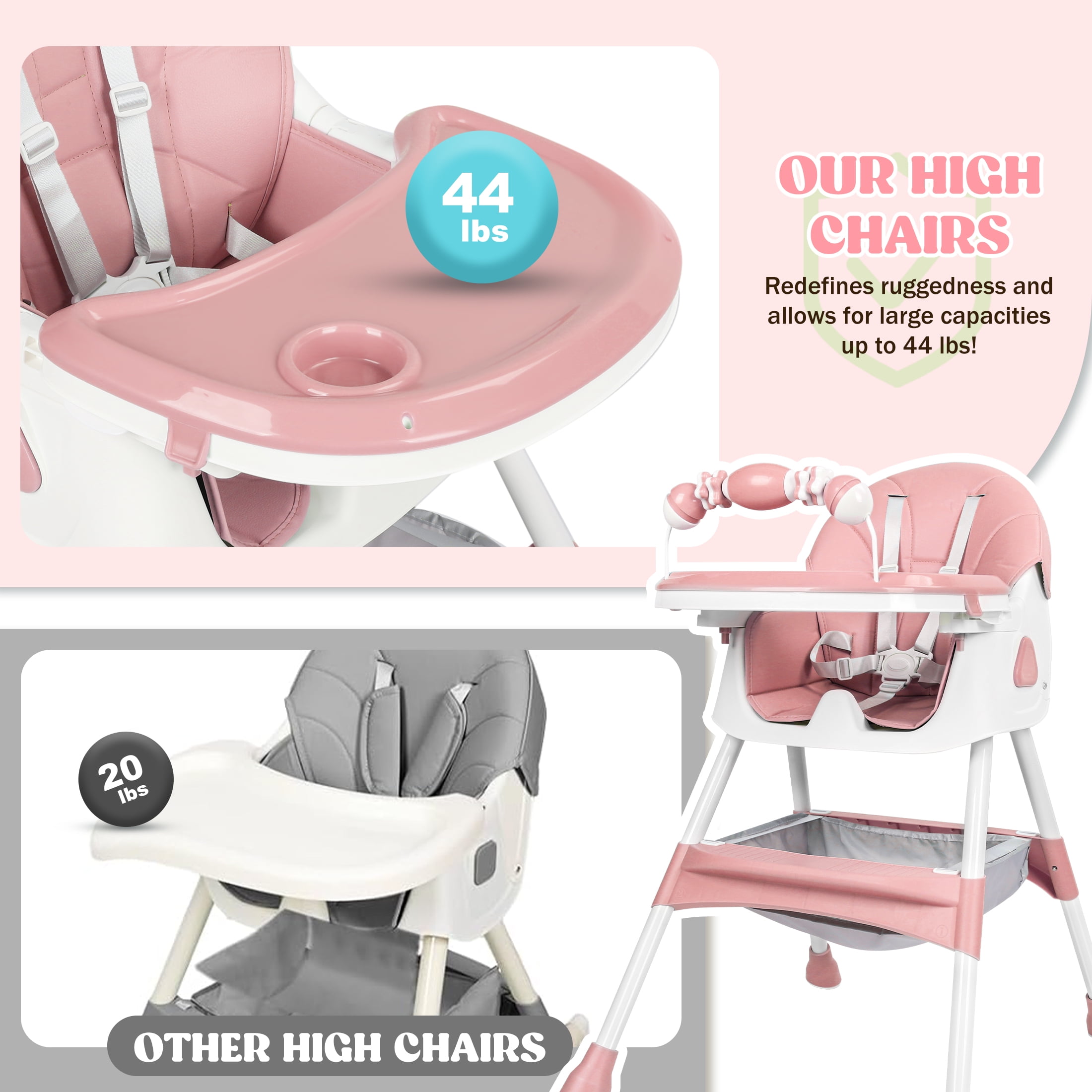 This versatile 4-in-1 high chair feature solid value and smart design, adapt effortlessly to your child’s needs with its functions as a baby high chair, toddler arm chair, baby dining chair, and baby rocking chair. Suitable for ages 6 months to 6 years, which could ensure long-lasting use. It breeze with a removable and telescopic tray, a five-point safety harness, a anti-slip seat crotch and 3-level adjustable backrest to ensure baby maximum comfort and safety. In addition, the high chair for toddlers has 4 removable 360 degree lockable wheels and a large storage basket, which can hold baby toys or other baby’s essentials while taking kids for a walk. The baby booster chair can be effortlessly folded away with a single click to storage out of sight or to pack easily into the car, ideals for home and traveling! Product Specifications: Material: Plastic PP, PU leather pad, Steel pipe Weight: 11.5 Pounds Product Dimensions: 24.8 x 29.53 x 35.83 inches Color: Pink/Blue/Grown Care instructions Wipe the stain with a damp cloths Assembly requie: Yes Age range: 6 Months & Up Max Weight: 60 lbs Package Includes: 1 x Convertible Baby Chair Reminder: Be sure to use your product as directed. If not sure how to assemble and use properly, just contact our world-class, friendly customer service team for quick solutions.
