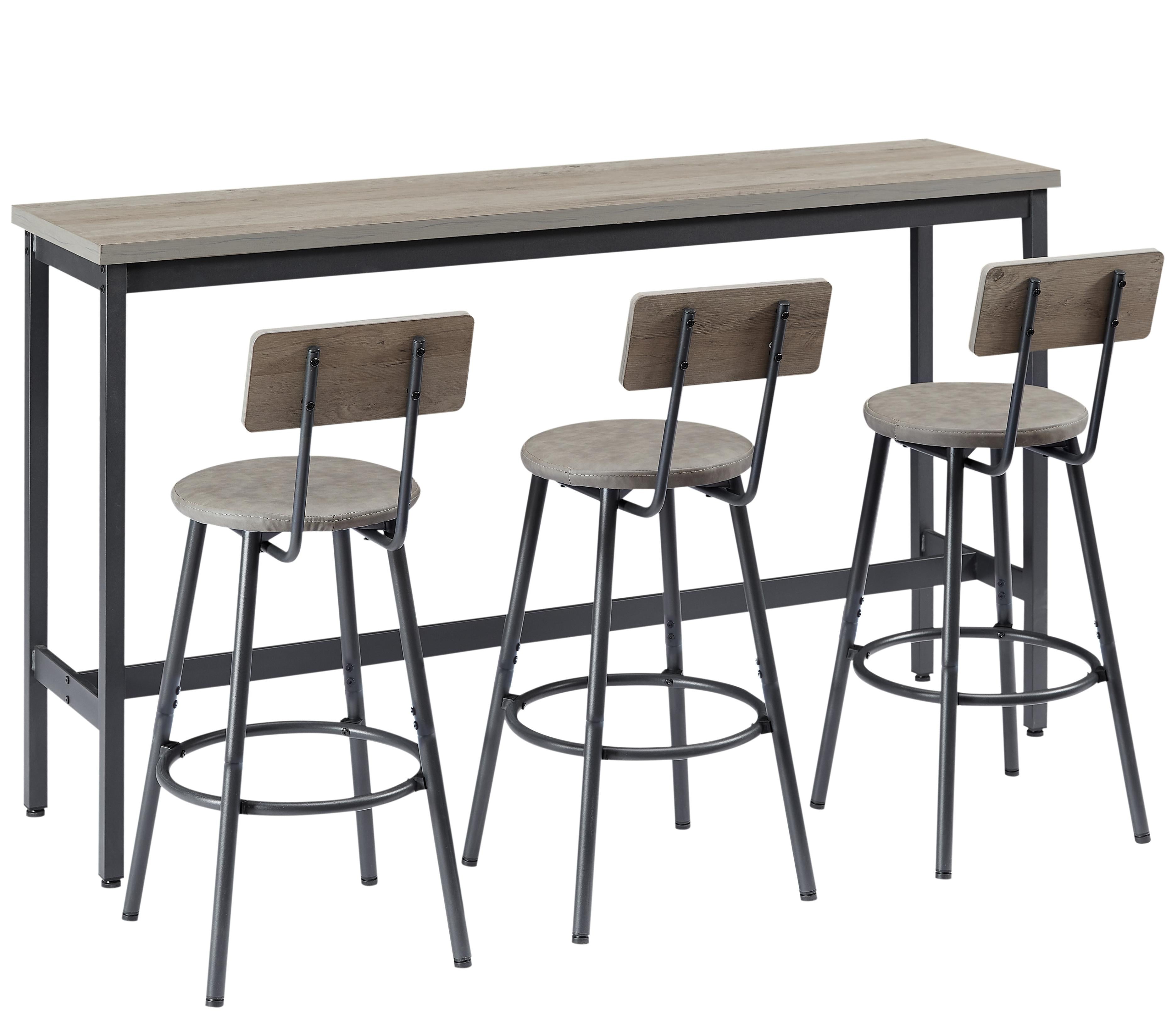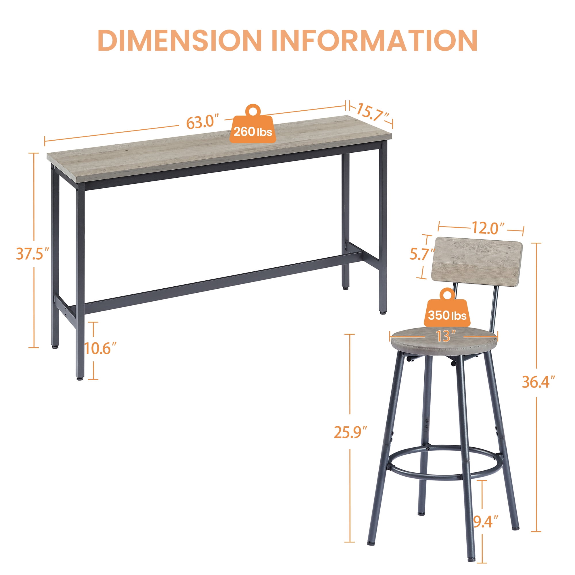 LONG BAR TABLE AND CHAIRS SET FOR 3: This long bar table and chairs set includes one 63 “L x 15.7″W x 37.5 “H bar table and three 13 “L x 13 “W x 36.4 “H upholstered PU bar stools, which is suitable for placing anywhere in your home, perfect for sipping a drink with friends or enjoying a quick breakfast. STRONG AND STABLE CONSTRUCTION: The steel construction and reinforced bottom beams make this bar table and chairs very stable, and the high-quality particle board surface is durable, easy to clean, and long-lasting. COMFORTABLE BACK CHAIRS: The long bar table and chairs set comes with 3 ergonomically designed PU leather back chairs to provide you with a comfortable sitting experience.