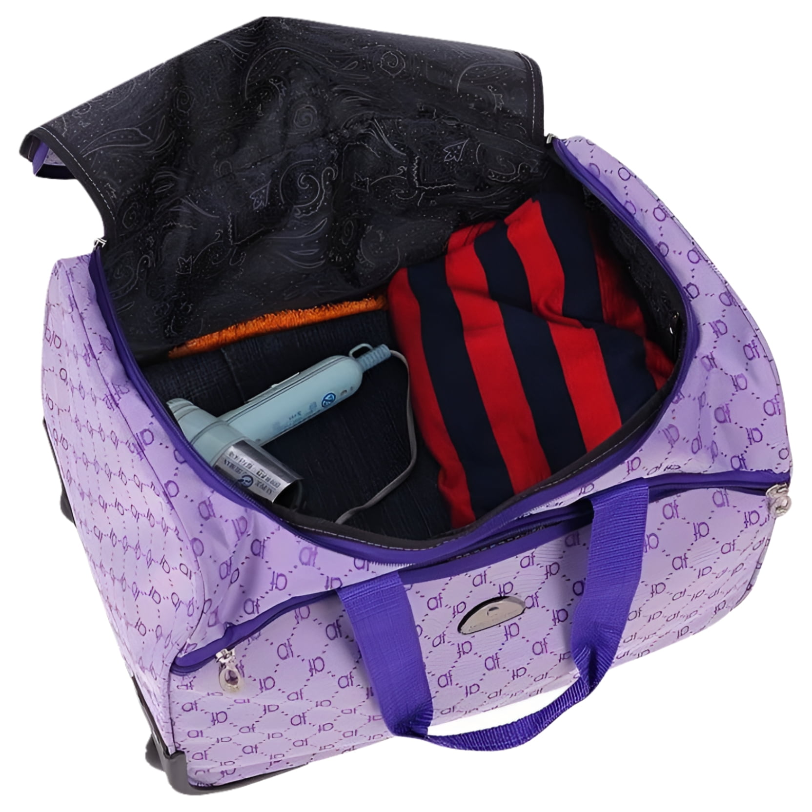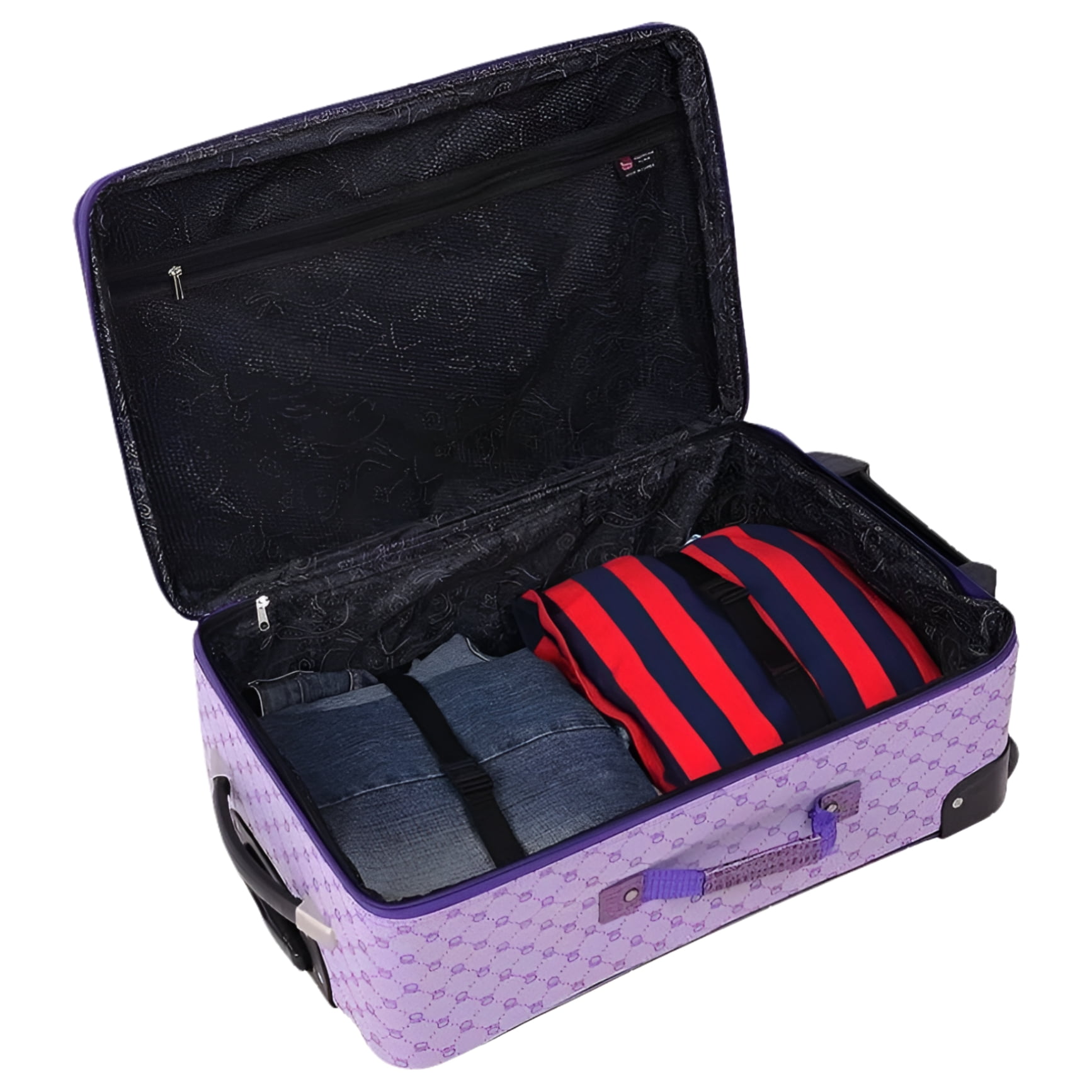 Travel in style with a chic American Flyer Signature 4-piece fashion luggage set. Easy-to-spot baggage on the carousel with its American Flyer print. Medium Rolling Upright: 24″ X 16″ X 9″ – 8.6 lbs. Carry-On Rolling Upright: 20″ X 14″ X 8″ – 7.2 lbs. Rolling Duffel: 18″ X 11″ X 11″ – 4.6 lbs. Cosmetic Satchel: 11.5″ X 10″ X 8″ – 1.4 lbs. Upright suitcases feature a telescoping handle system. 2″ expandability for extra packing power. In-line skate wheels for easy handling & smooth, quiet transportation. Corner protection on high-impact areas. Uprights feature a mesh pocket in the lid. Fully lined interior. Multiple interior & exterior pockets.