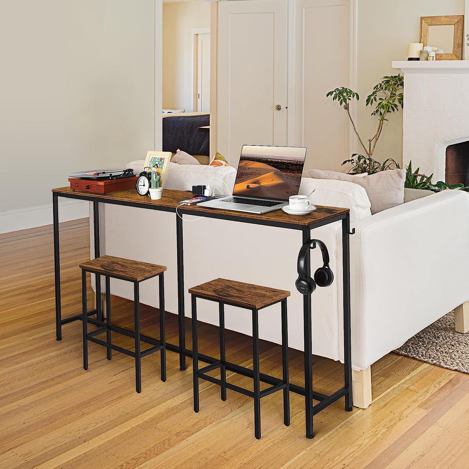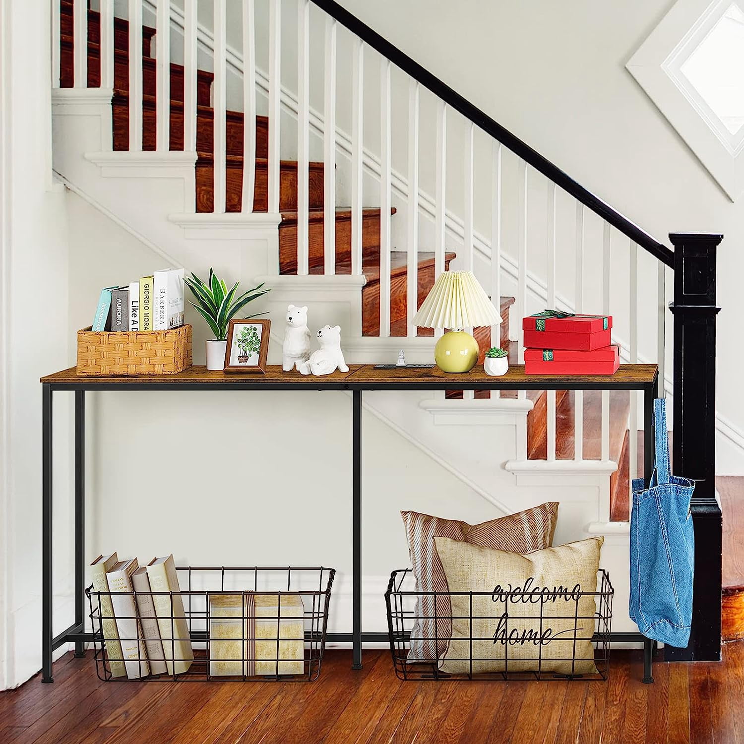 [Sofa Table with Outlet] Long console table with 2 standard 125V AC outlets, 3 USB ports and 6.5ft long power cord. Perfect for placing it behind the sofa to charge your desk lamp, cell phone, laptop, iPad and other electronic devices. [Large Storage Space] This 63”L x 11.8”W x 31.5”H entryway table with hooks provides you with enough storage space for books, plants, decorations, keys, and hats, etc. On bottom opening area, you can place laundry basket and storage boxes to make more effective use of space. [Durable and Sturdy] The narrow entryway table is made of thickened particleboard and a sturdy metal frame, the overall load capacity is up to 50-80LB. 4 adjustable foot pads ensure the stability of the entry table and prevent the floor from scratching. [Multifunctional Console Table] The end table cannot only be placed at the entryway to store keys, magazines, and a hallway lamp, but also be put near the window to display plants you love. Meanwhile, it is also the best side table and sofa table when you want to put it in the living room. [Modern Industrial Style] Black metal frame combined with brown wooden panels can go well with many different colors. The console table will let your study or bedroom more charming.