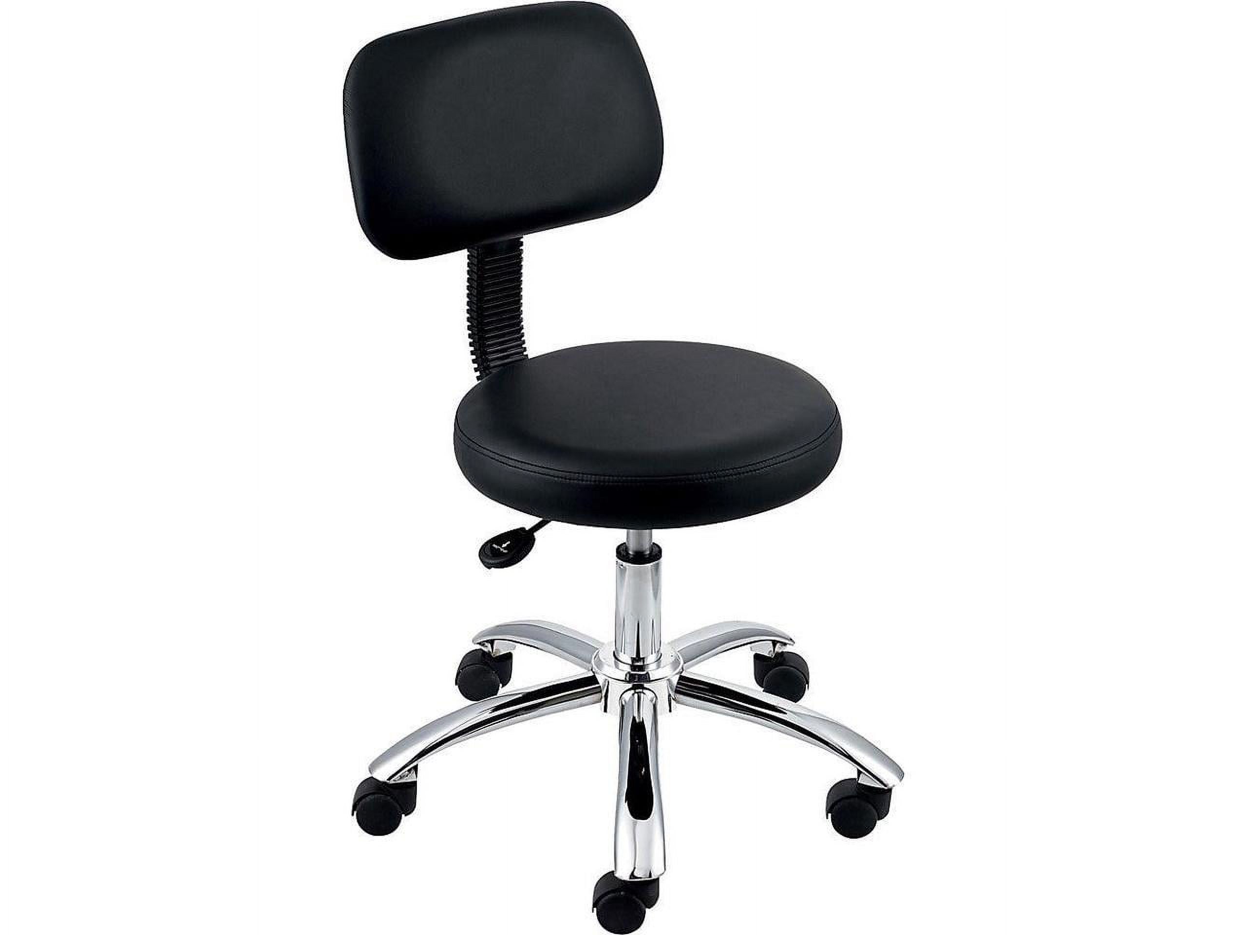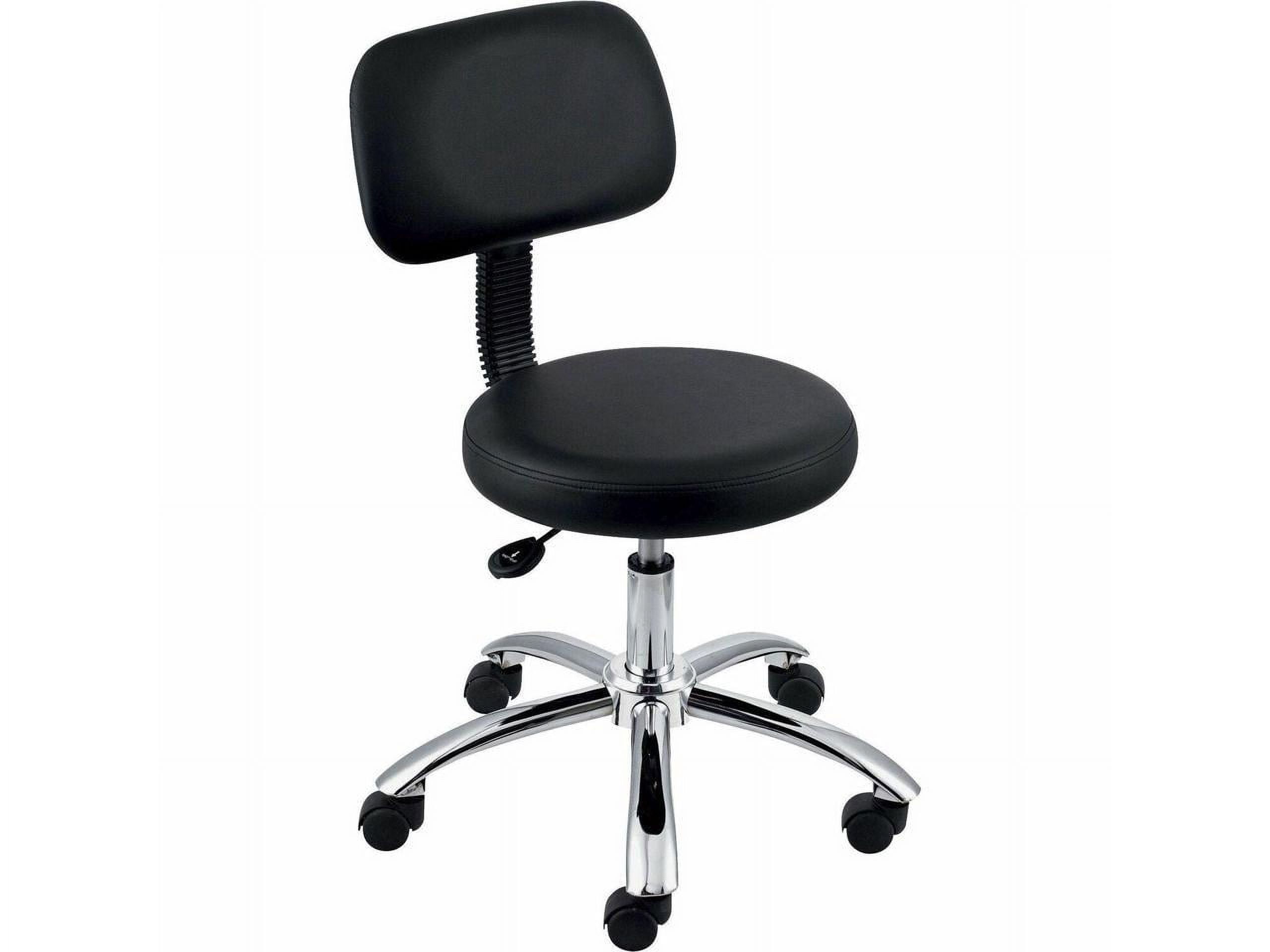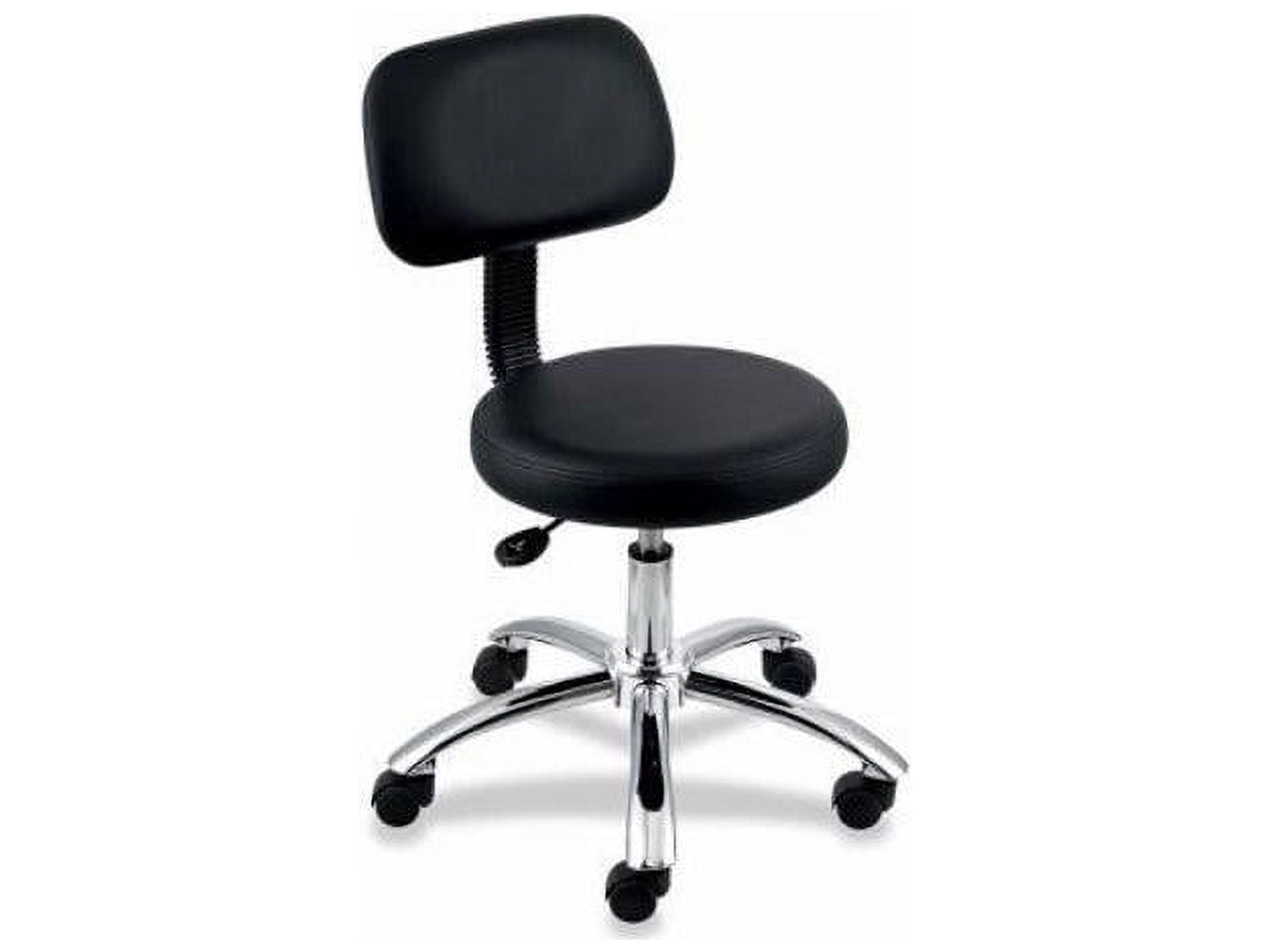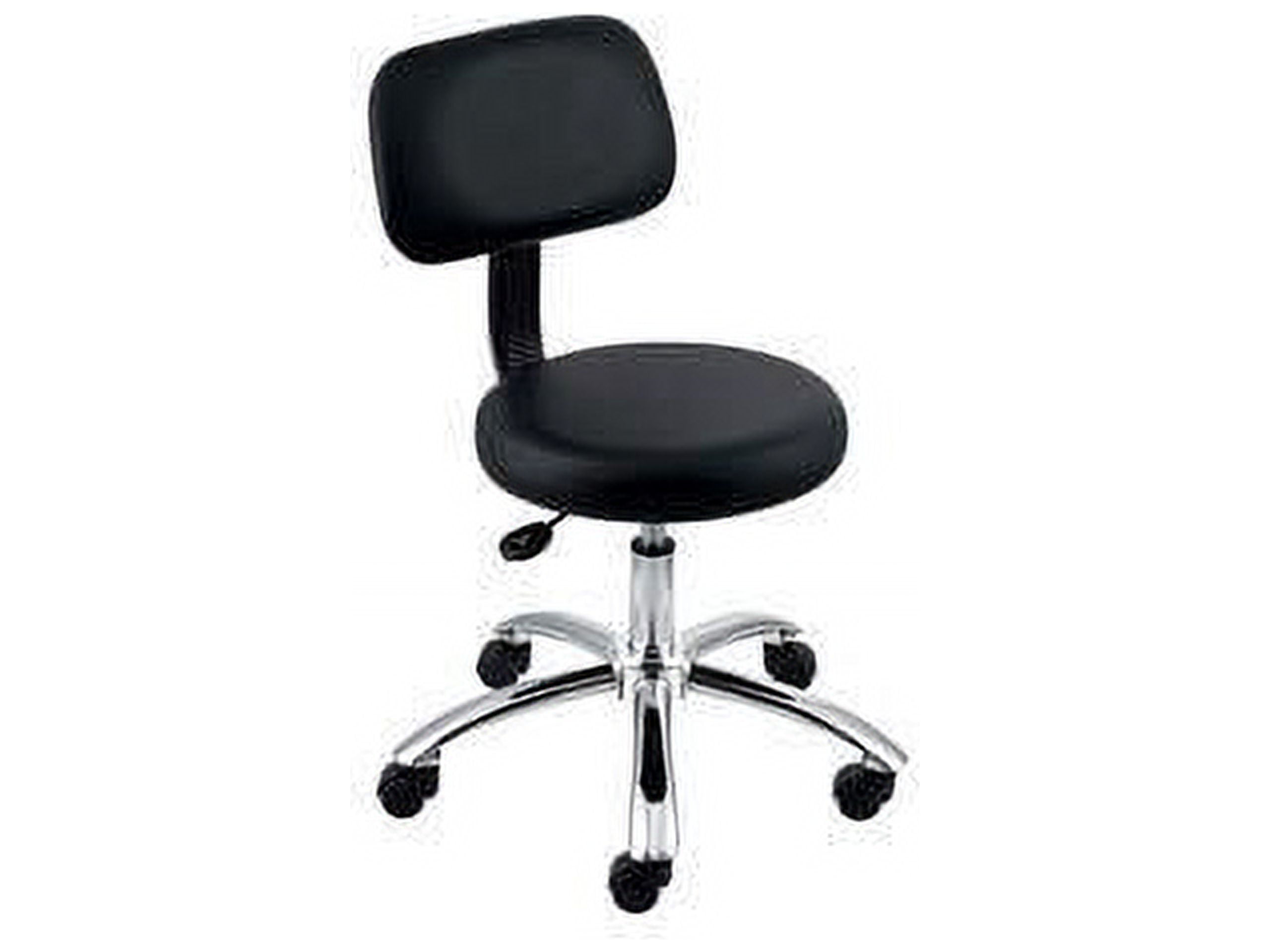Pneumatic height stool with back features a 16″ round vinyl covered seat, dual-wheel casters, and a chrome base. Functions include pneumatic seat-height adjustment from 17-1/2″ to 22-3/4″ , back-height adjustment, seat-depth adjustment and 360-degree swivel. Back measures 16″ wide x 10″ high.