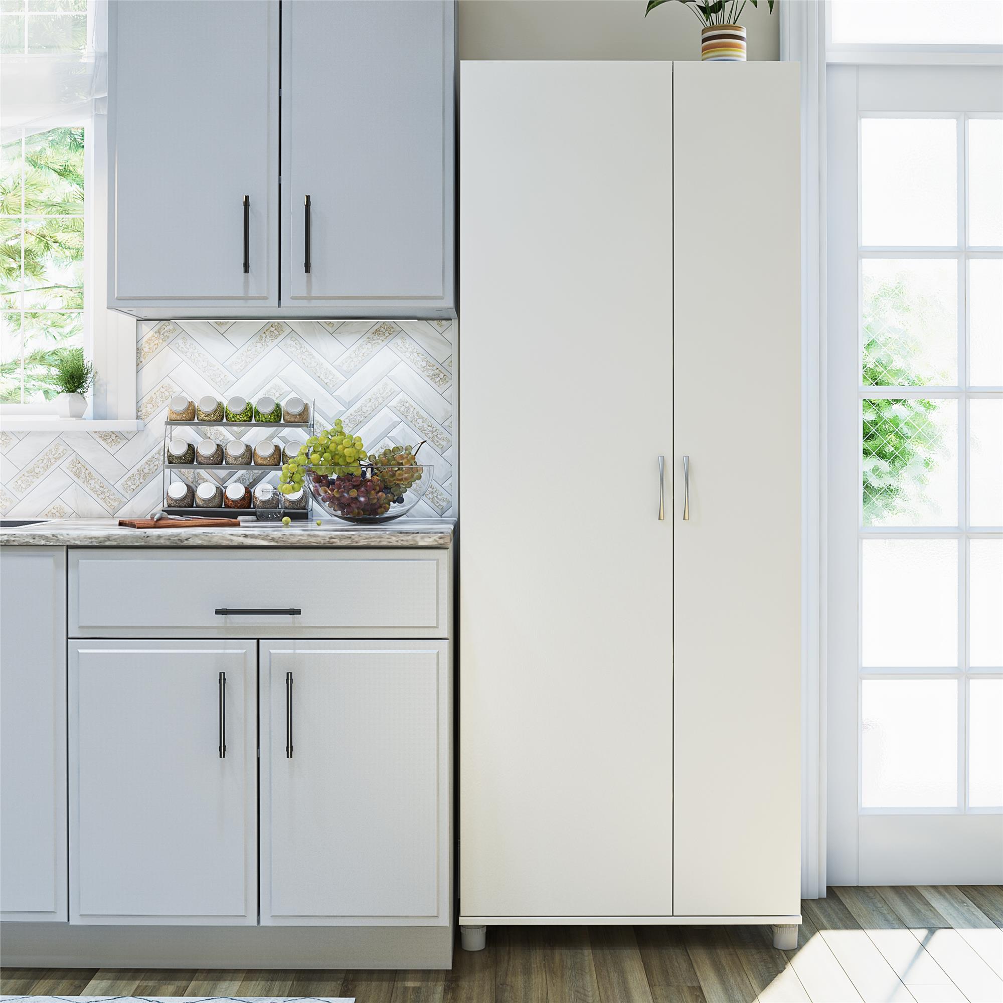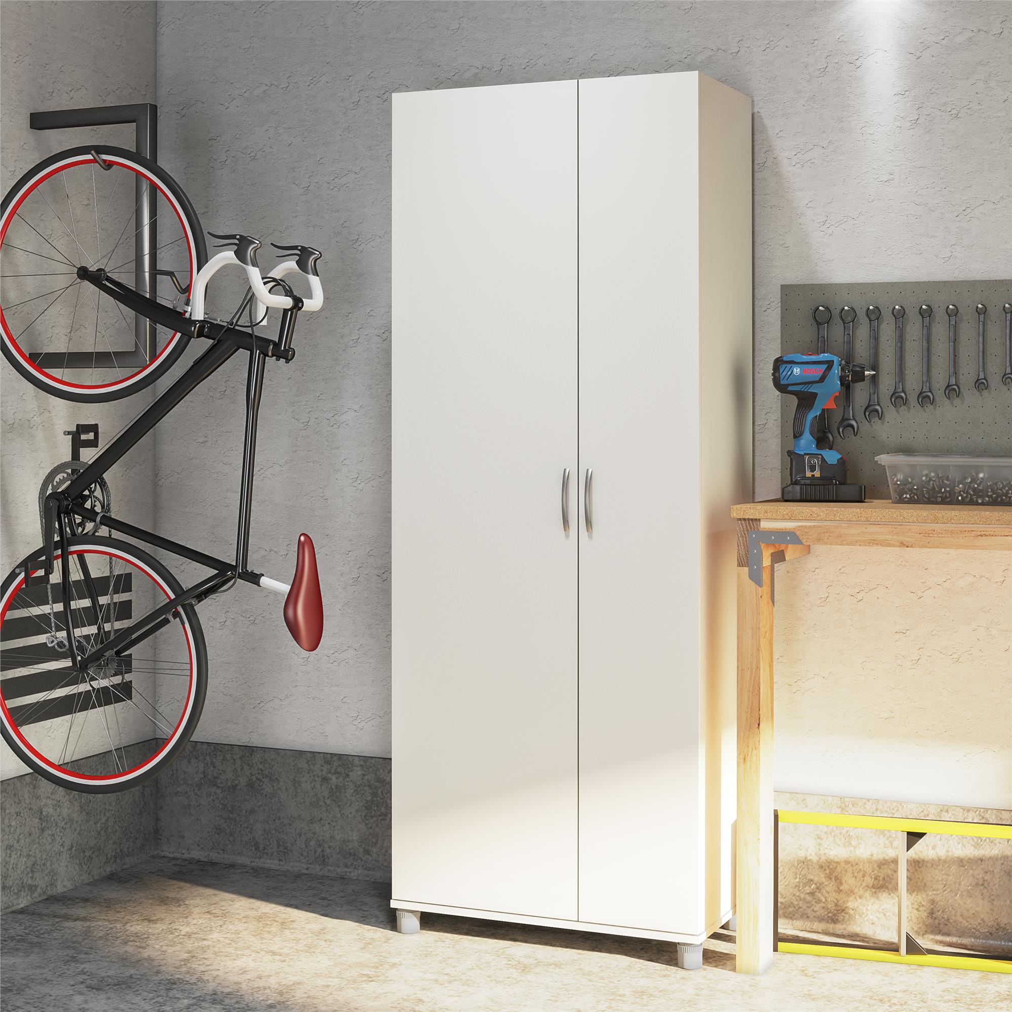 Get extra storage where you need it most with the Systembuild Evolution Lory Tall Asymmetrical Cabinet. The smooth finish on laminated particleboard give the Cabinet a modern look at an affordable price. The Cabinet features one wide door, and one slender, each offering multiple sizing options to fit all your storage needs. Behind the wide door are 5 shelves, 2 fixed, and 3 adjustable making customization easy for items small to tall. The slender side offers an additional fixed shelf up top, and an extra-long storage space below perfect for yoga mats, wrapping paper, spools of fabric, or mops and brooms. Store away and organize everything from kitchen pantry items, cleaning supplies, office supplies, craft supplies, or sporting goods. The adjustable feet make keeping your Cabinet level on uneven floors simple. A wall anchor kit is included to prevent tipping injuries and keep your family safe. Use this piece as a stand-alone item or combine it with additional Systembuild Evolution Lory storage items to create the perfect storage solution for your entire home. The Storage Cabinet ships flat to your door and requires assembly upon opening. Two adults are recommended to assemble. Once assembled, the Storage Cabinet measures to be 28.62″ W x 15.4″ D x 74.26″ H and weighs 107 lbs.