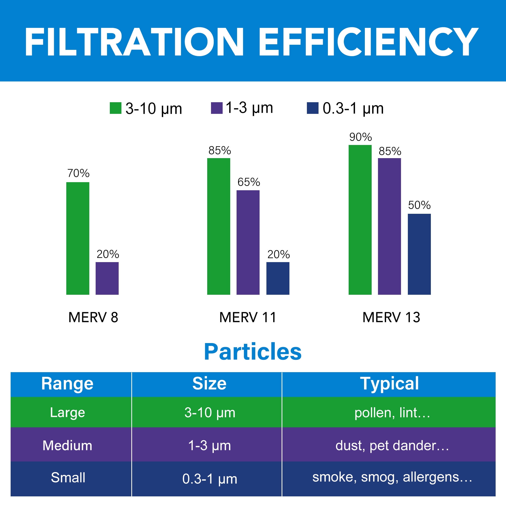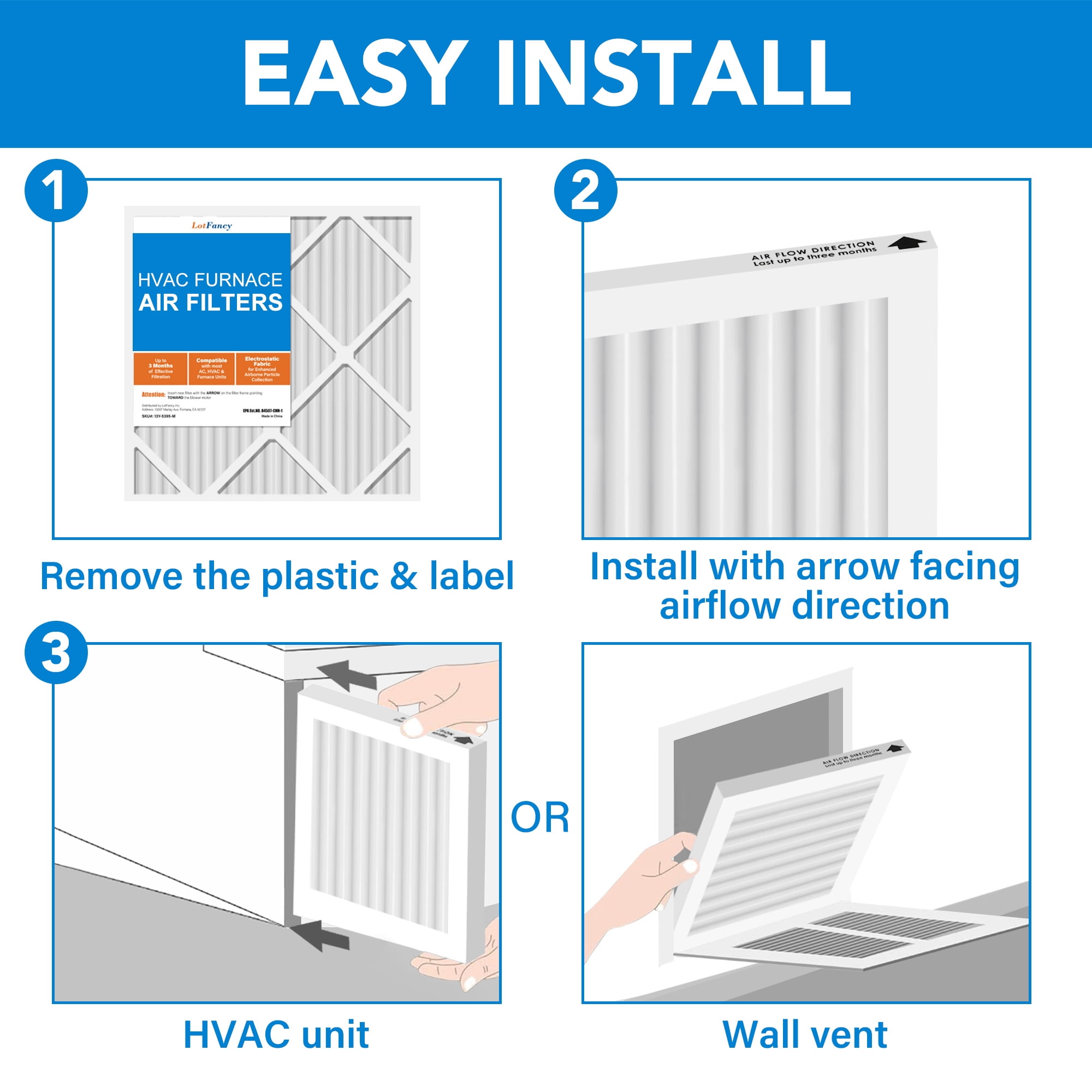 LotFancy AC filters are made of moisture-resistant cotton fibers and sturdy paperboard. The air conditioner filters feature an electrostatically charged pleated design to capture more harmful airborne particles, outperforms standard fiberglass filters. MERV 11 air filters will capture 95% of household airborne particles sized 1 to 3 microns and help filter out dust & lint, dust mites, pet dander, smoke, smog, auto exhaust, coughs and sneezes without reducing air flow. Commonly used for commercial and residential buildings, and medical facilities, that require above-average air quality. A MERV 11 filter is a must if you have kids or pets or suffer from allergies. Timely filter replacement helps prolong service life of your heating and cooling system and can reduce your energy bill.