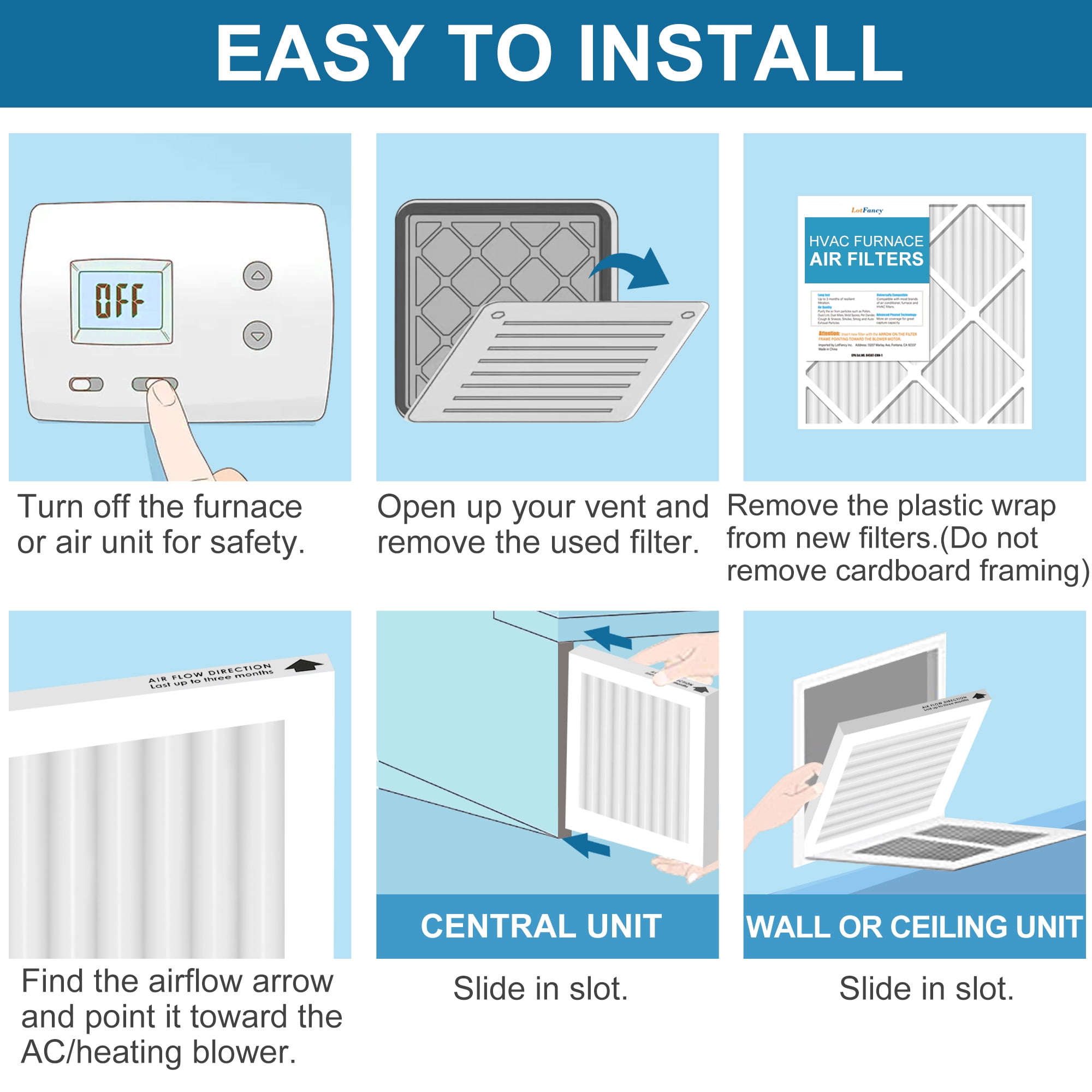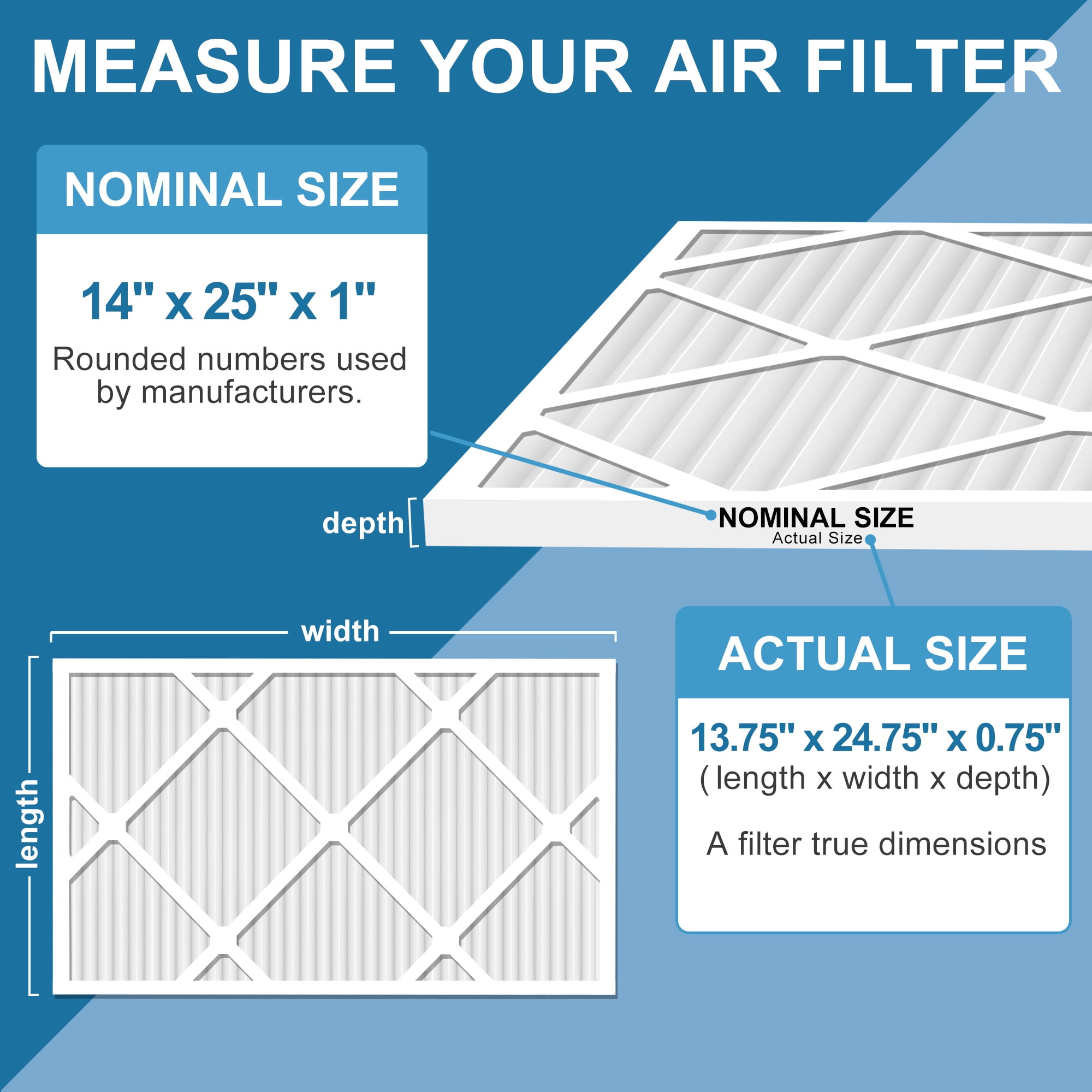 14x25x1’’ AIR FILTERS:Actual size of the furnace filter is 13.75 x 24.75 x 0.75”; Sold in Packs of 4; Material: Alloy Steel, Paper, Cotton Our AC filters are made of moisture-resistant cotton fibers and sturdy paperboard; It’s recommended to change your filters every 2-3 months for maximum efficiency; Note: Before buying a replacement filter, check the size of your current filter; For safety, turn off your HVAC unit before changing filters Just open up your vent and remove the used filter, make sure the airflow arrows are pointing toward your HVAC unit, then slide the filter into the slot Timely filter replacement helps prolong service life of your heating and cooling system and can reduce your energy bill