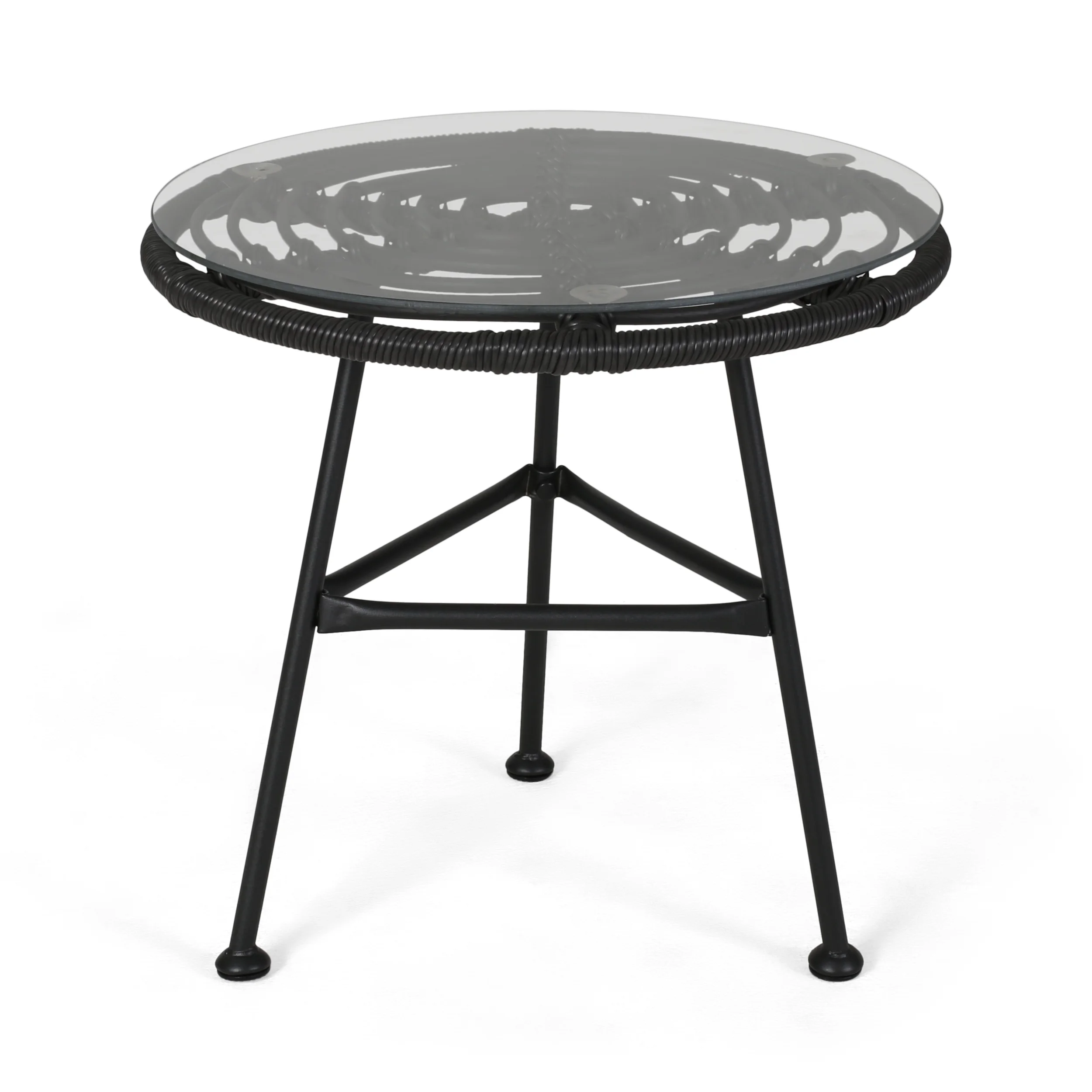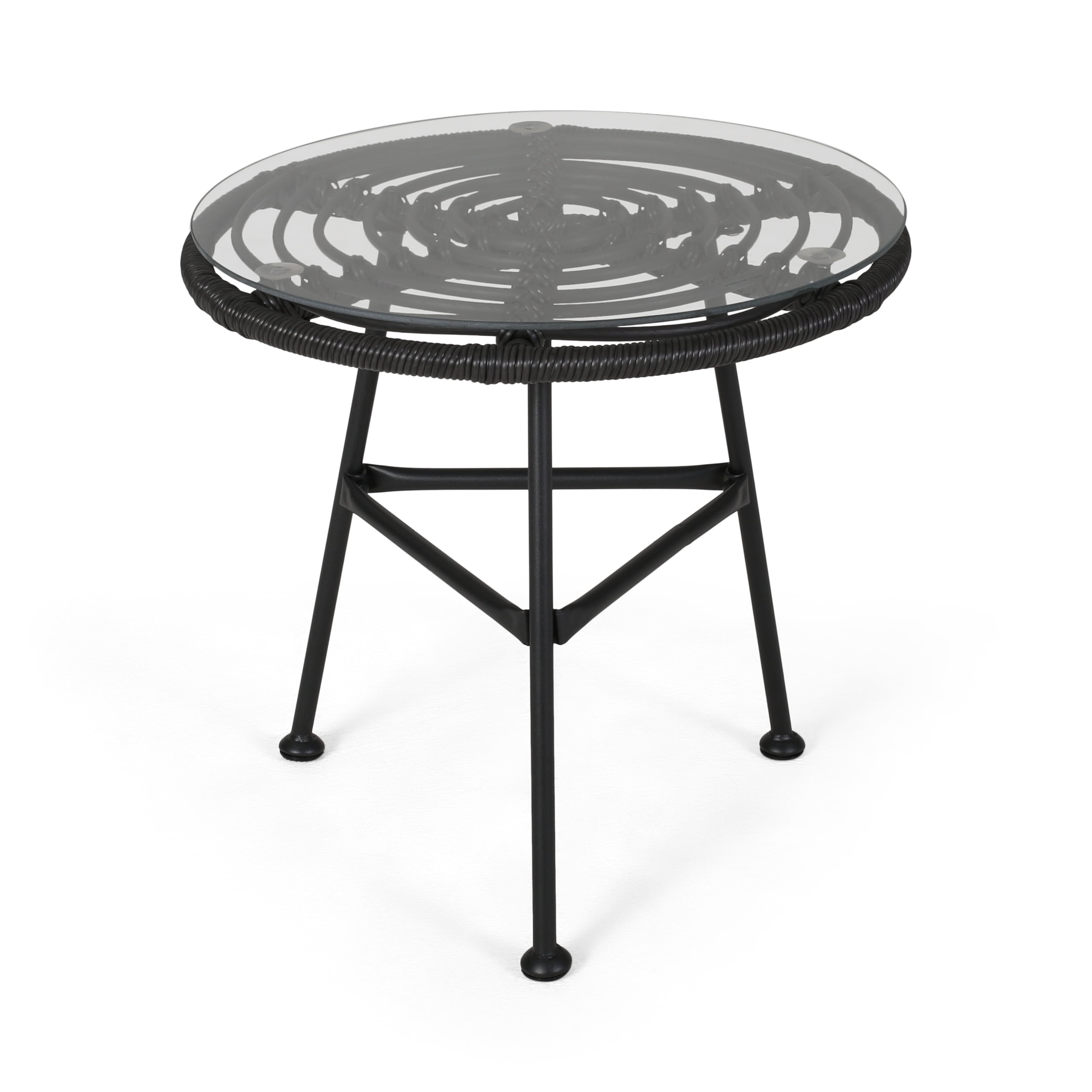 Gift your outdoor seating with a companion that brings style and function to your outdoor décor. Featuring a delightful hand-wrapped look, our side table offers a durable structure and uniquely modern style. Consisting of a steel frame and rattan material, this charming piece is made to last with its weather-resistant construction and durable structure. Whether you are serving up a glass of lemonade or a tray of snacks, our end table will have no problem keeping your patio in style all summer long. MODERN: With clean lines contrasted perfectly by its concentric circular top, our rattan table is the ideal modern accessory for your outdoor space. Finished with thin angled legs, this table not only has a sleek, minimalistic look but also provides a stable structure. POLYETHYLENE RATTAN: Featuring a long-lasting woven table top, this style is not only incredibly durable but also provides a versatile appearance. The handcrafted details of this material allow this piece to blend seamlessly with your outdoor decor. TEMPERED GLASS: Our side table has a tempered glass top that offers a smooth translucent surface. This glass is made to be stronger and safer than regular glass, making this more resistant to breakage and shattering. STEEL FRAME: The frame of this table consists of a steel material, making this incredibly durable and easy to maintain. Finished with a polished black color, this frame emphasizes its modern style. ASSEMBLY REQUIRED: Some assembly is required for this side table. All of the instructions and tools needed for assembly are included. Features: Includes: One (1) Side Table Material: Tempered Glass Frame Material: Polyurethane Leg Material: Steel Finish: Glass Frame Finish: Gray Leg Finish: Black Some Assembly Required Hand Crafted Details Specifications: Product Dimensions: 18.50″ H x 19.50″ W x 19.50″ D Product Weight: 9.7 lbs