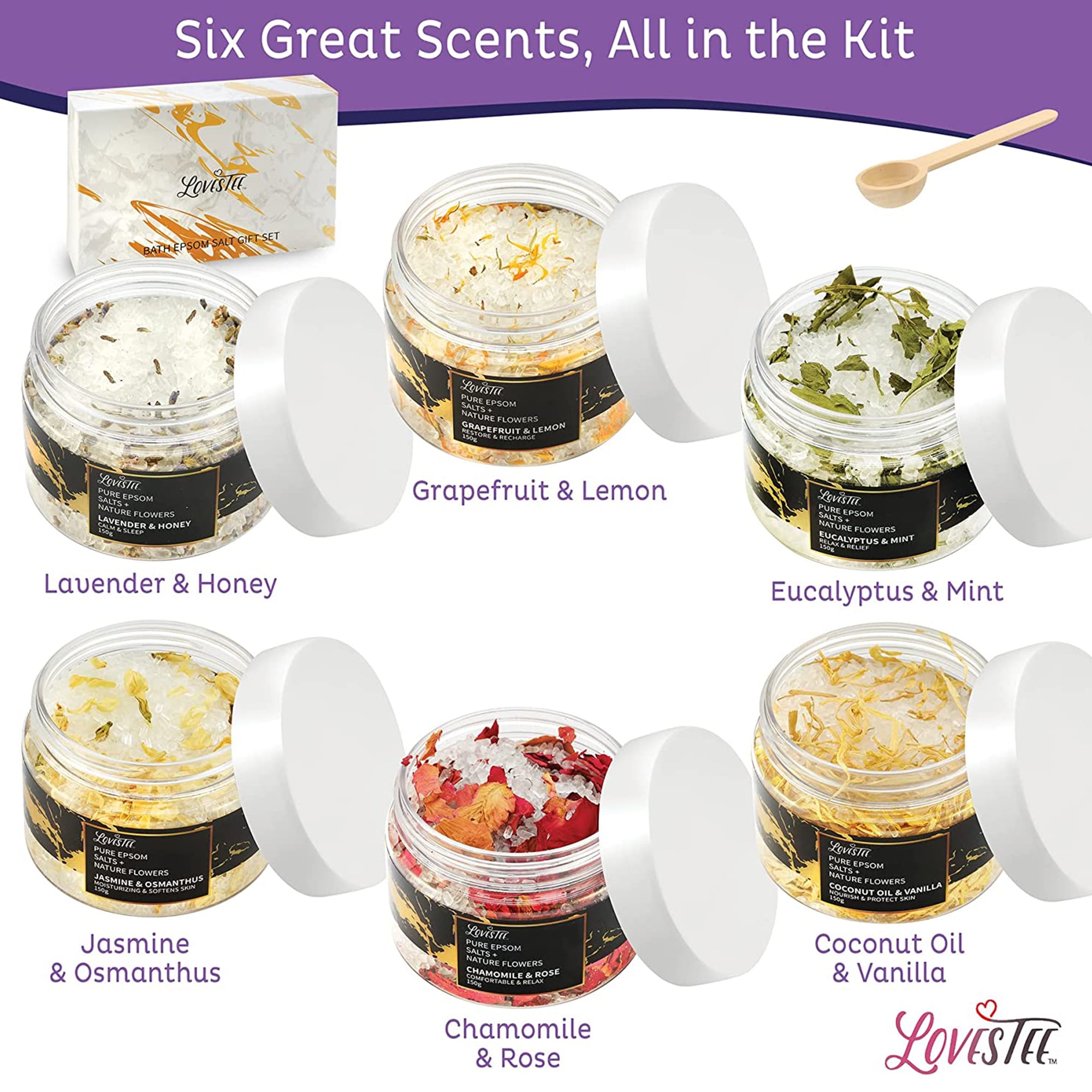 Want to soak the stress away after a long day? Create the perfect ambiance for relaxing, recharging, or getting ready for bed with our glorious epsom salt bath set. Take a break from the grind and carve out some “me time” to unwind and de-stress with this all-in-one spa gift basket set. There’s no other bath spa gift sets for women that have it all like our bath set. The elegant dried herbs or flowers mixed in the jar give it that luxurious touch. Experience total renewal of body, mind, mood, and spirit with this spa set as you fill the tub, take a nice soak, and put yourself first for a change. Indulge in the restorative power of Lovestee 6-Scent Epsom Salt Bath and Body Spa Gift Basket Gift Set for Women! Our spa gift set features coconut/vanilla to nourish and protect, jasmine/osmanthus to moisturize and soften, eucalyptus/mint to relax and relieve muscles, lavender/honey for calm and sleep, chamomile/rose to comfort and soothe, and grapefruit/lemon to restore and recharge. All of these products in our bath and body kit provide an aromatherapy experience that’s sure to rejuvenate your weary self and leave your skin feeling soft and vibrant. As the epson salt dissolves swiftly and completely in warm water, it leaves a subtle scent and nothing else. The epsom salt bath helps you create a comforting foot soak for yourself to relieve your pains and discomfort. Our spa-themed bath and body set will bring delight for any celebration, ranging from birthdays and anniversaries or just to say thank you. This set of 6 comes elegantly packaged in a beautiful gift box with a sophisticated design and lid. Our luxurious gift set for women includes a wooden salt spoon, and the box is sturdy for easy reuse. Give yourself a unique, spa-like experience at the comfort of your own home. Add the Lovestee 6-Scent Epsom Salt Bath and Body Spa Gift Basket Gift Set for Women to your cart now!