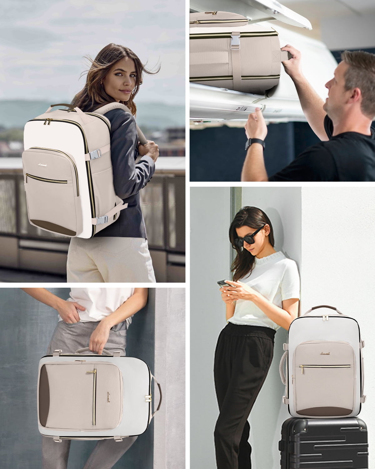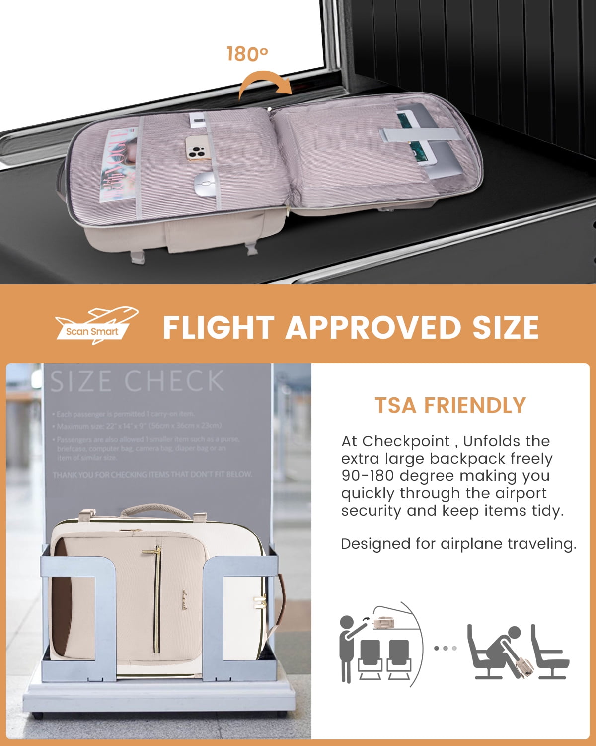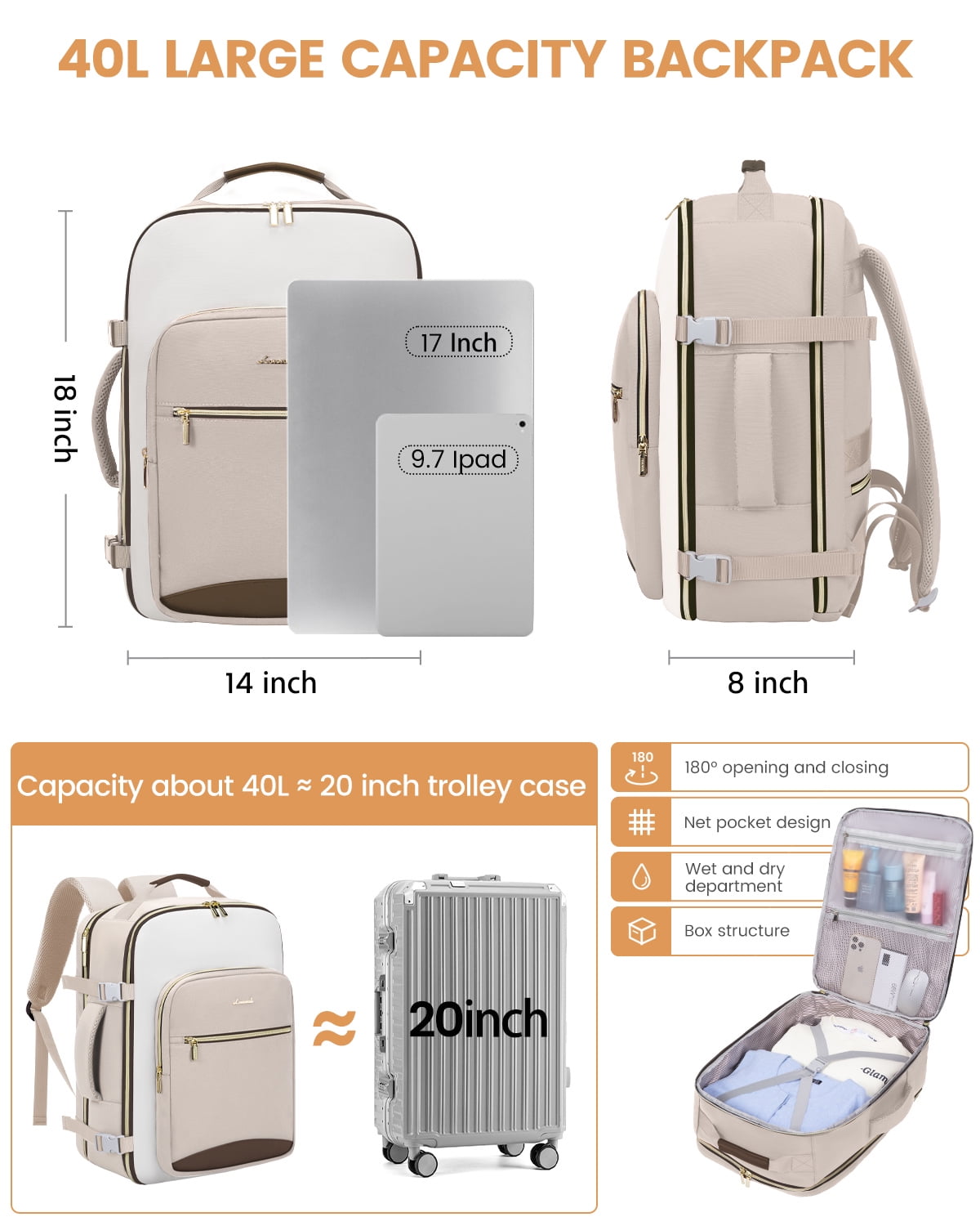 ✈Spacious & Organized Travel Backpack: With a 40L capacity equal to 20inch trolley case, 4 compartments &18pockets, designed to easily separate and organize your travel personal items, this travel backpack can accommodate 3-7 days worth of travel items ✈Versatile & Airline Approved Carry-on Luggage Backpack: This this carry-on backpack can be take as personal item bag directly into airplane, fits under the seat or in the overhead compartment, making it the perfect personal item for air travel ✈Practical 3 Extra Packing Cubes: 3 extra storage bags as well as a built-in wet compartment pocket, Perfect for storing shoes cosmetics toiletries towels underwear socks……these packing accessories ensure your belongings remain dry and prevent any leaks or moisture from affecting your other items ✈180° Opening Laptop compartment for Friendly TSA: Design separate laptop compartment padded with thick sponge and fix by a shock-resistant strap preventing from sliding and bumping, Fit up to 17.3 inch laptop,180° opening mouth for fast security inspection in Airport ✈Ideal Gift for Travel Enthusiasts: Surprise your loved ones or yourself with this highly functional+sturdy strap+stylish travel backpack, wonderful versatile companion as a travel backpack carry-on luggage backpack or personal item bag, would be a perfect gift for men and women, wife, girlfriend, mother, daughter, and friends in birthdays, Thanksgiving, Christmas, New Year, and Valentine’s Day