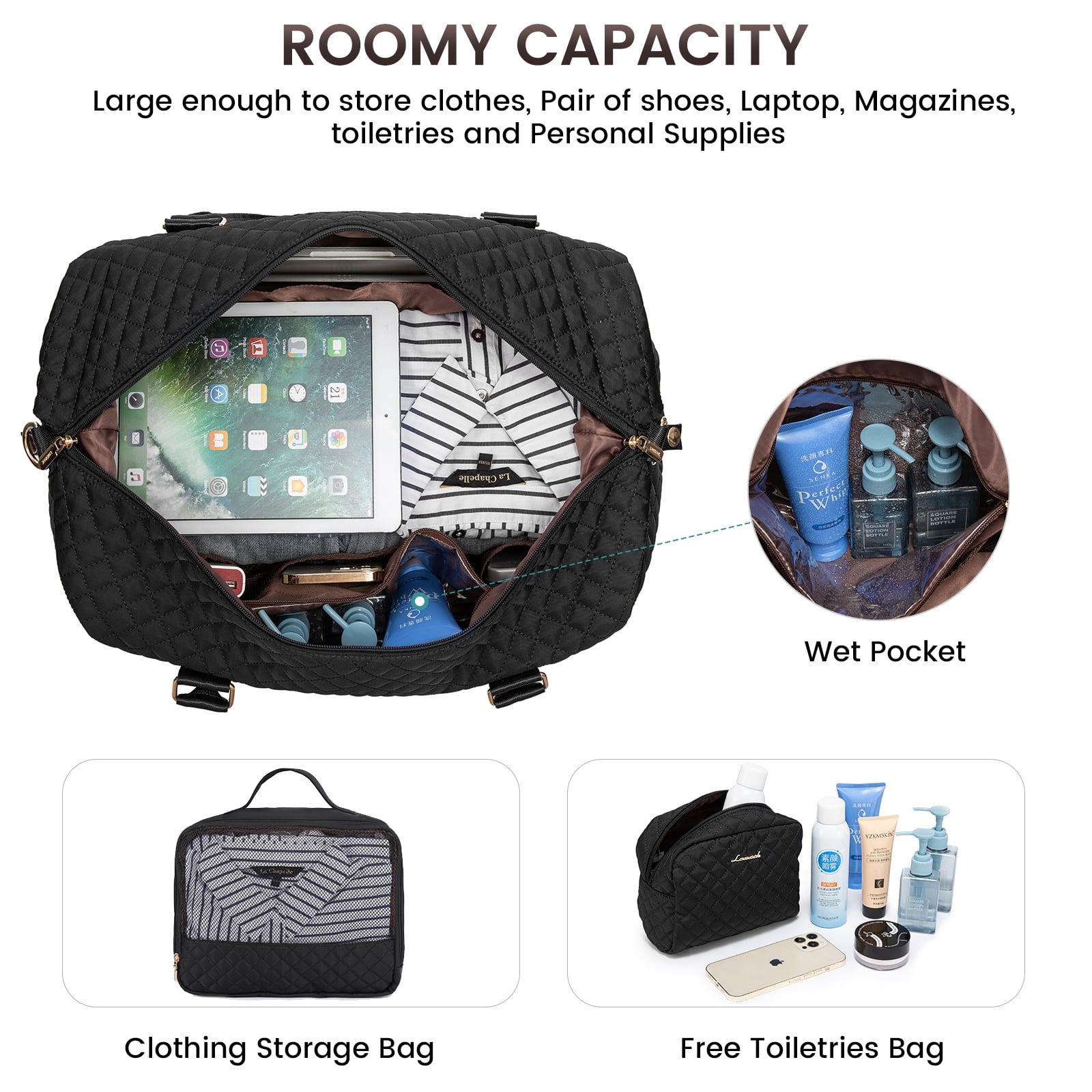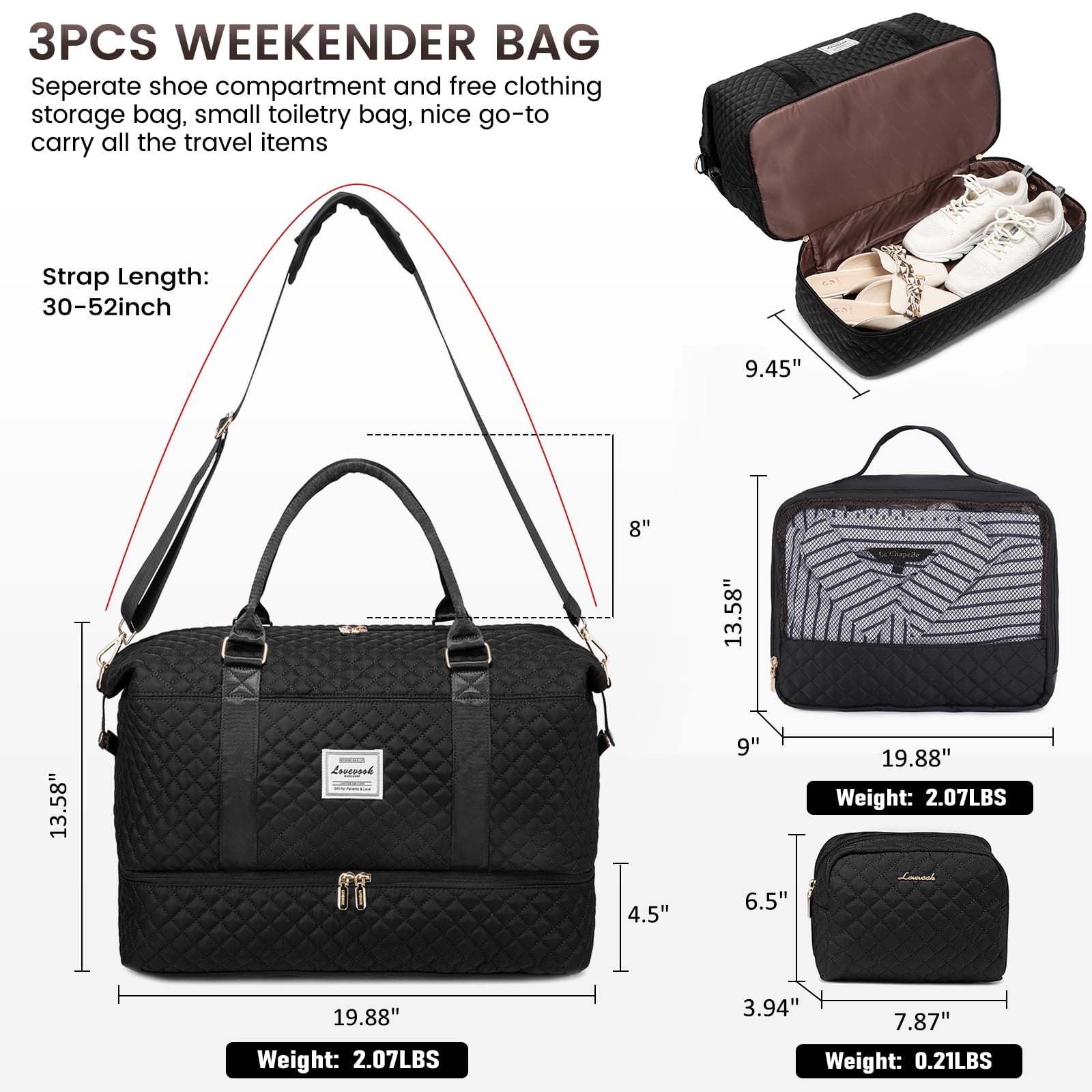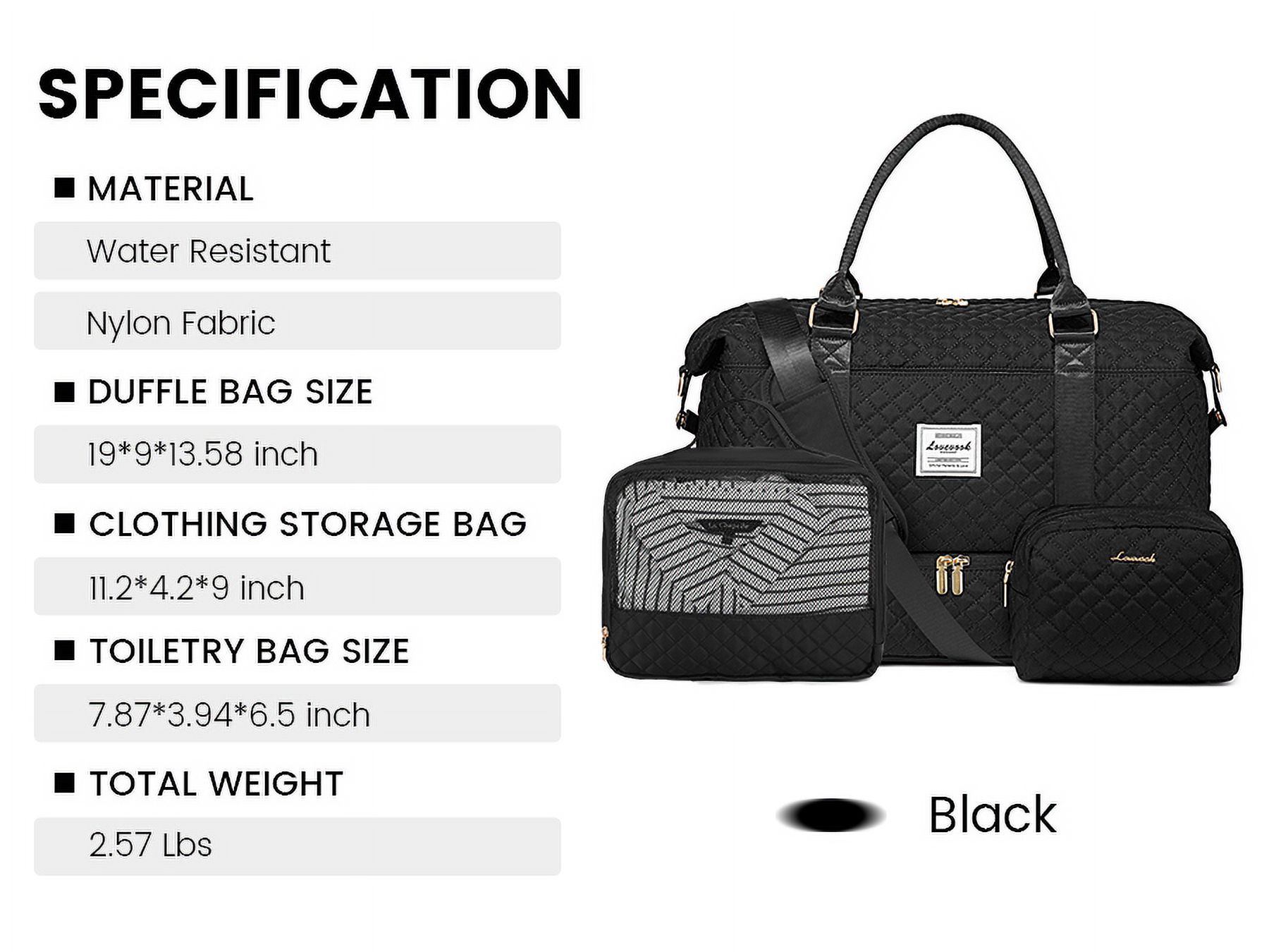 Lovevook Travel Bag- Make the life convenient and colorful ♥ Classy & Gorgeous appearance, fashion quilted design, Large capacity even fit in 3-5 days of daily essentials, multiple pockets provided in spacious main compartment to keep your personal items organized, one front pocket for easy access electronics or travel ticket, passport……This All-in-One travel duffle bag meet modern urban ladies greatest demand and fantasy on travel bag ♥ Separated toiletry bag, shoes compartment, dry/wet pocket provide convenience when want to use this bag as gym bag beach bag ♥ If you’re a novice mother, the bottom part is also perfect for storing diapers/wipes/diaper bag items, It can also be used as a hospital bag,mommy bag and medical bag Lovevook Duffle Bag Specification Material: Water Resistant Nylon Fabric Duffle bag size: 19″*9″*13.58″ Toiletry bag size: 7.87″*3.94″*6.5″ Total weight: 2.28lbs