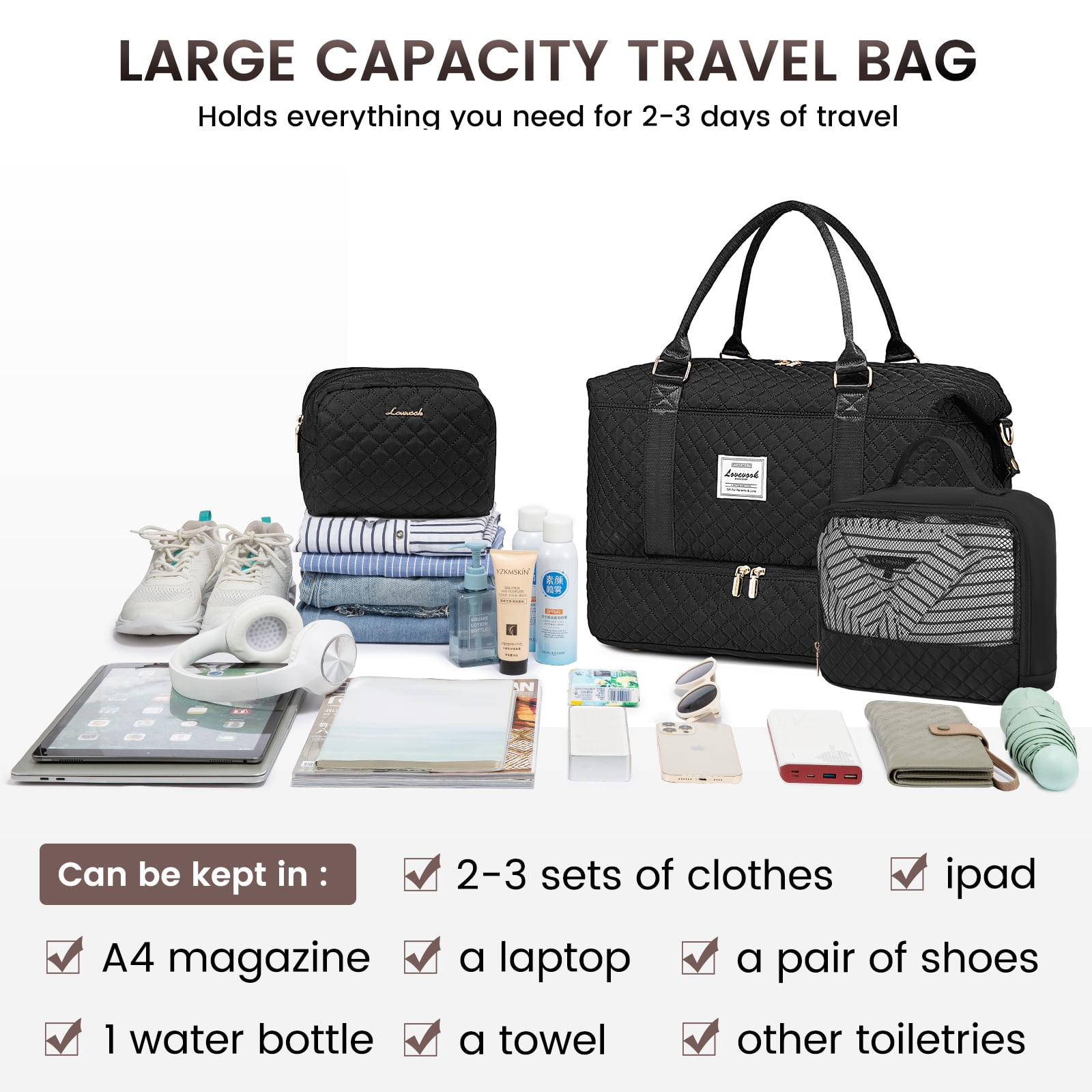 Practical Overnight Bag: Large capacity even fit in 3-5 days of daily essentials, comes with a $15 toiletry bag to store your cosmetics/toiletries, separated shoe compartment for store two pairs of shoes need in different occasion or dirty clothes couldnt wash timely in travel TSA Approved Carry-on Bag: Lovevook duffel bag for women meet most international airplanes carry-on requirements, fits in the overhead compartment as well as the under seat as personal Items in flight Gym Bag & Beach Bag: Dry/wet pocket used high-density waterproof material for store wet clothes, such as swimsuits, yoga clothes wet towel……specially suitable for beach, swimming, gym, tennis, camping Multipurpose & Durable Duffle Bag: Widely use as duffel bags for traveling, weekend bag for women, carry-on travel bag, mommy bag for hospital, gym bags, beach bag, yoga bag, overnight Bag, premium durable, also enjoy lovevook 90days no-worry shopping Ideal Gift Choice for Women: Widely use in camping, short-time family holiday, business trip, person road trip, ideal gift choice for women in Birthday, New Year, Christmas, Graduation