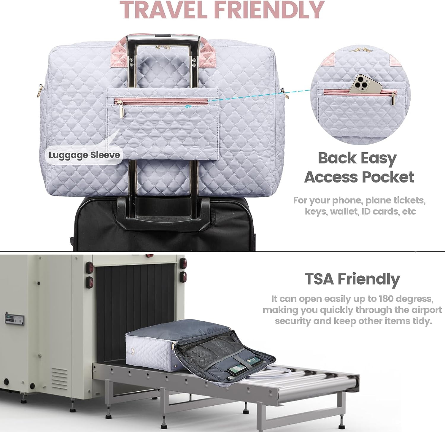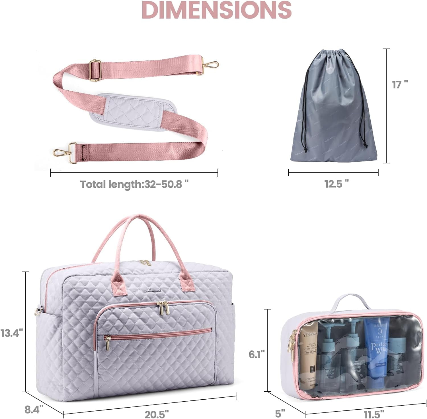 Lovevook Upgrade Travel Duffel Bag Set-Fashion Quilted Business Travel Bag, Carry-on Weekender Bag, Yoga Gym Beach Bag Hospital Overnight Bag ✿Brief Introduction Dimension: 20.5″L * 8.4″D * 13.4″H; Lightweight: 2.7 lbs; Volume: 37L; Primary Material: Water-resistant quilted nylon material ☀Lovevook Own Highlight Feature 1: Multi-compartment +Large capacity for great organization Feature 2: Dry/ Wet Separated Pocket, gifted one toiletry bag valued USD15 Feature 3: Add separate padded laptop compartment fit up to 17″ Laptop to protect your electronic devices safe Feature 4: Water-resistant quilted nylon material, durable & washable Feature 5: Simple and elegant appearance, excellent workmanship Feature 6: Widely use in many occasion, practical gift ideal for graduation, birthday, women’s Day, Mum Day, Christmas, Thanksgiving, New Year”