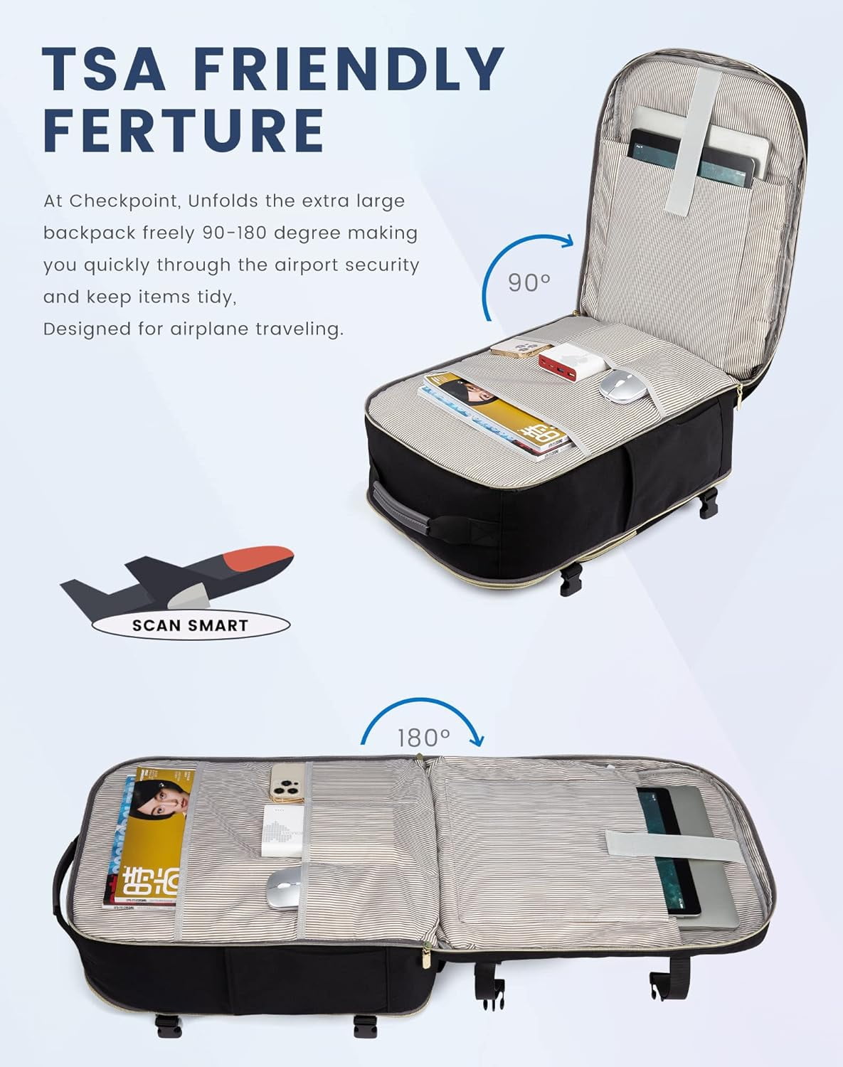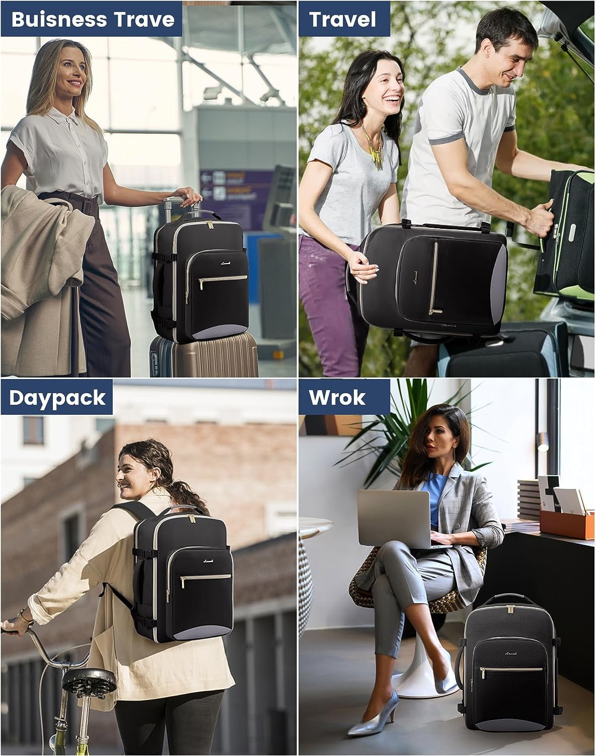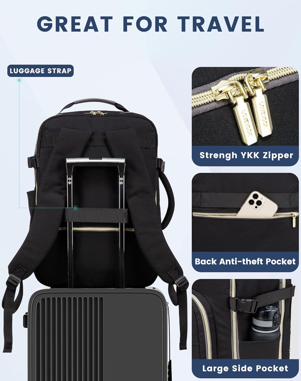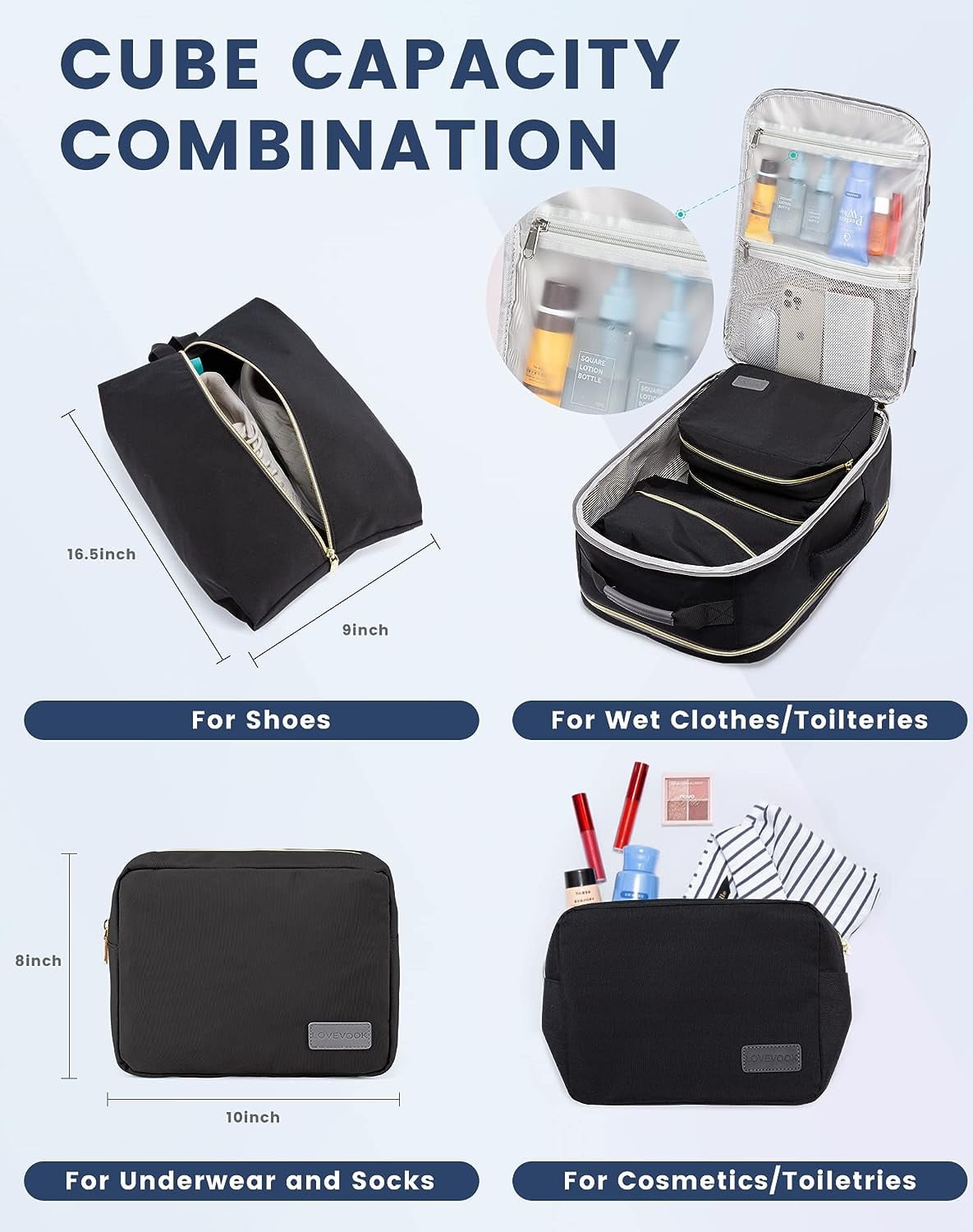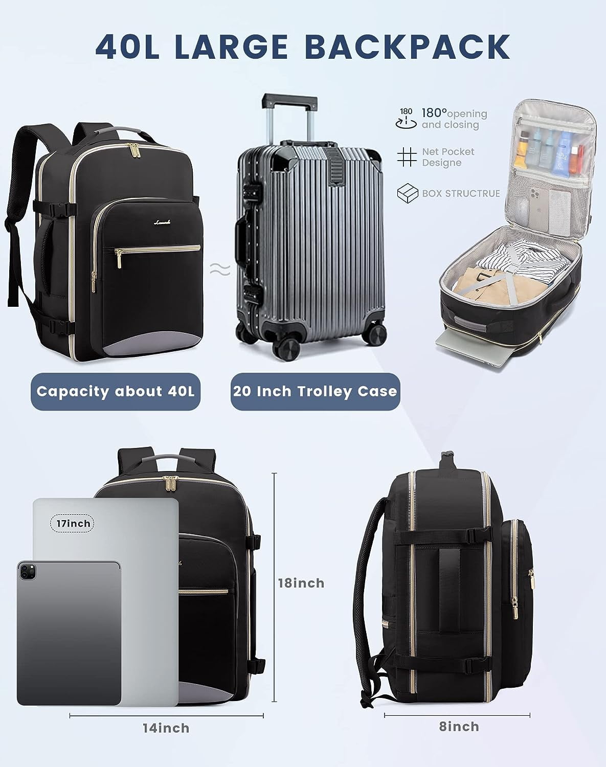 40L Travel Luggage Backpack- As Personal Item Travel Bag, Make Your Items Well Organized ❦ Lovevook large travel laptop backpack for women, has handles on the top and one side, easily used in daily work & daily life as backpack purses, duffel bag, shoulder bag, travel bag ❦ Large capacity with multiple pockets, 40L capacity, include front zipper pocket, front big compartment, backpack main compartment and separated 17″ laptop compartment padded with EVA foam, meet the travel needs of 3-5 days ❦ Attached 3 packing cubes for better packing shoes, cosmetics/toiletries and underwear and socks etc. ❦ Carry-on backpack, flight approved, waterproof materials, use strong metal double-way YKK zippers, upgraded reinforced stitching, more durable, high-thickness breathable sponge mesh design on the shoulder straps, reduce the pressure on the shoulders and feel more cooler when carrying great choice as weekender backpack, hiking, camping, plane trip, business backpack, college backpack, or casual daypack