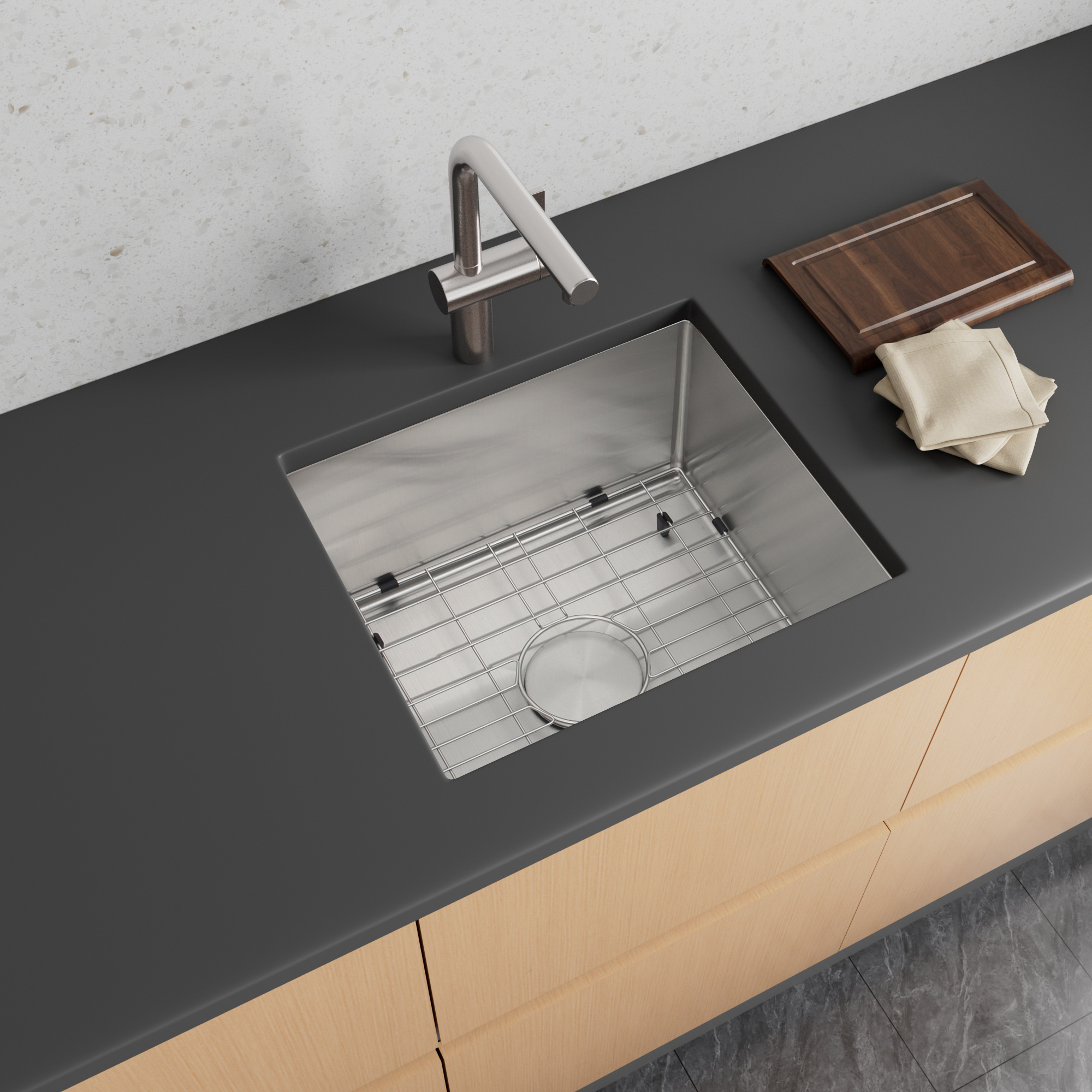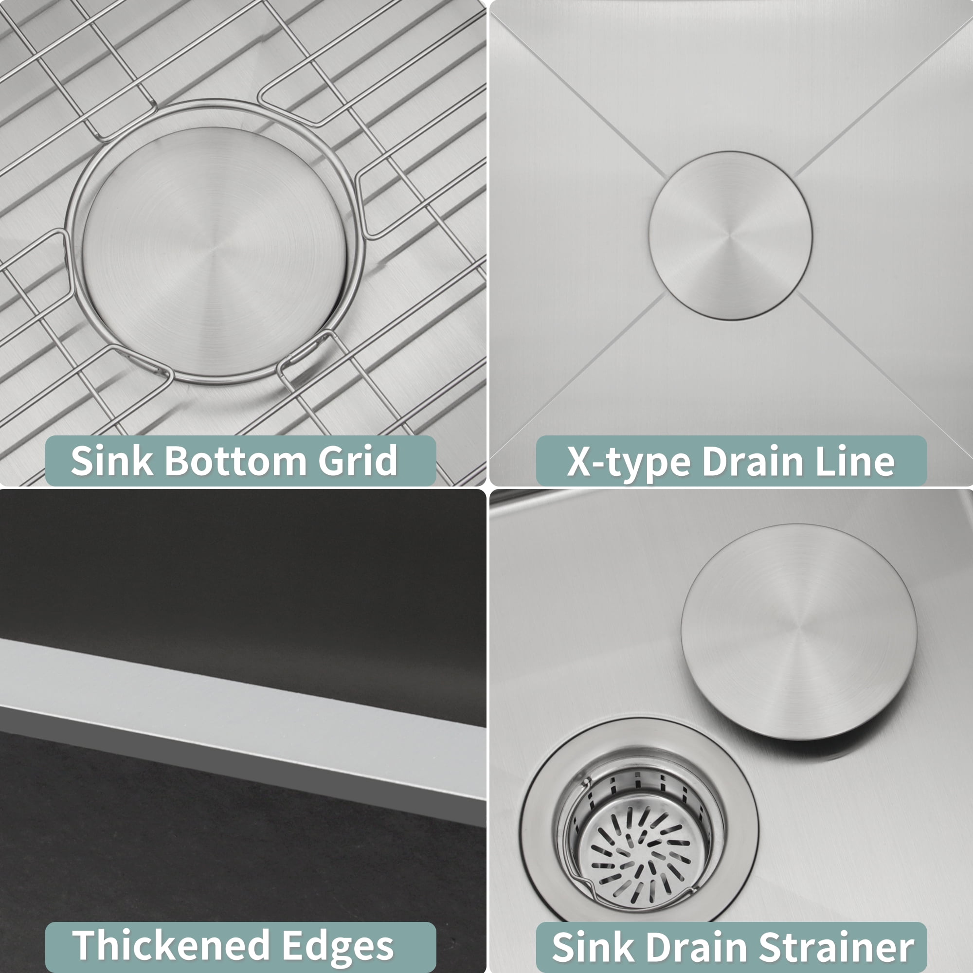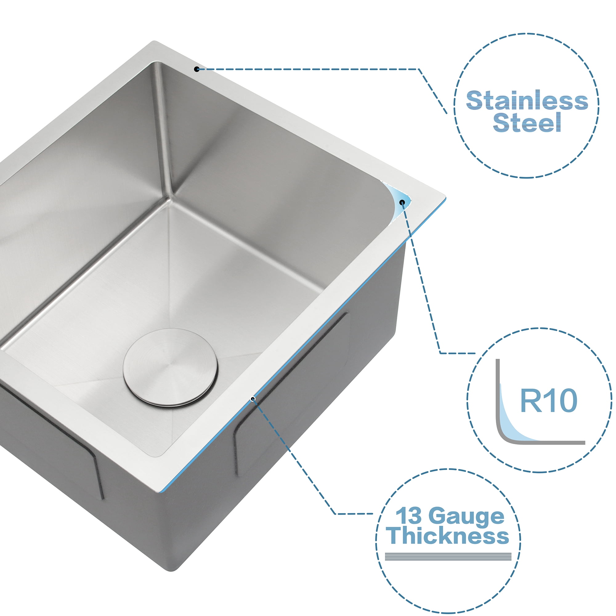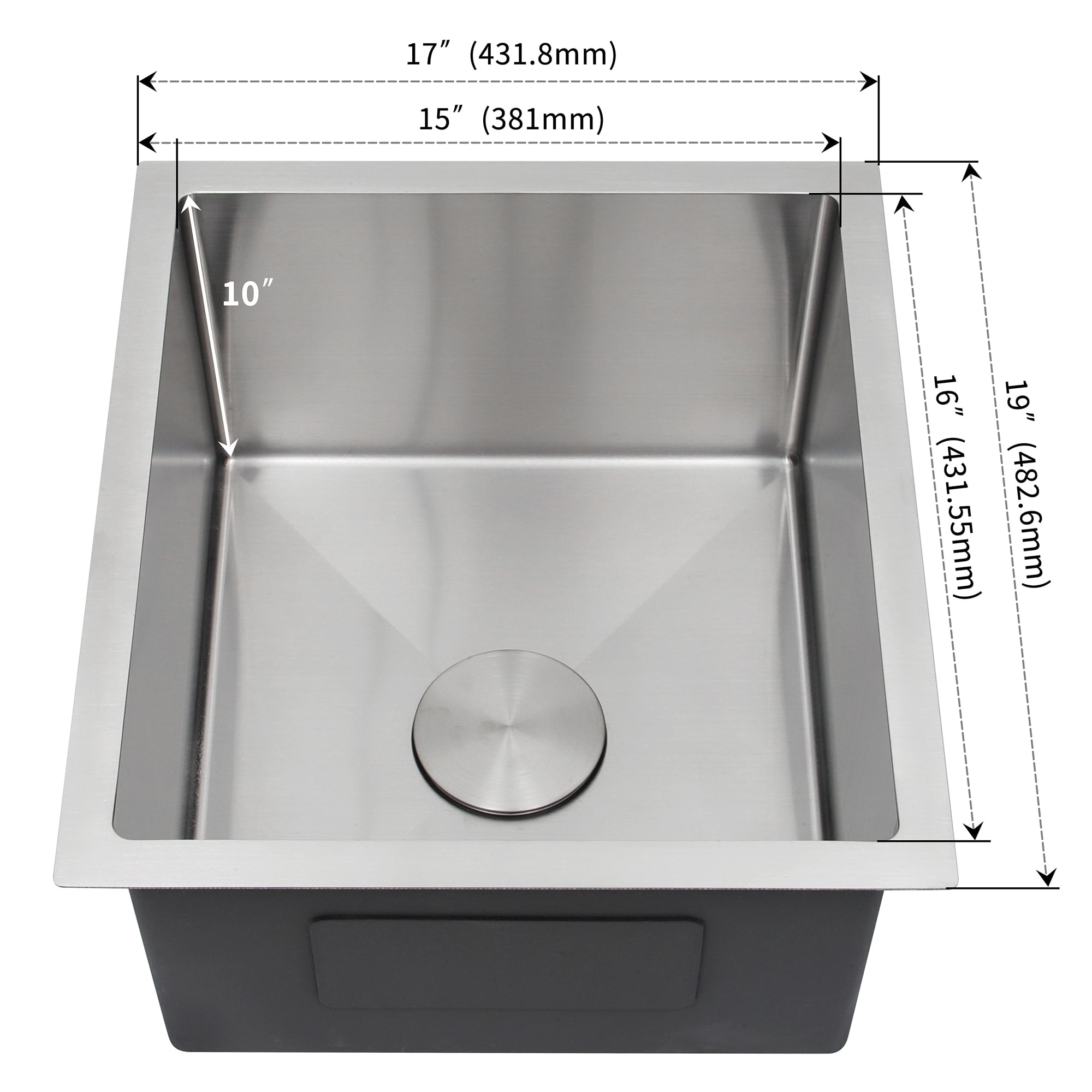 Dimension:Bar Sink Dimension: 17” x 19” x 10” (431.8mm x 482.6mm x 254mm) The installation of the undermount sink will not take up much space, easy to install, simple and practical. Made of high quality stainless steel, the edge of the sink is thickened with a thickness of 13 Gauge, which is durable and not easy to deform. Unique R10 rounded corner, easy to clean. X-shaped drain line provides fast drainage. Package Included: 1 Stainless Steel Kitchen Sink, 1 Sink Drain Strainer, 1 Sink Bottom Grid.