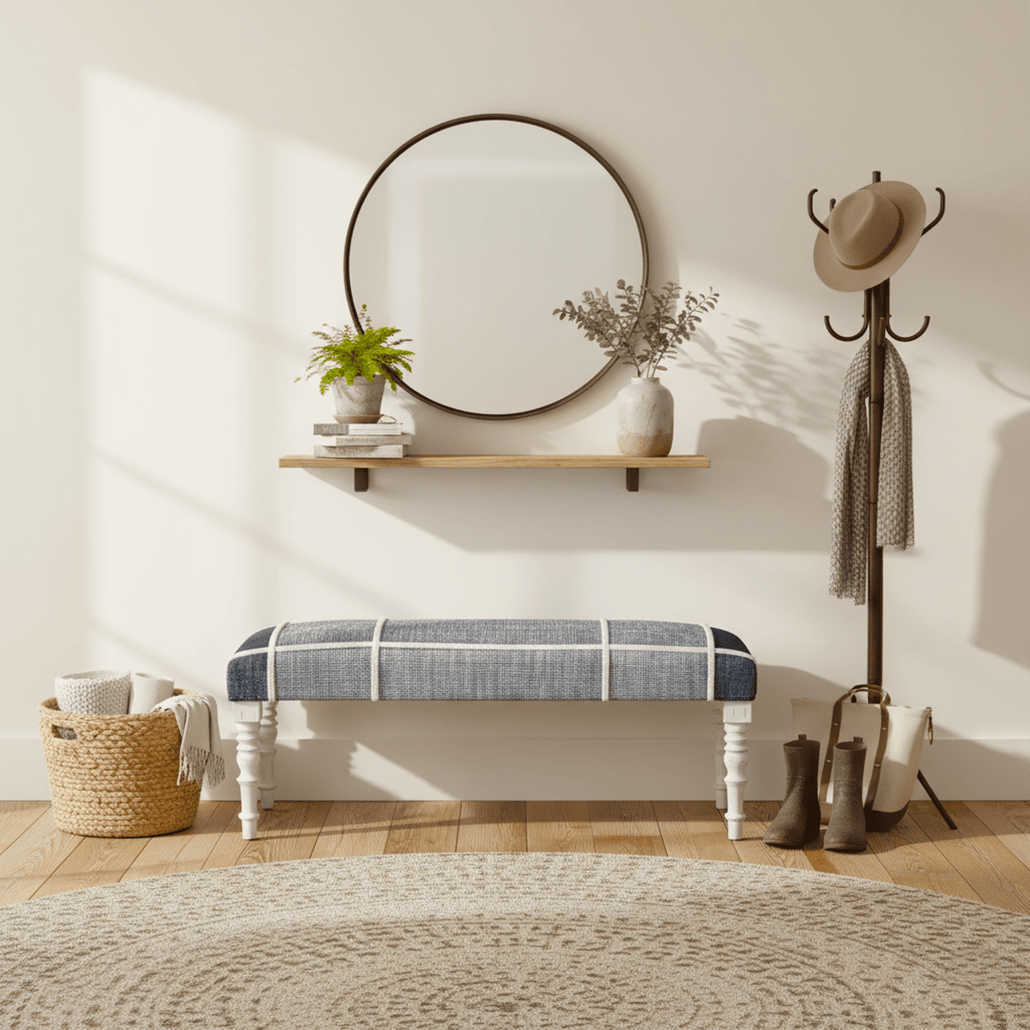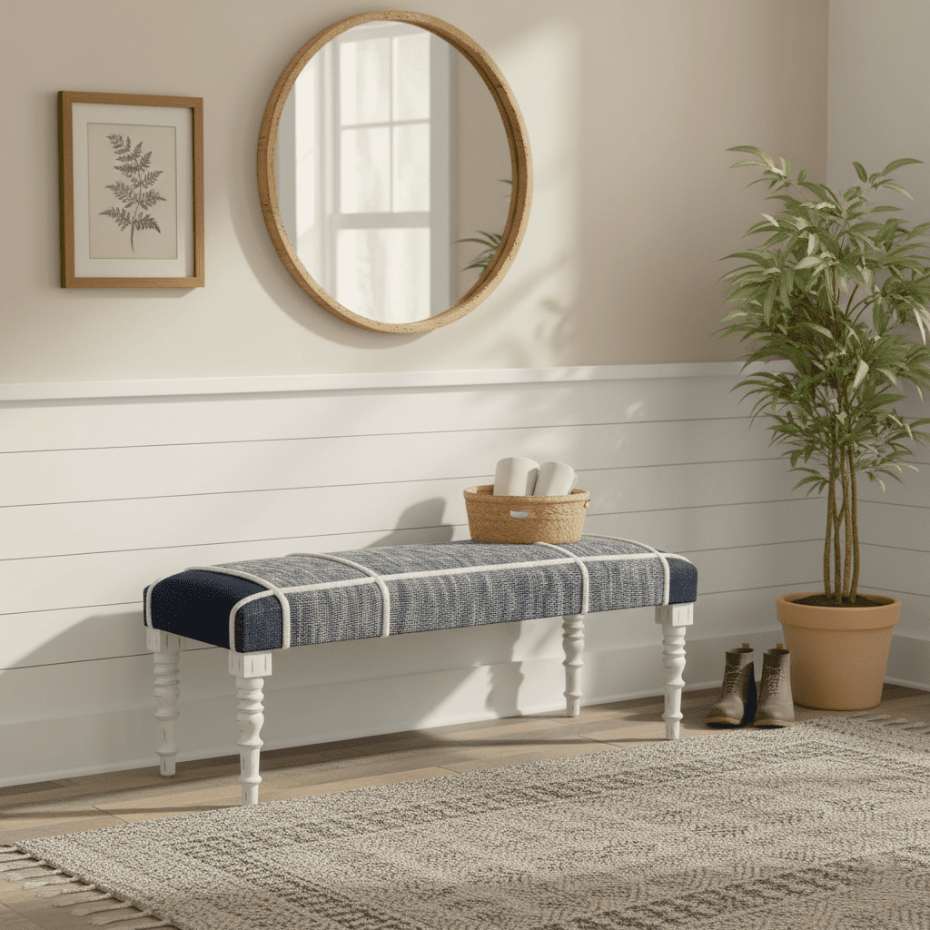Transform your space with the LR Home’s Plaid Upholstered Accent Bench in Blue/White. This accent bench features a deep blue and white plaid-inspired upholstery complemented by turned white legs. Sits at 47″ wide, 18″ high, and 16″ deep, perfectly sized for dorms, apartments, entryways, bedrooms, and hallways. Comfortably seats two with a maximum weight capacity of 300 pounds. This handmade piece features a cotton cushioned seat. Minimal assembly is required, all necessary tools and components are included.