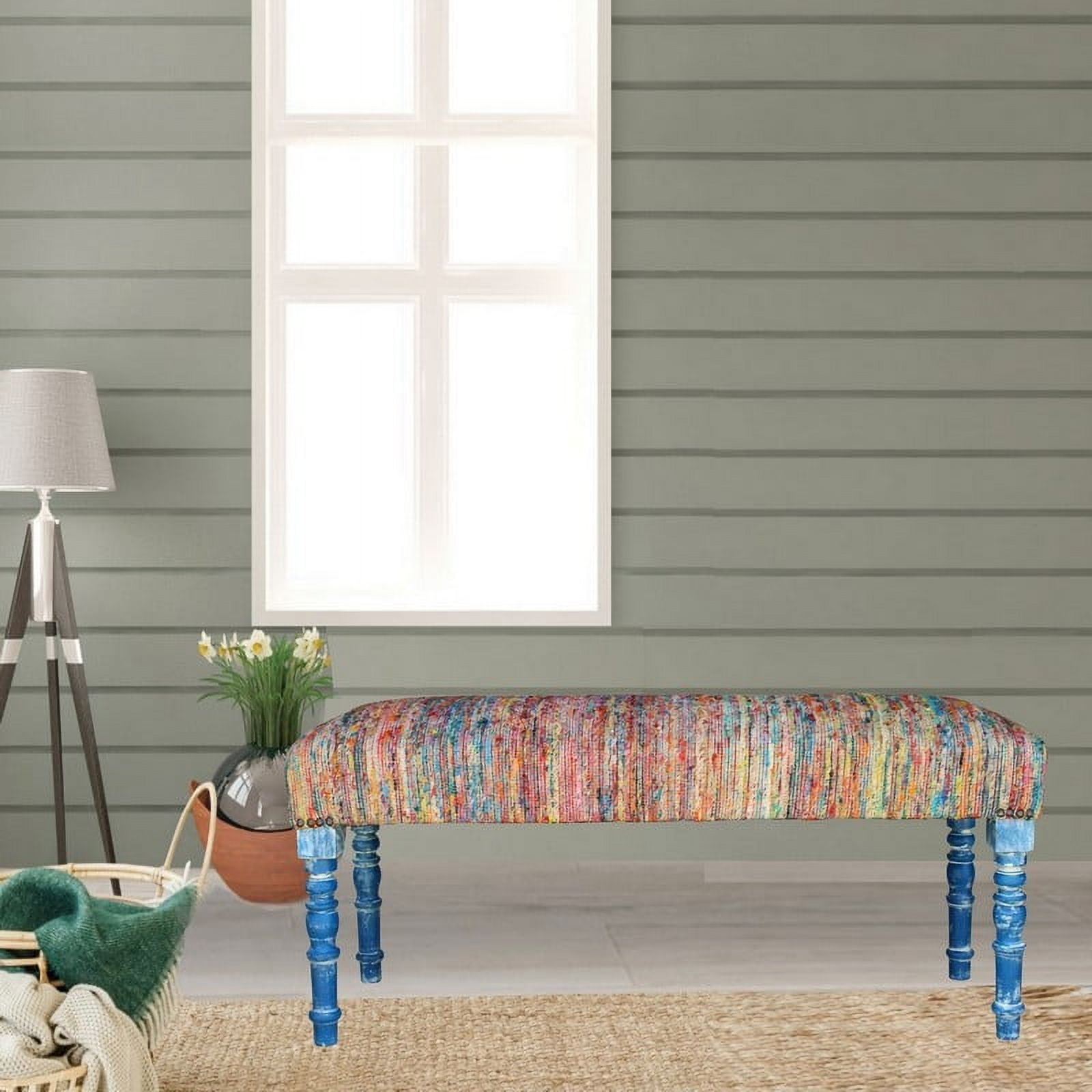 Transform your space with LR Home’s Nomad Upholstered Accent Bench in Rainbow. This entryway bench features a richly textured rainbow striped seat paired with bold turned blue legs, expertly crafted from 100% Acacia wood. Perfectly sized for dorms, apartments, entryways, bedrooms, and hallways. This handmade piece features a woven cotton cushioned seat. Minimal assembly required, all necessary tools and components included.