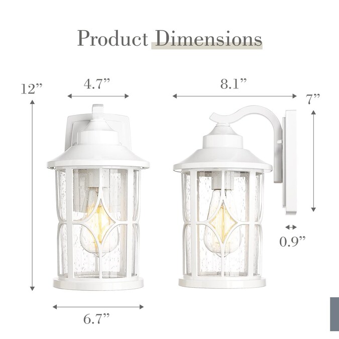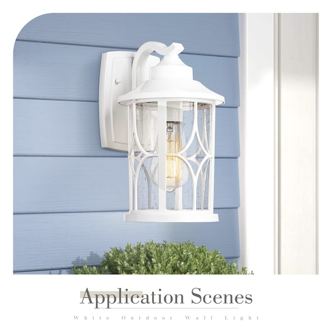 Featuring a modern lantern design, this outdoor wall lamp is made of die-cast aluminum in a white finish with a seeded glass shade. Waterproof and anti-rust, it was durable while adding a warm and unique atmosphere to your house.