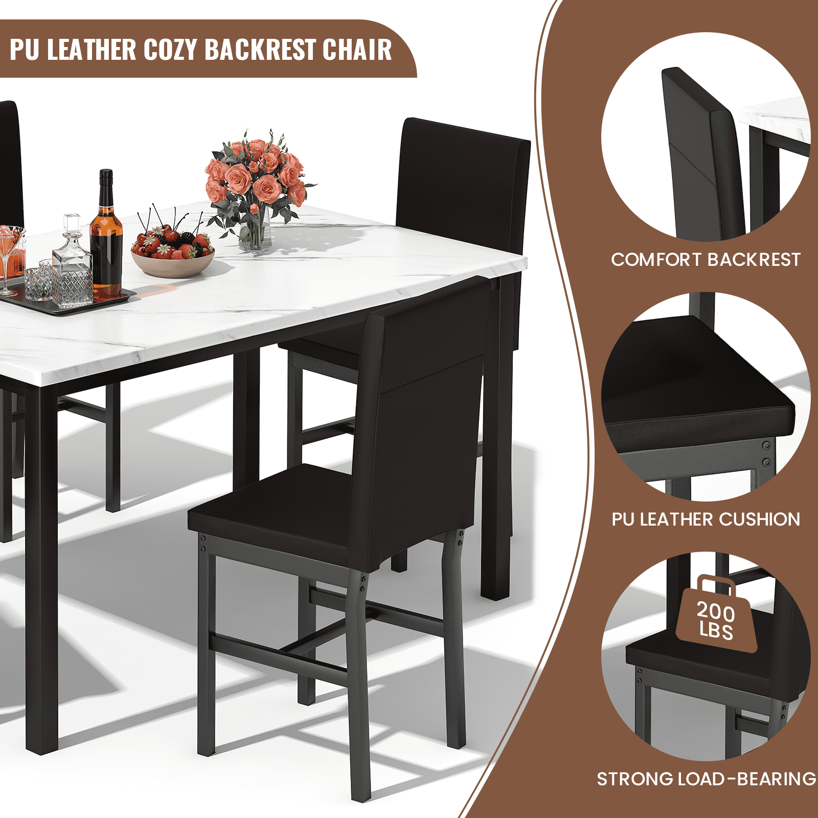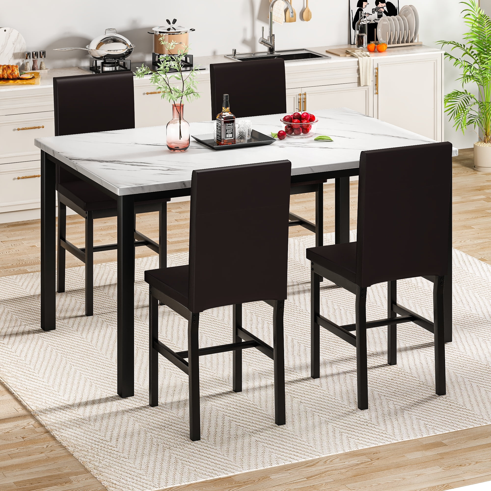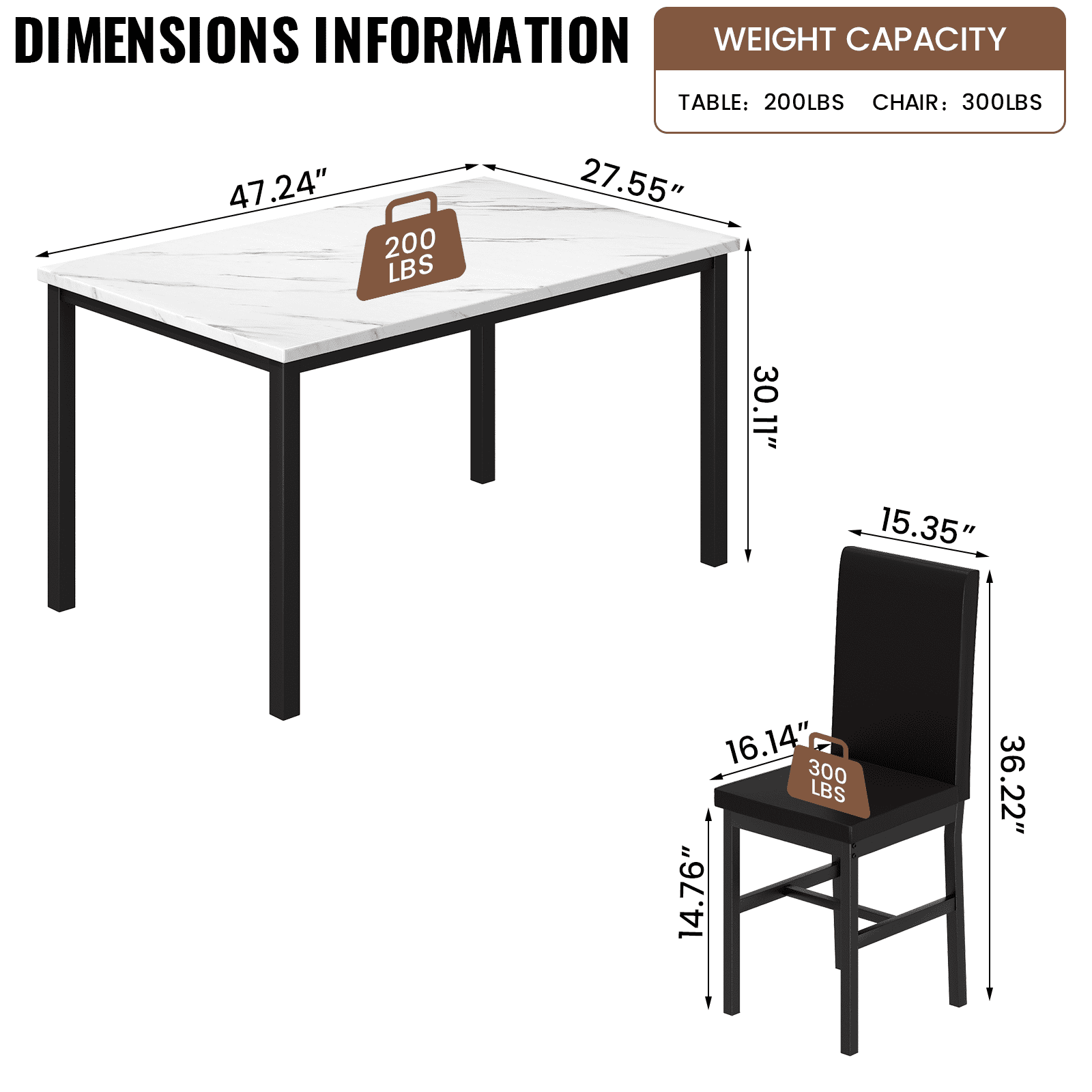 Dimensions and Versatility:Introducing the LTTROMAT 5 Piece Dining Set, tailored to accommodate 4 individuals. With its dimensions of 47.2″ L x 27.5″ W x 30.7″ H for the table and 14.9″ L x 14.9″ W x 35.8″ H for the chairs, this set fits seamlessly into various dining spaces, from compact apartments to spacious homes. Aesthetic Elegance:Crafted with a keen eye for design, this dining table sets for 4 exudes sophistication with its marble-top table and PU leather padded chairs in a rich brown hue. Its sleek aesthetic effortlessly complements modern interior décor, elevating the ambiance of any dining area. Quality Construction:Built to withstand the test of time, the LTTROMAT dining set features a sturdy metal frame that resists rusting, ensuring long-lasting durability. The faux marble tabletop and padded PU leather chairs not only enhance its visual appeal but also guarantee comfort and quality craftsmanship. Space-Saving Design and Versatility:Designed with practicality in mind, the compact layout of the square dinette sets makes it an ideal choice for small dining areas or cozy nooks. After meals, the chairs conveniently slide beneath the table, maximizing space efficiency without sacrificing style or comfort. Effortless Assembly and Support:Assembly is a breeze with clear, concise instructions provided, requiring only approximately 1.5 hours for setup. Additionally, our dedicated after-sales support team is available to address any inquiries or concerns, ensuring a seamless experience from purchase to enjoyment of your new dining set.