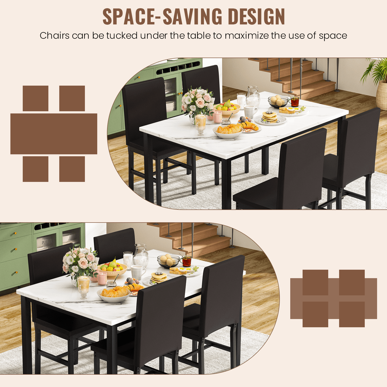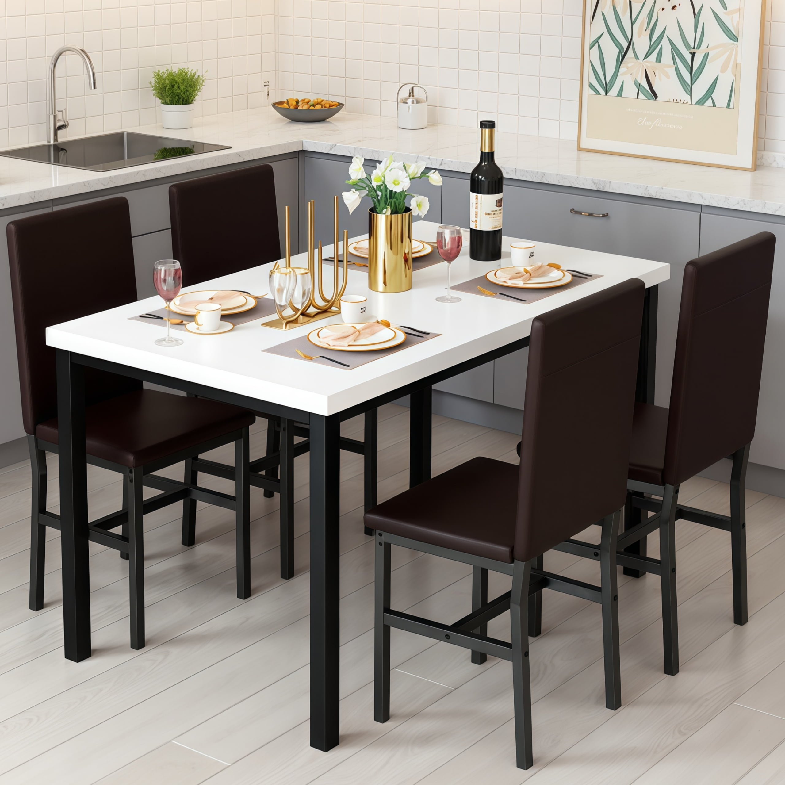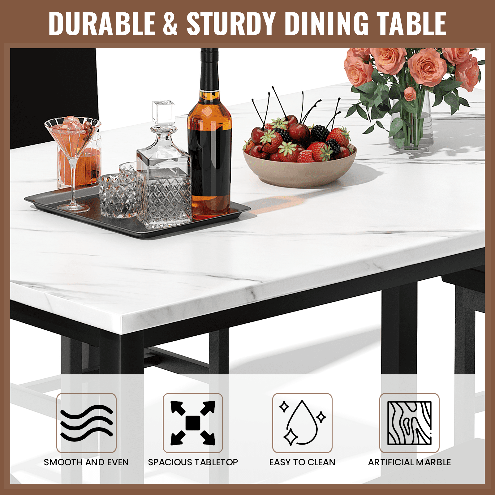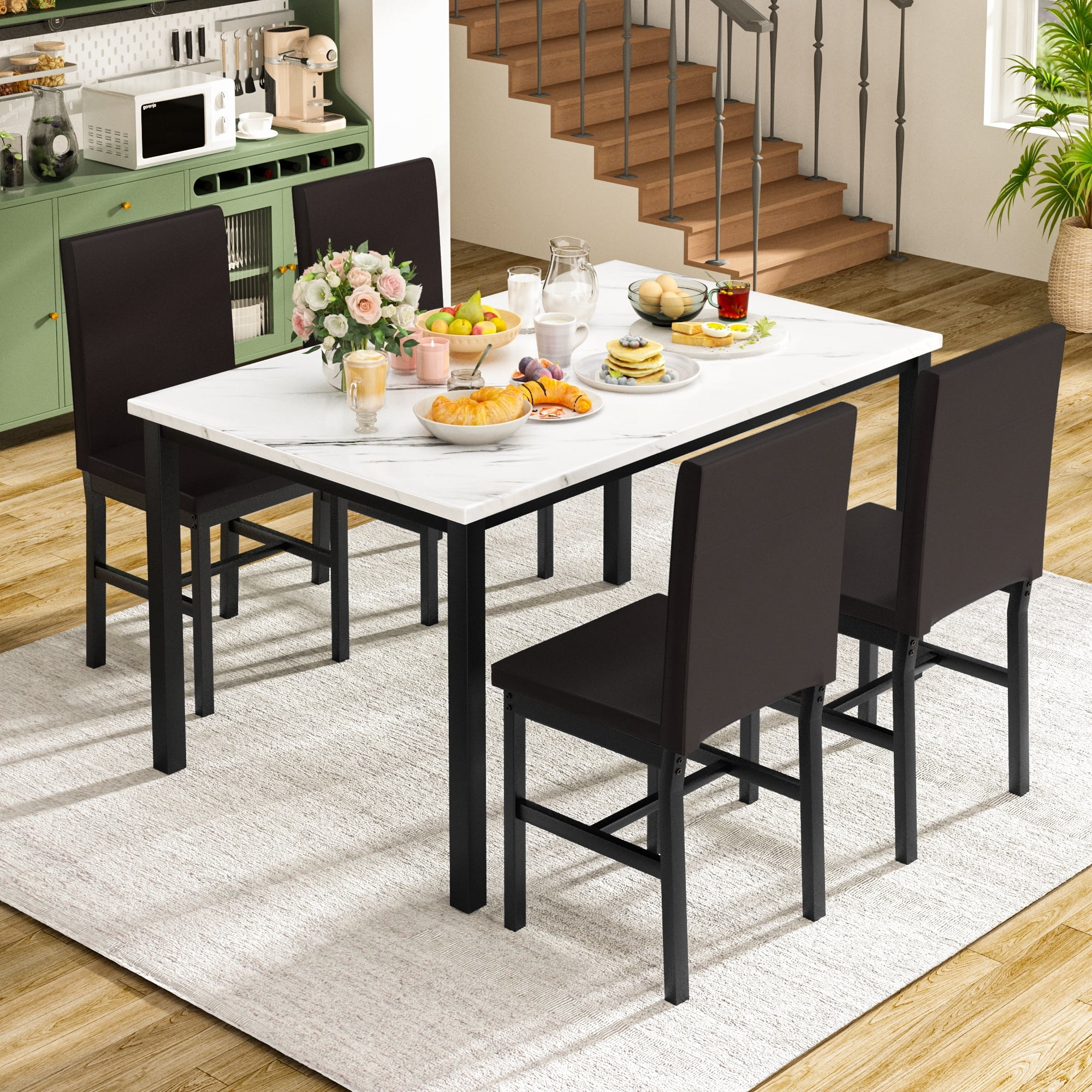 Dimensions and Versatility:Introducing the LTTROMAT 5 Piece Dining Set, tailored to accommodate 4 individuals. With its dimensions of 47.2″ L x 27.5″ W x 30.7″ H for the table and 14.9″ L x 14.9″ W x 35.8″ H for the chairs, this set fits seamlessly into various dining spaces, from compact apartments to spacious homes. Aesthetic Elegance:Crafted with a keen eye for design, this dining table sets for 4 exudes sophistication with its marble-top table and PU leather padded chairs in a rich brown hue. Its sleek aesthetic effortlessly complements modern interior décor, elevating the ambiance of any dining area. Quality Construction:Built to withstand the test of time, the LTTROMAT dining set features a sturdy metal frame that resists rusting, ensuring long-lasting durability. The faux marble tabletop and padded PU leather chairs not only enhance its visual appeal but also guarantee comfort and quality craftsmanship. Space-Saving Design and Versatility:Designed with practicality in mind, the compact layout of the square dinette sets makes it an ideal choice for small dining areas or cozy nooks. After meals, the chairs conveniently slide beneath the table, maximizing space efficiency without sacrificing style or comfort. Effortless Assembly and Support:Assembly is a breeze with clear, concise instructions provided, requiring only approximately 1.5 hours for setup. Additionally, our dedicated after-sales support team is available to address any inquiries or concerns, ensuring a seamless experience from purchase to enjoyment of your new dining set.