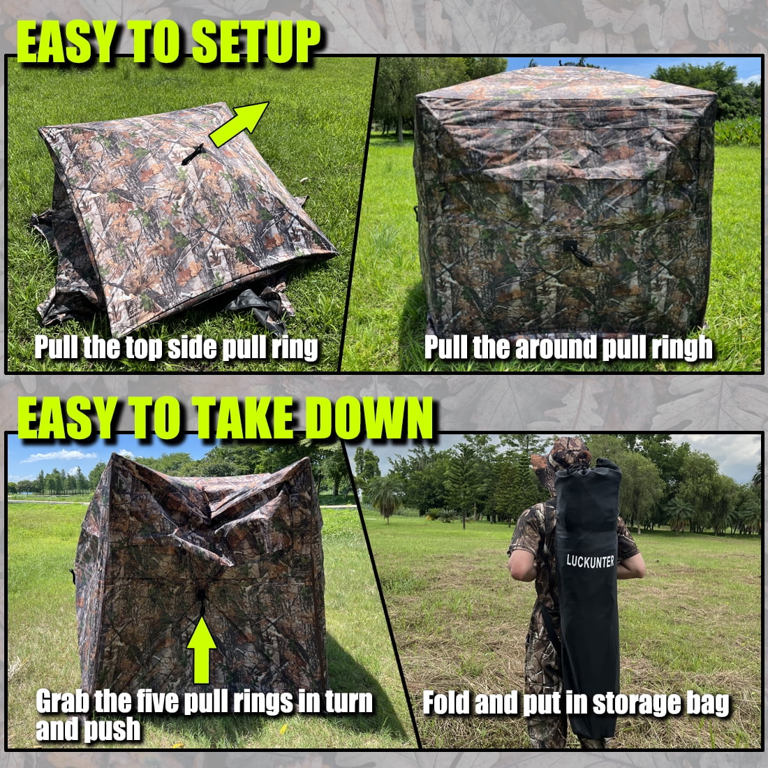 【Easy to Use】 It is built of hub system, which makes setup/take down very easy.With a little practice setting the blind up can be accomplished quickly. And it comes with a portable carry bag, tie down stakes (8 pieces) and high wind ropes (4 pieces), which help you take it everywhere easily.