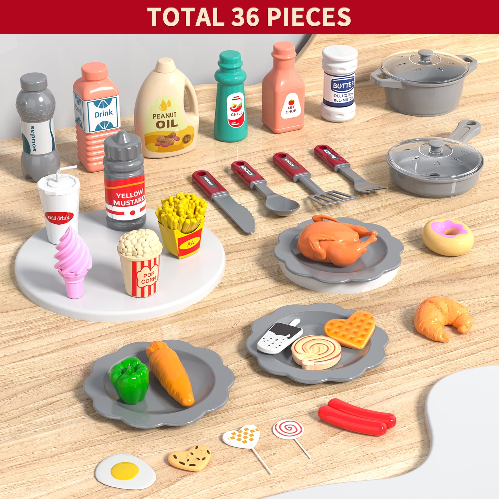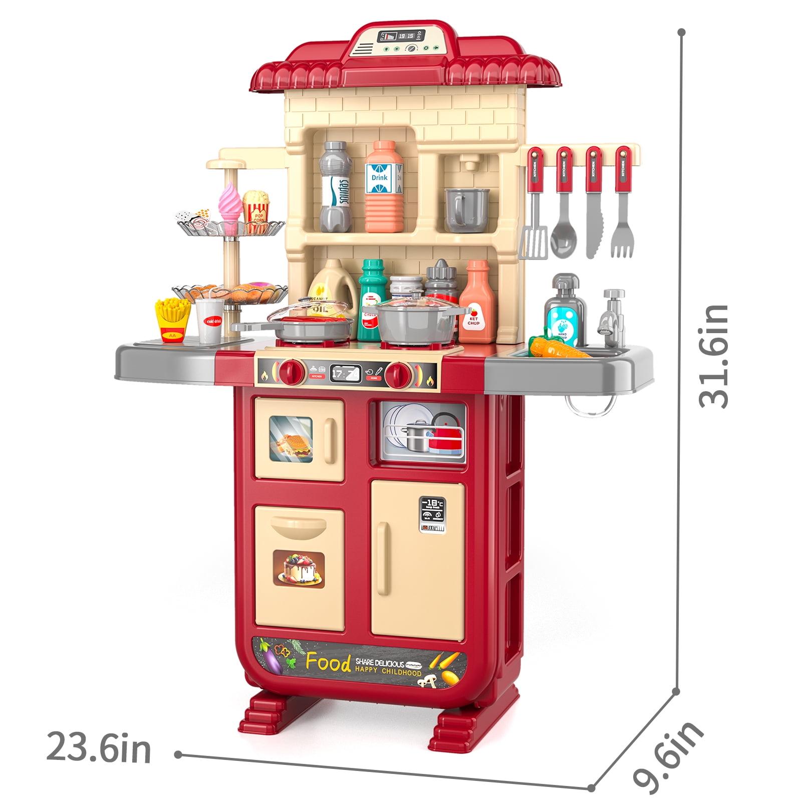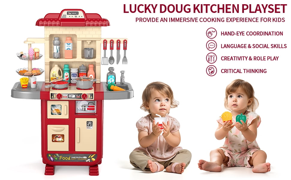 Lucky Doug Big Kitchen Playset & Rich Accessories with Light & Sound & Spray, Play Kitchen Toys for Toddlers Girls Ages 3-5-8. Lucky Doug kids kitchen playset includes realistic play stove, sink, oven, refrigerator and so on. Toy kitchen sets come with total 36 pieces various realistic foods toys and kitchen accessories. Play kitchen allowing kids to fully use their imagination and creativity! Toy kitchen set size is 31.6″×23.6″×9.6″.